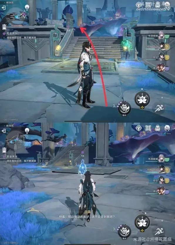使用蜃影迴響,跟著箭頭走,避開敵人,靠近第二個持明蜃影,進入劇情