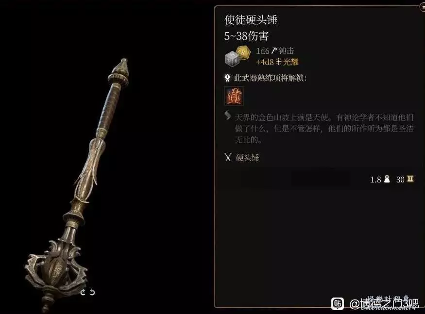 面板很恐怖的武器,獲取方式1是從六環的召喚異界生物的使徒變體身上扣下來,或是用牧師只能用一次的神賜技能選賜予武器給一把,建議雇傭兵或者讓希望給你拿一把。