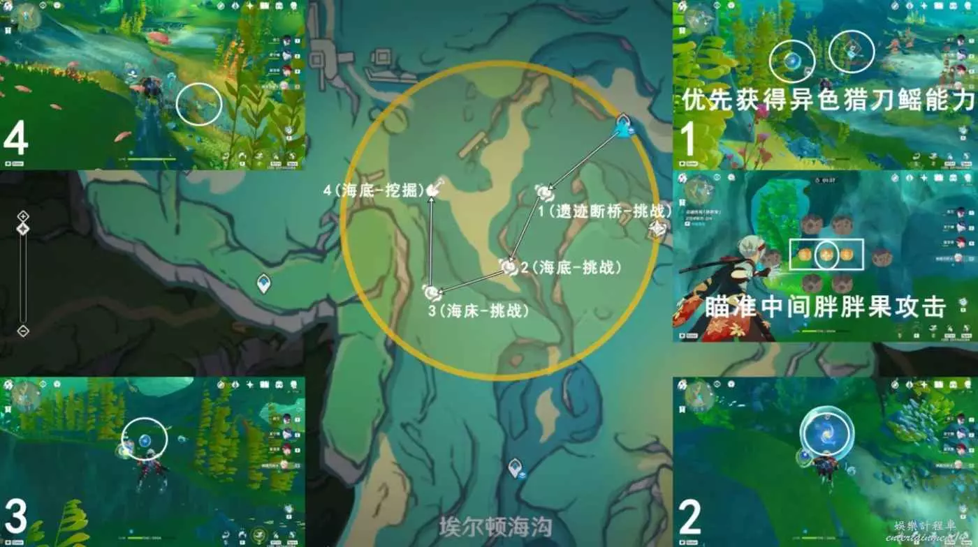 1(遺跡斷橋-挑戰):獲得異色獵刀鰩能力,擊破4輪胖胖果(注意瞄準中間的胖胖果攻擊);