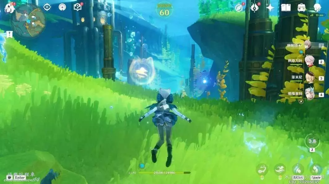 視角右轉,朝小地圖正東方向遊去,可以看到被泡泡包裹的藍色旋渦。