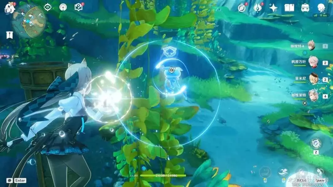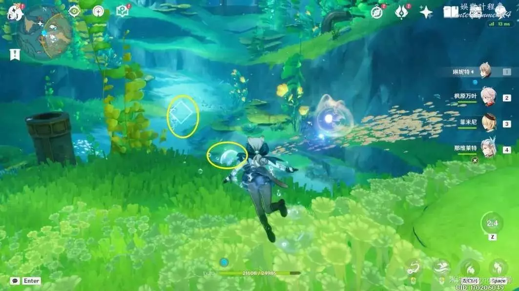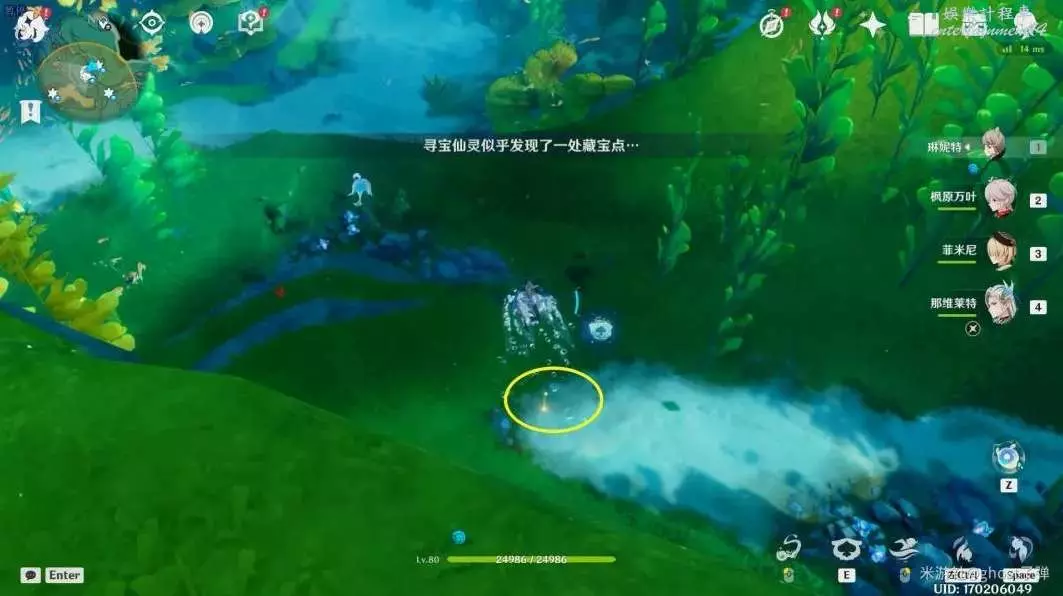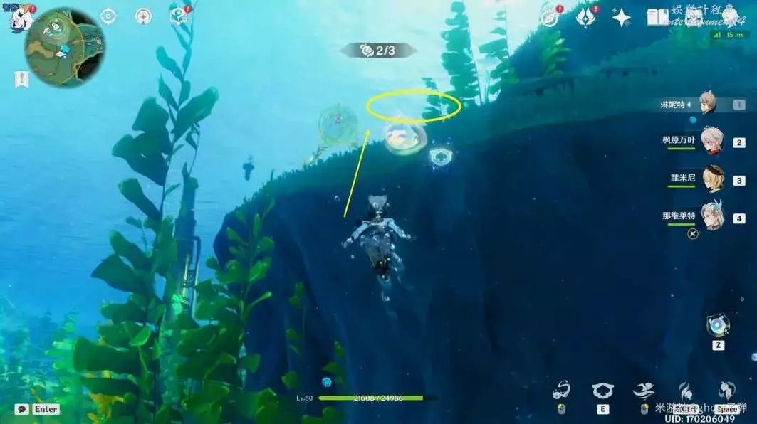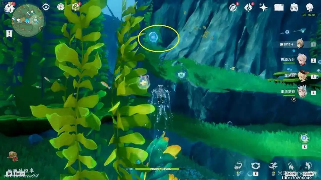 朝小地圖正東方向遊去,路過水草,可以看到被泡泡包裹的藍色旋渦。