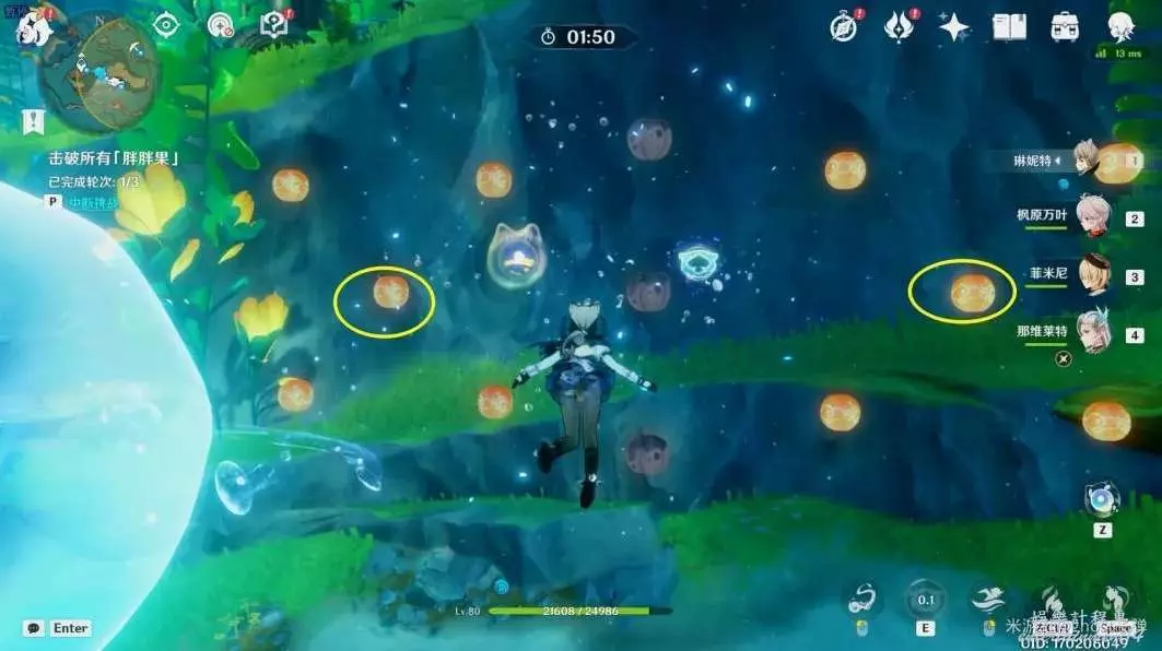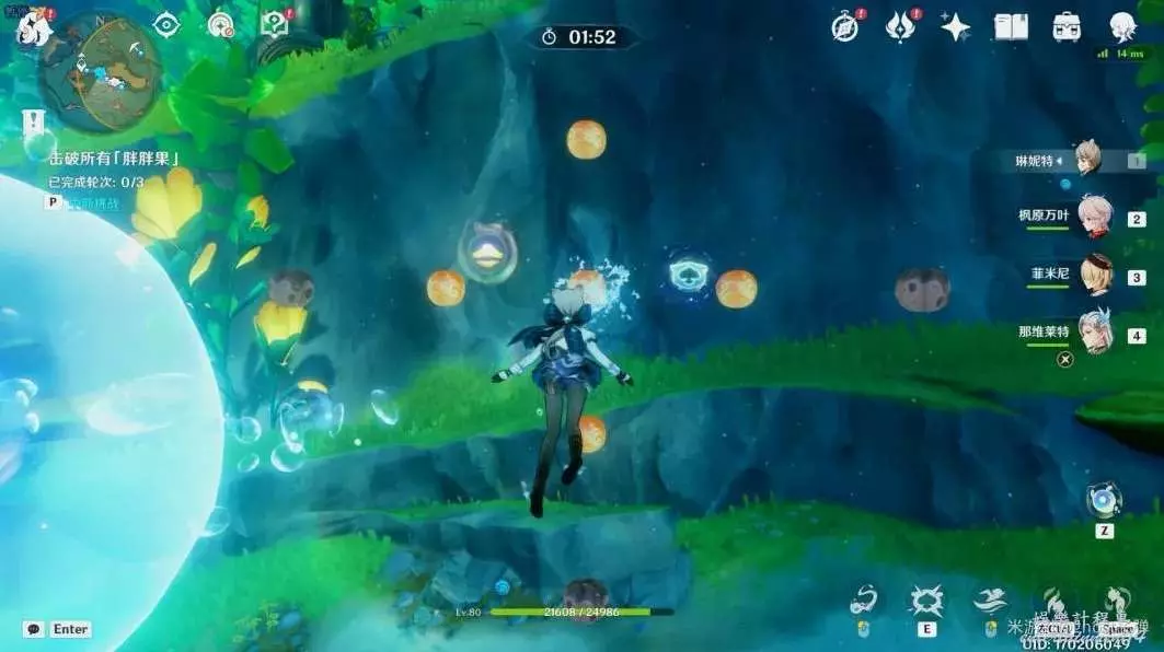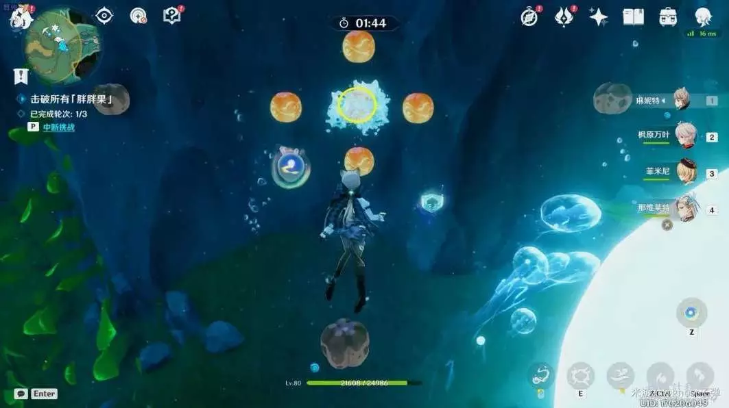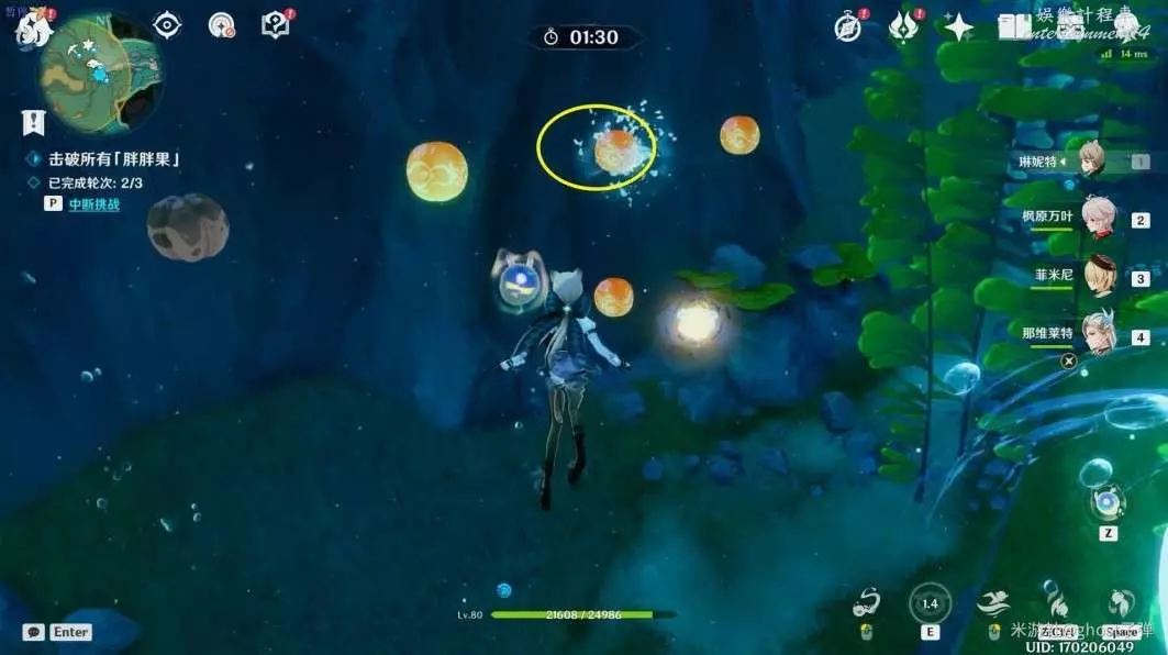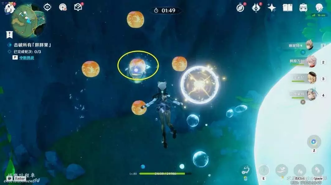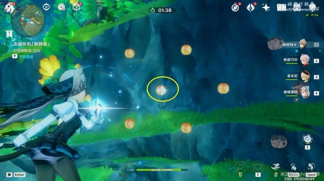 開啟挑戰,一共有3個波次的胖胖果需要擊破,目標選擇中間的胖胖果,長按E技能,到位置後再引爆,3個波次都這樣。