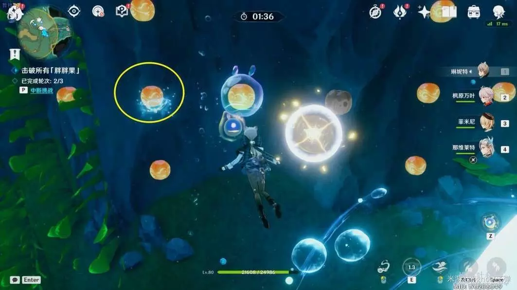 開啟挑戰,一共有3個波次的胖胖果需要擊破,目標選擇中間的胖胖果,【長按E,再引爆】技能攻擊,3個波次都這樣。