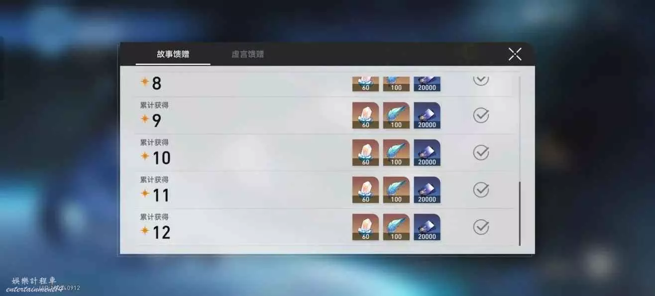 3.混沌敘事拿滿獎勵總計720星穹 每關最多能拿3顆星 總計4關 3*4=12顆星