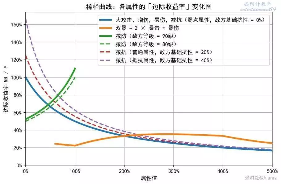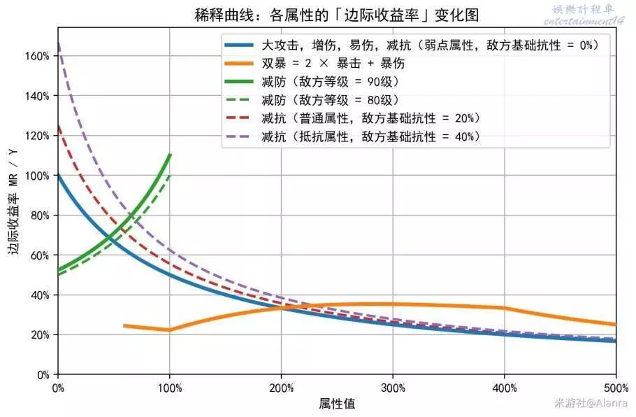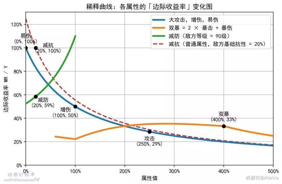 3.稀釋:邊際收益率遞減,隨著屬性的增加,每增加1單位帶來的「傷害變動百分比」不斷下降。