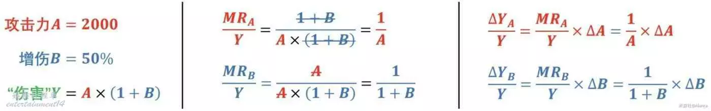 正如上文所述,「稀釋」現象,其實就是研究各屬性的邊際收益率。由於與該屬性無關的乘區是一個常數,因此在求邊際收益率的時候,分子分母相消,只需要聚焦於該屬性影響的乘區即可。下文將分析各個屬性的邊際收益率。
