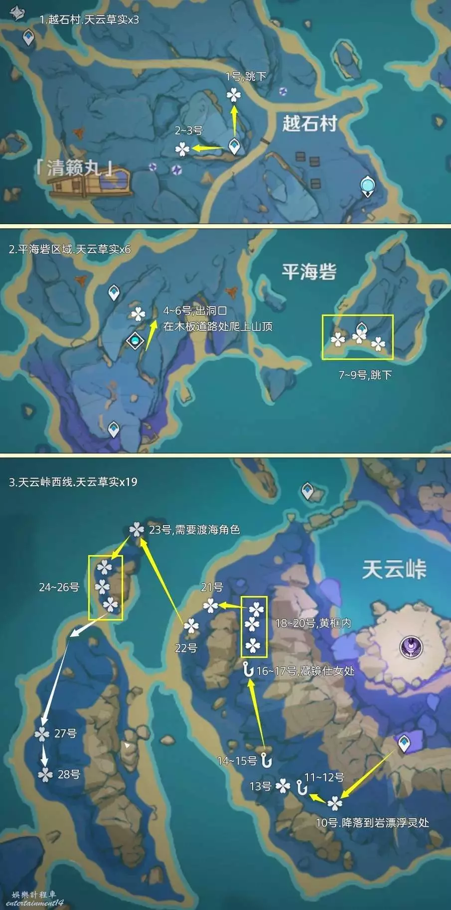 天雲草實點位僅分佈在稻妻地區清籟島,其中可採集數量為95株,每株有2個天雲草實,總共190個;製作路線時儘量遵循從上往下游,視野高好看清,方便旅行者探索