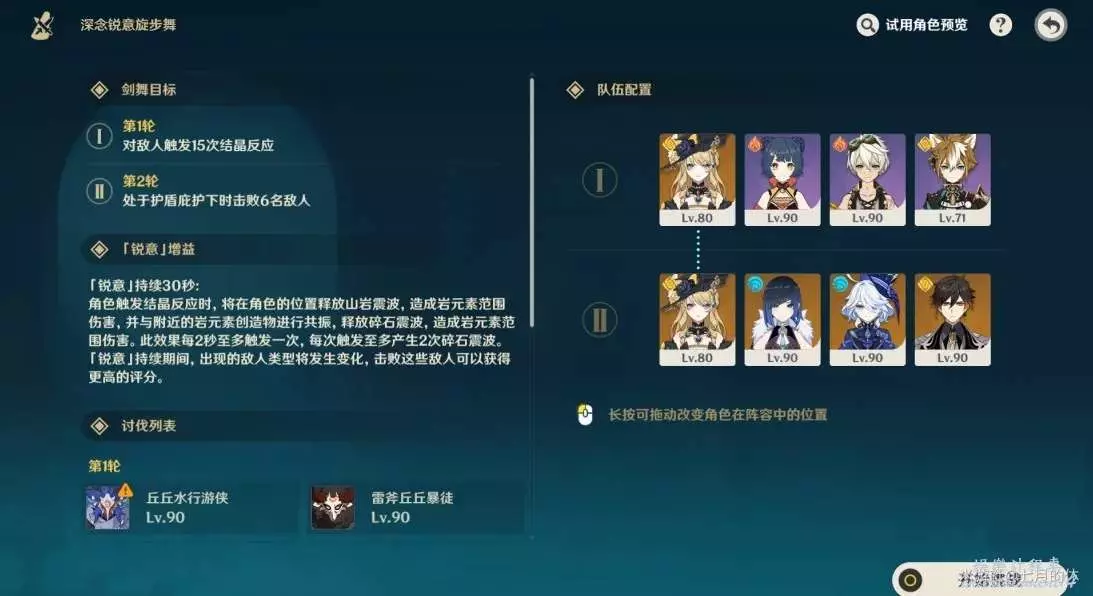 建議第一輪帶雙岩和後台掛水/火/雷冰元素的角色,單娜維婭情況下,這個劍舞目標觸發比較慢。