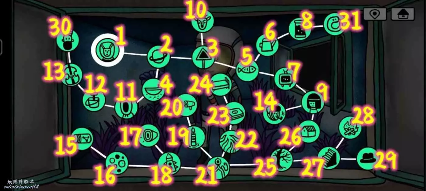 27.觀察左側雕像,有綠色痕跡,將綠色光球放到雕像上,出現通往28的門,觀察雕像破碎後出現的塗鴉,〔太陽1個,月亮3個,星球1個,眼睛2個,星星4個〕,點擊右側門,滑動滑塊到對應數字〔13124〕,打開通往28的門
