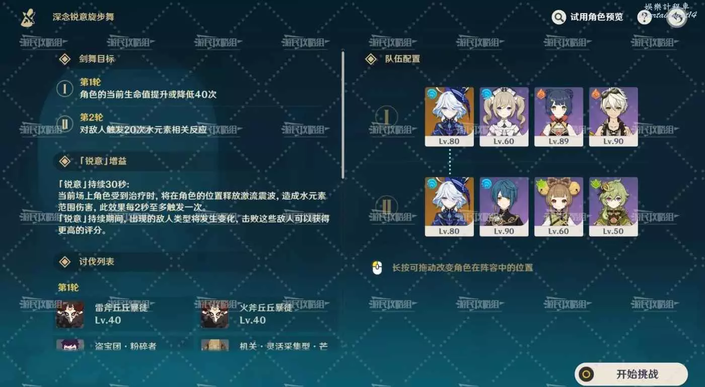 第一關積分倍率選擇1倍。下方列出三種低配隊伍,搭配思路都比較類似,請各位根據自己的角色池來調整和替換。共通位選擇試用的芙寧娜,第一輪芙甯娜戰技扣血很容易觸發劍舞目標,建議額外搭配一名治療角色,例如早柚、班尼特等。輸出位選擇香菱,與芙寧娜搭配打蒸發。第二輪為了達成劍舞目標加入行秋或芭芭拉,其他位置依然是相同的搭配思路,各個位置均可以按照自己的角色池來選擇替換,基本哪裡亮了點哪裡,點完切人繼續迴圈即可。