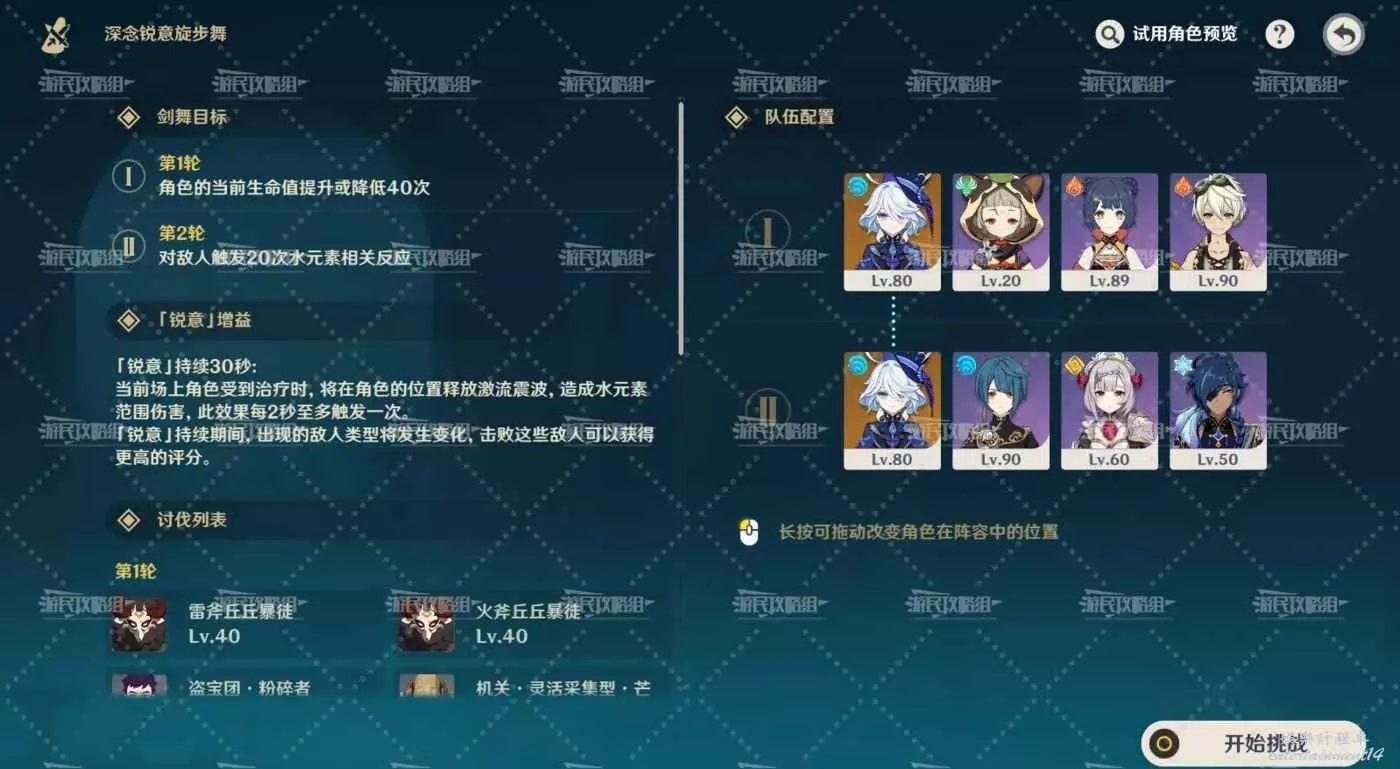「銳意」持續30秒:當前場上角色受到治療時,將在角色的位置釋放激流震波,造成水元素範圍傷害,此效果每2秒至多觸發一次。「銳意」持續期間,出現的敵人類型將發生變化,擊敗這些敵人可以獲得更高的評分。