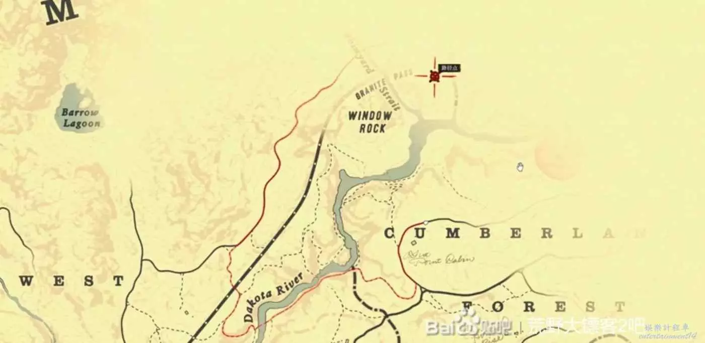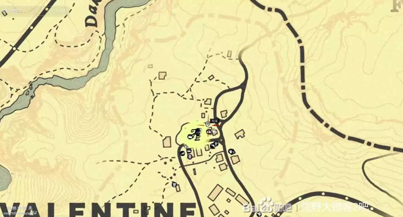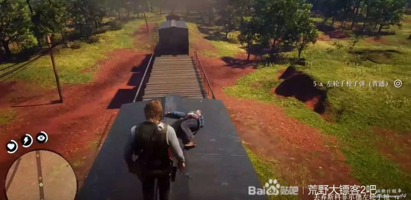 接下來給他拍張照,這個任務就算完成了,在大鏢客2中,只要你撿過的武器,都會永久保留在馬鞍上,接下來就是去拿另外五根金條了,到郵局坐火車前往瓦倫丁,抵達瓦倫丁後打開地圖,因為這個時候北邊的迷霧基本上都是還沒有開的,就把導航設在這裡,如下圖所示。在到達位置之後,會發現兩三節破車廂,首先進到地上這個車廂,左邊會有一個箱子,打開之後會有珠寶袋和親錢袋,然後出來之後,從兩個鐵的中間穿過去,沿著山道一路走上去,在穿過一個生銹的底盤之後,往左邊看,會有一個可以上去的牆壁,按跳躍鍵爬上去,然後再一次爬上去,在上去之後拉開一段距離,轉身按shift加速到邊上,立馬在按一下跳躍鍵,往前繼續加速,按跳躍,就進到有金條的車廂了。