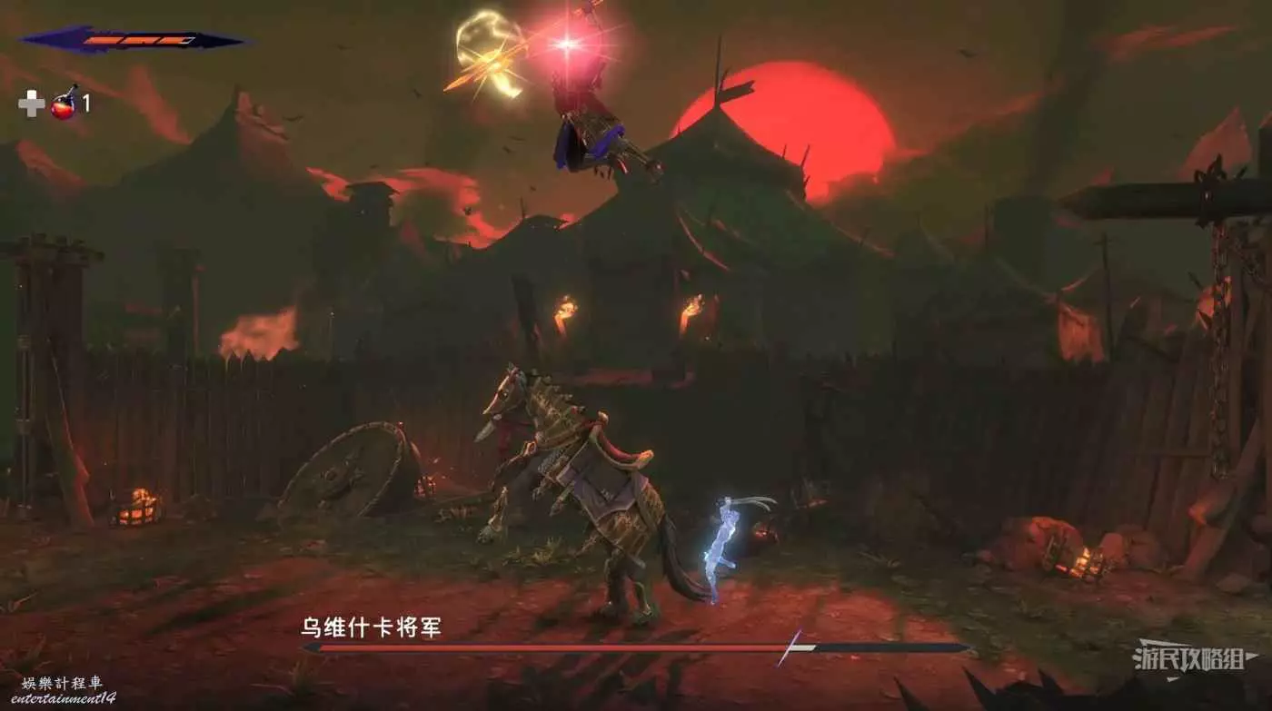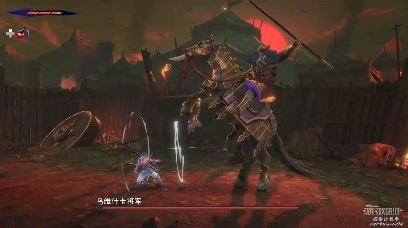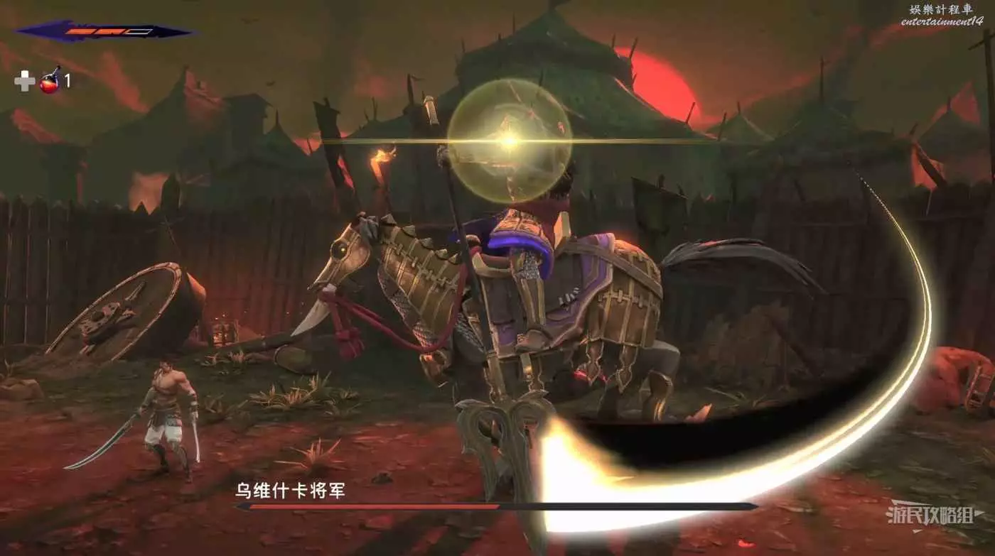 當烏維什卡的血量掉到一半左右會發出黃色光芒並騎馬向前衝刺,抓住時機格擋將烏維什卡踢到馬下開啟第二階段。
