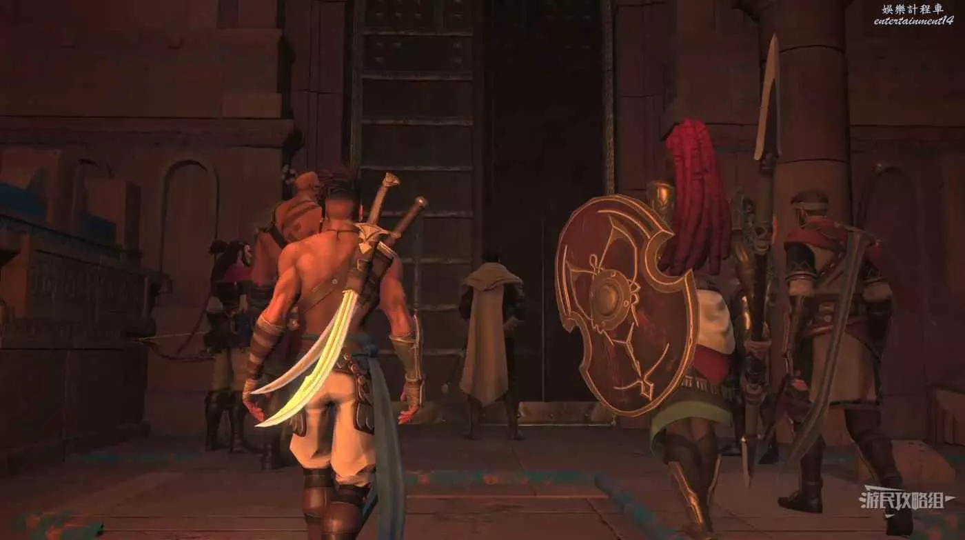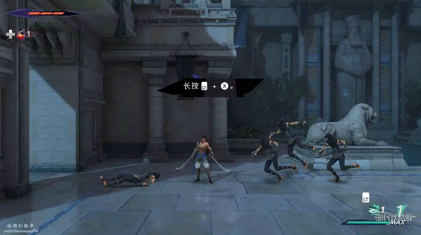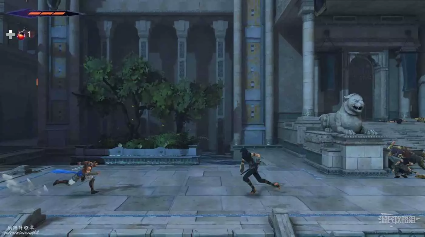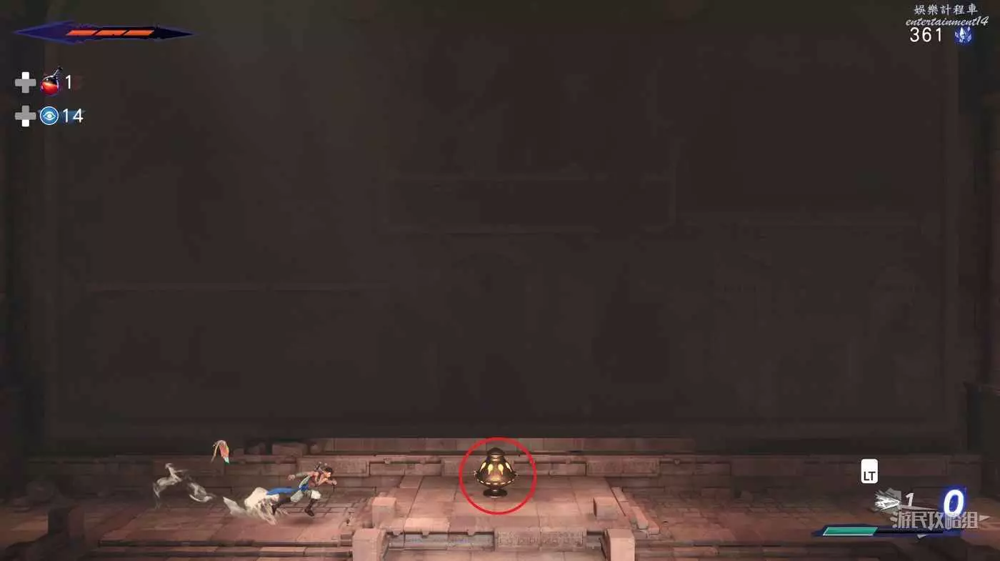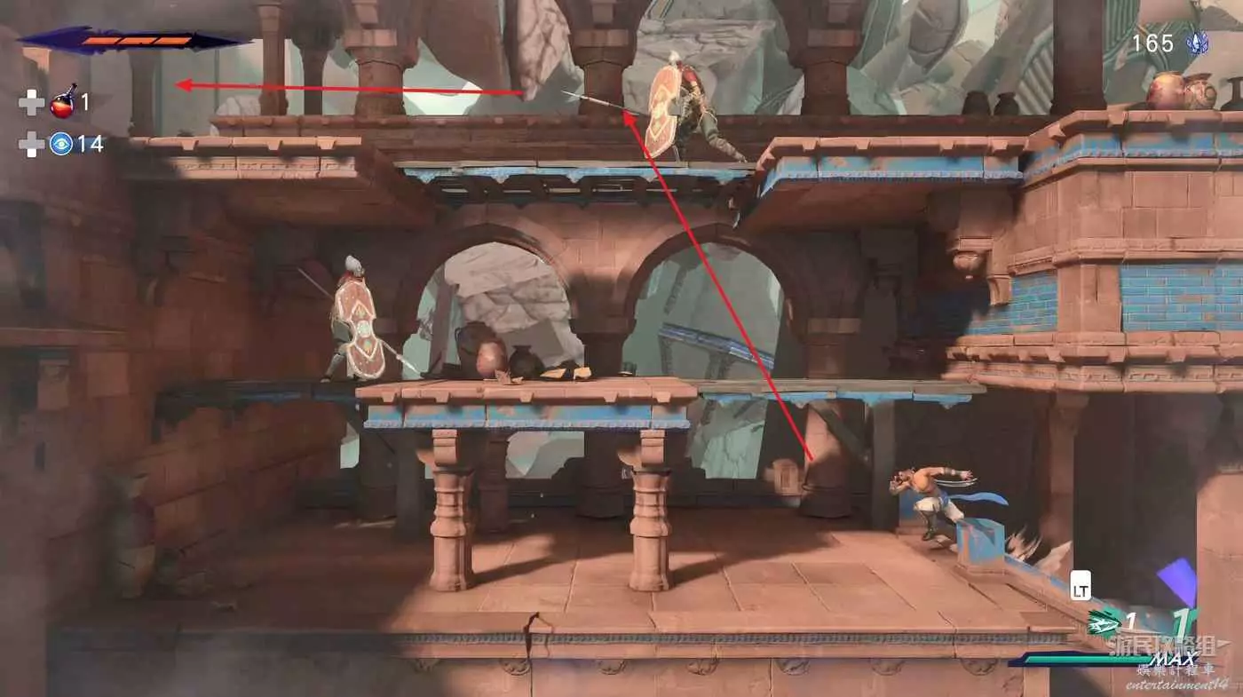 這裡會遇到一個持盾的敵人,當敵人持盾時我們無法直接滑鏟到敵人身後,通過跳躍或者格擋逼其露出破綻即可輕鬆擊敗。