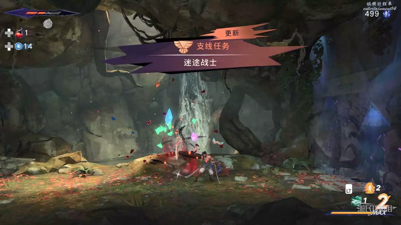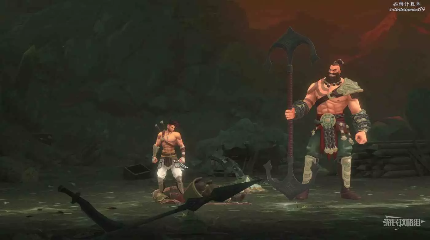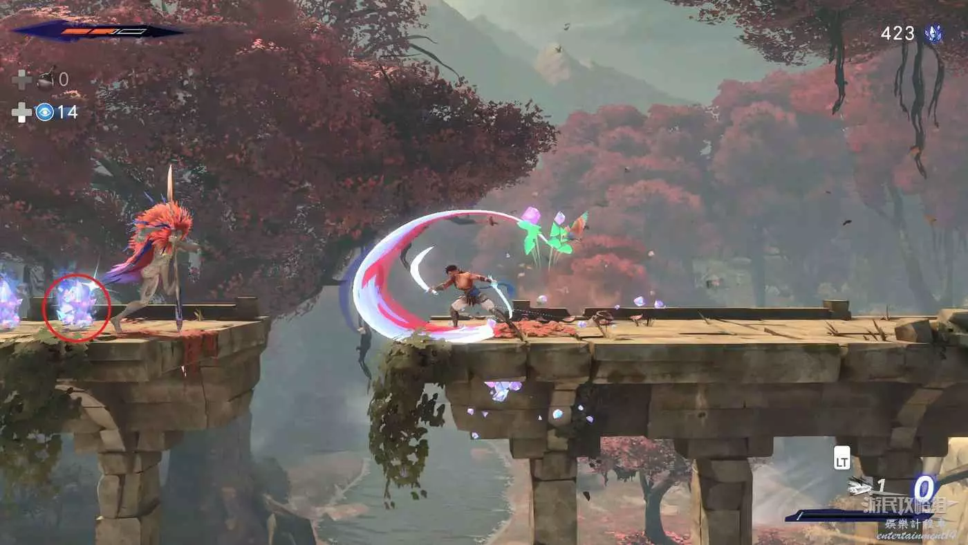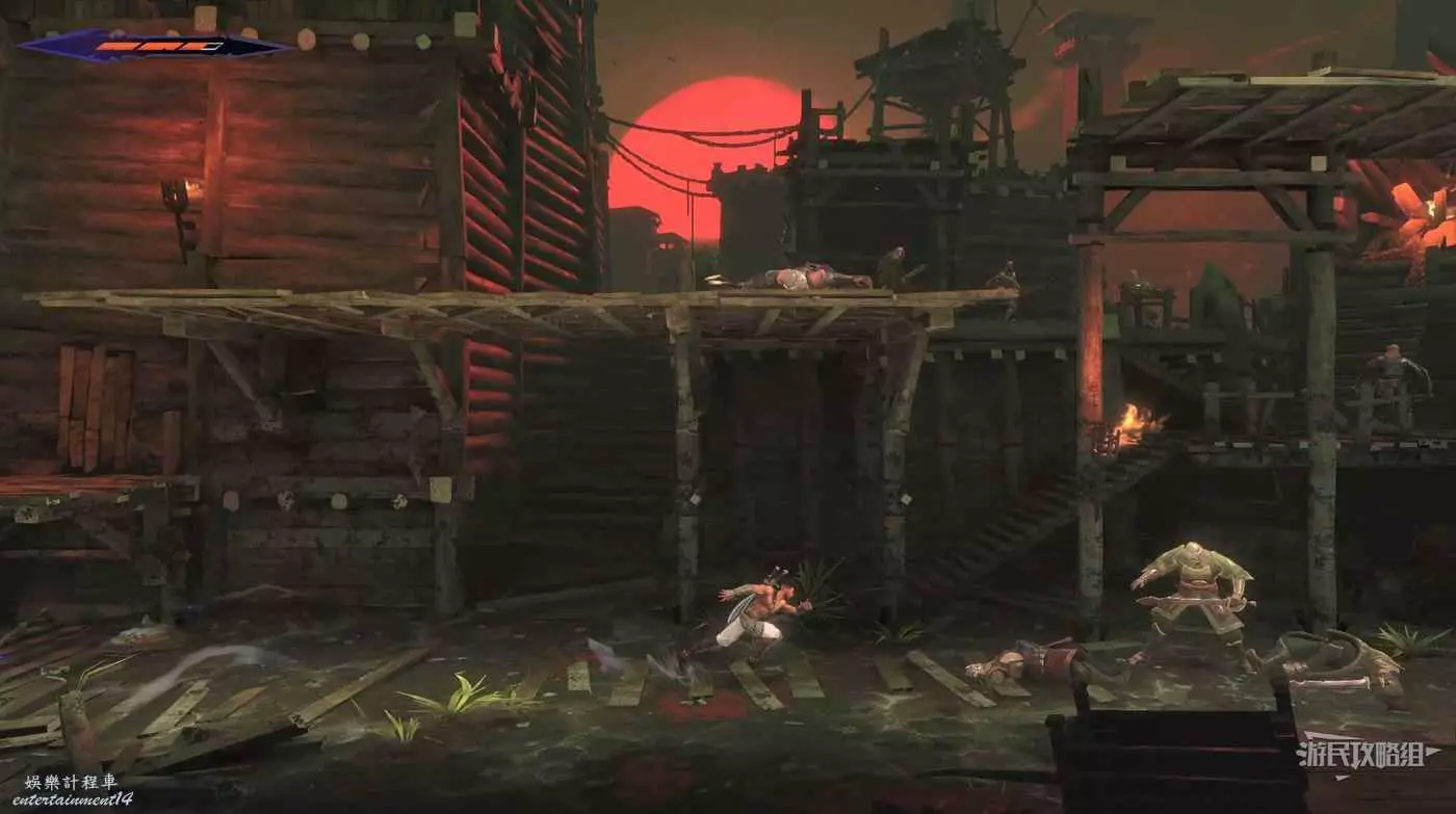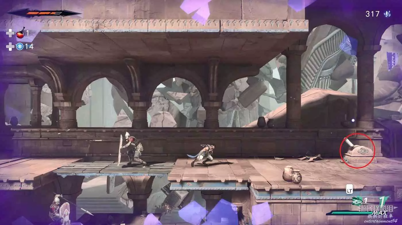 這裡會遇到一個持盾的敵人,當敵人持盾時我們無法直接滑鏟到敵人身後,通過跳躍或者格擋逼其露出破綻即可輕鬆擊敗。