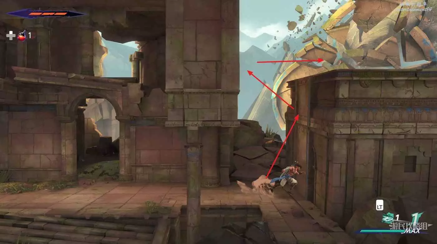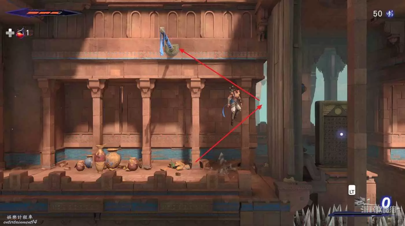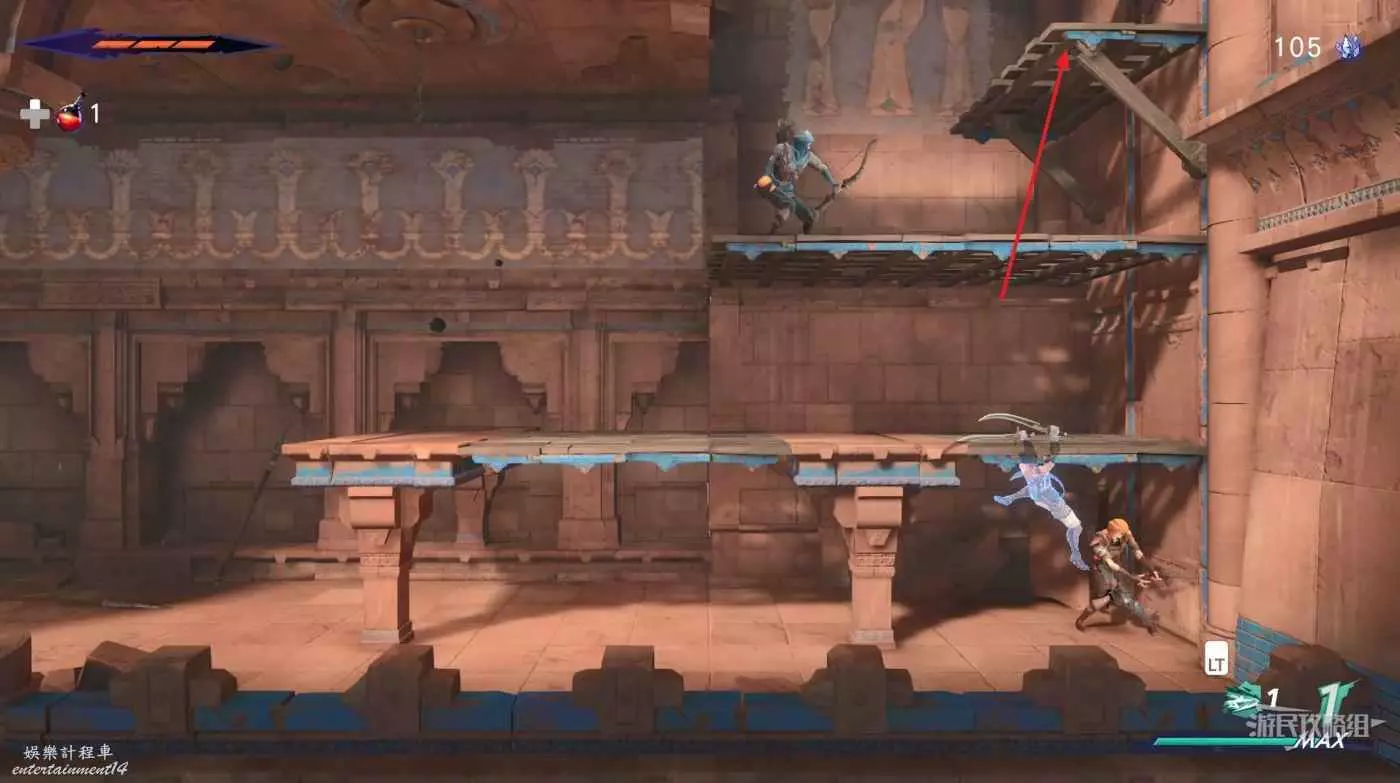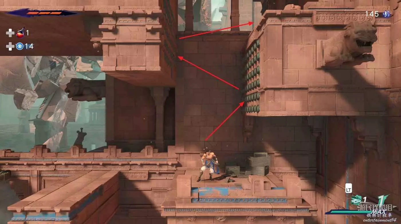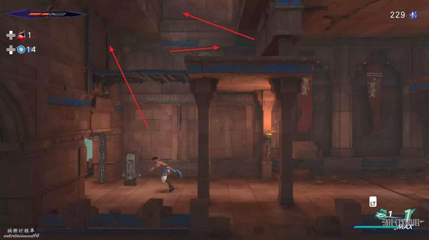 靠左的高台目前我們還無法上去,通過借力跳到右側高台的上方繼續走。