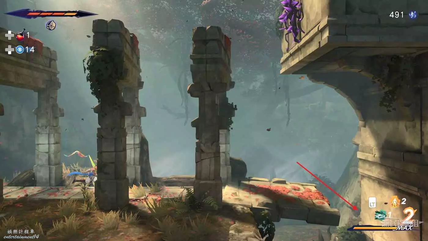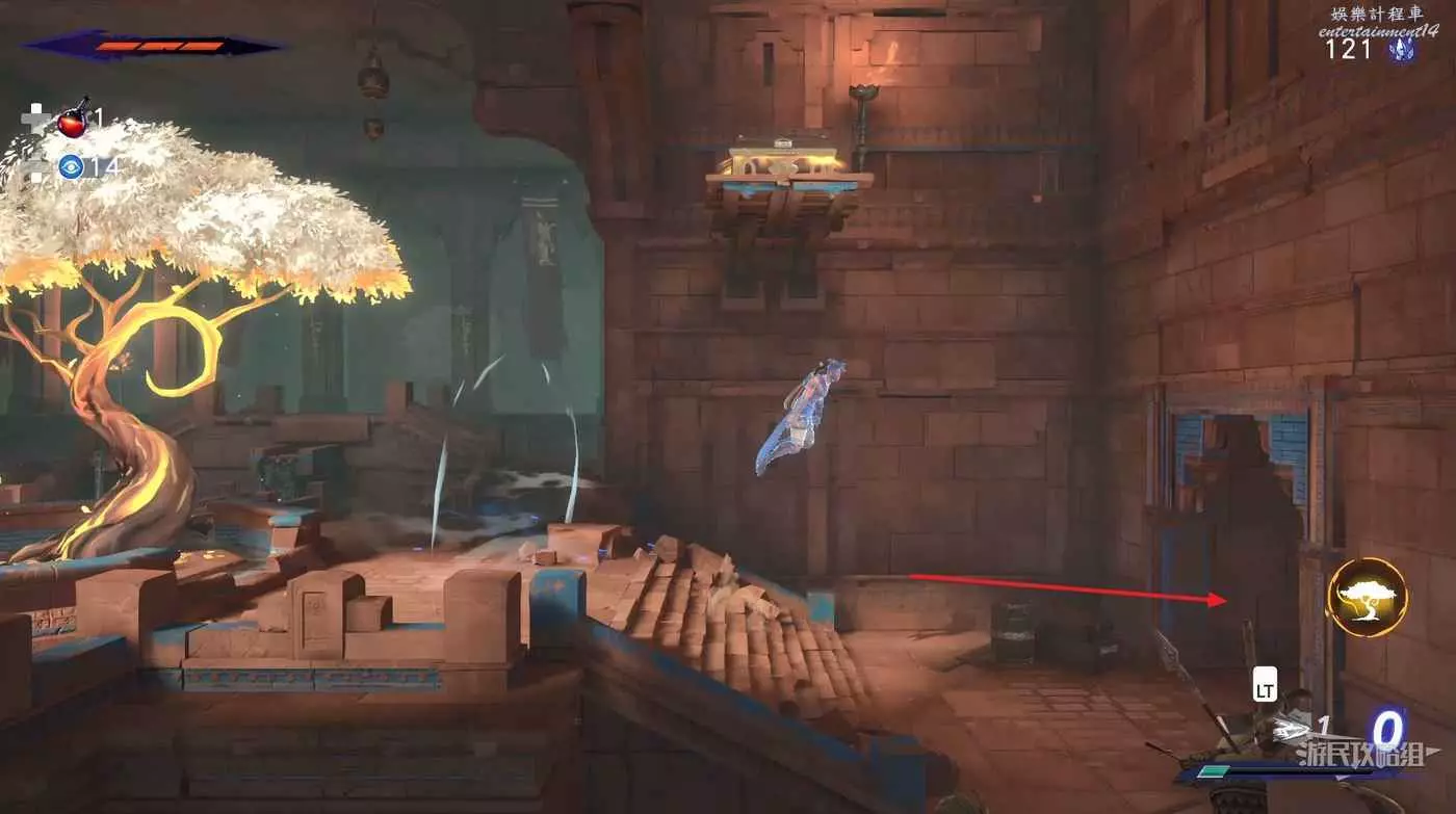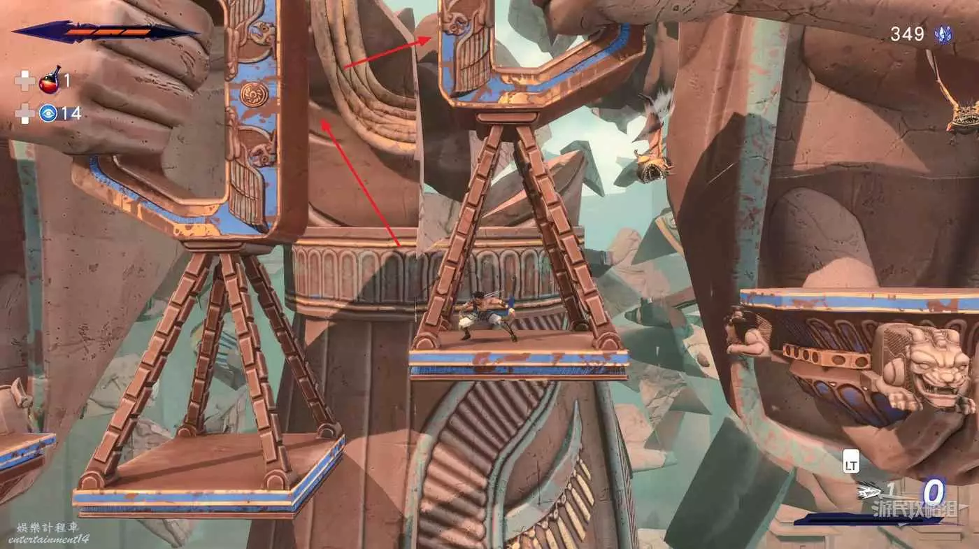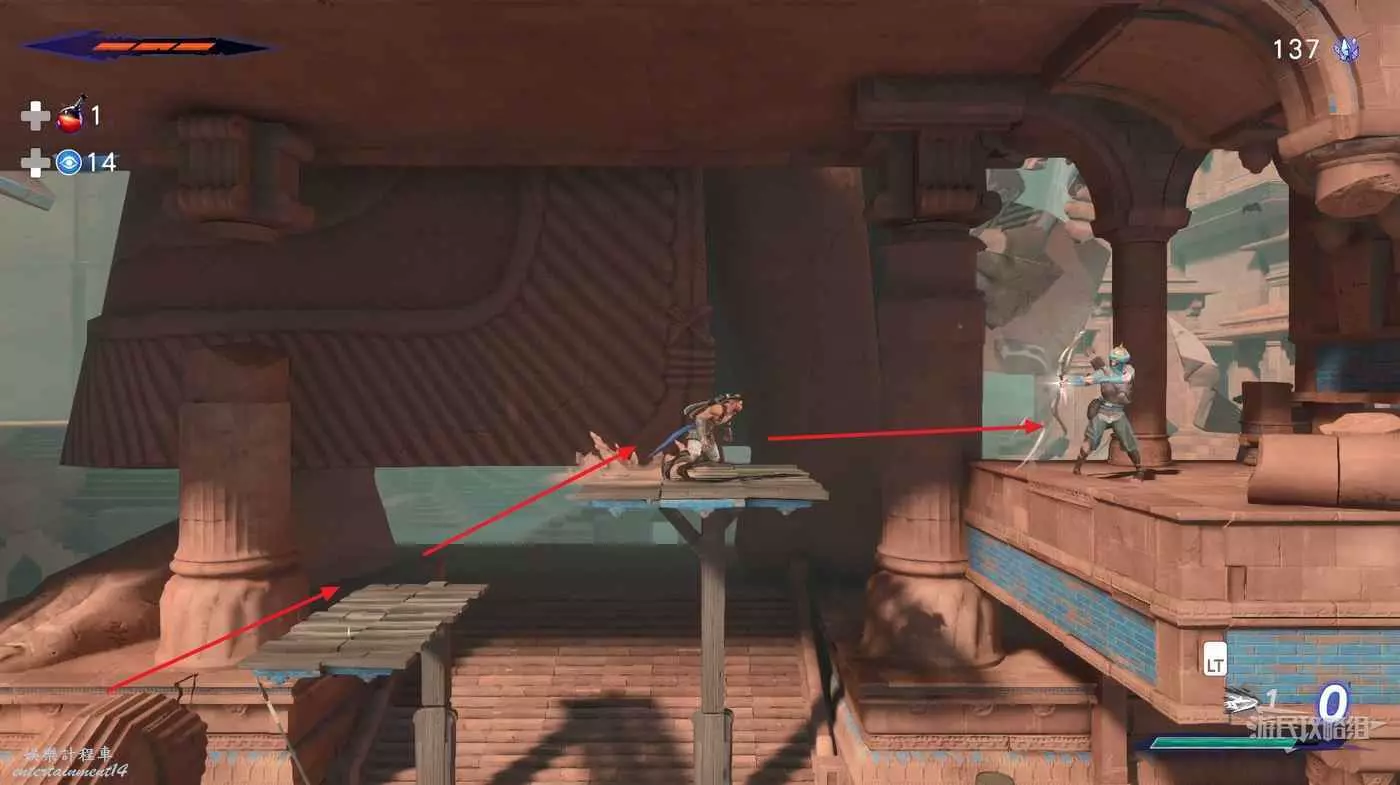 靠左的高台目前我們還無法上去,通過借力跳到右側高台的上方繼續走。