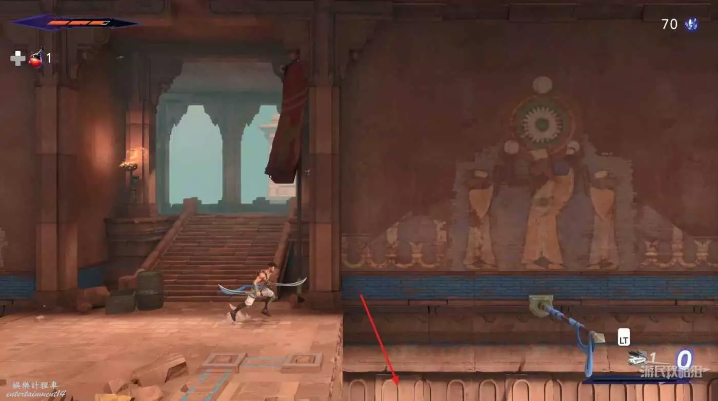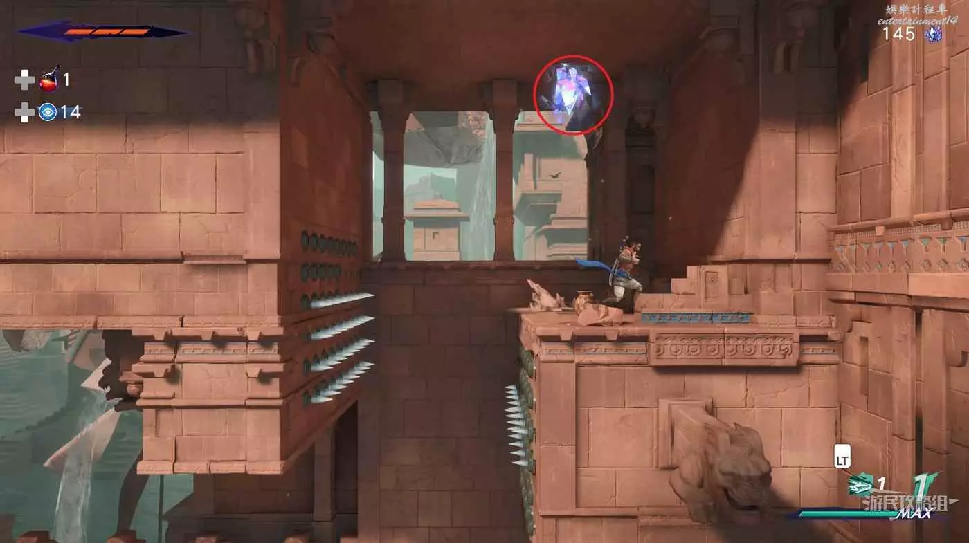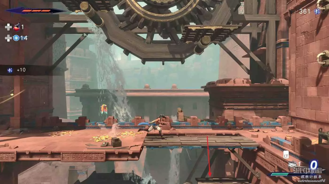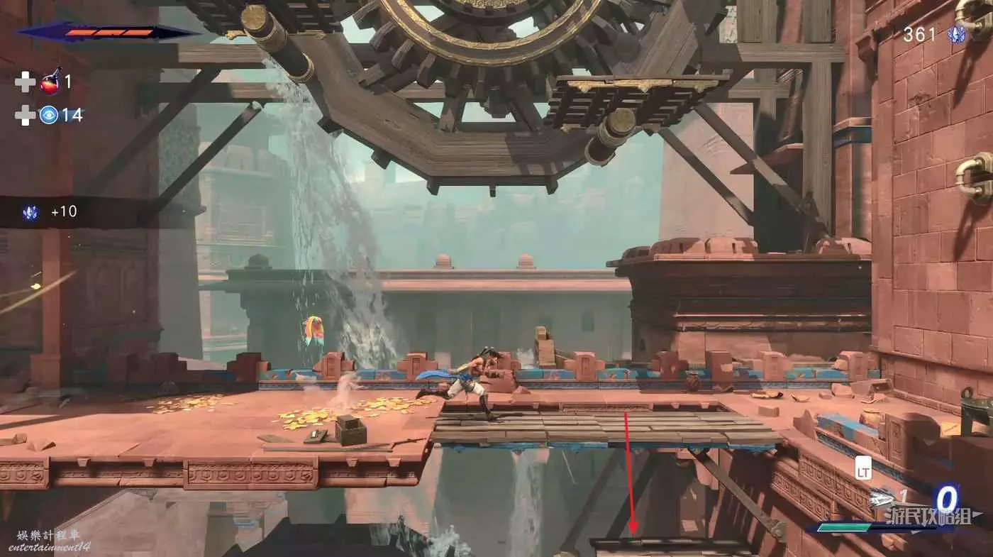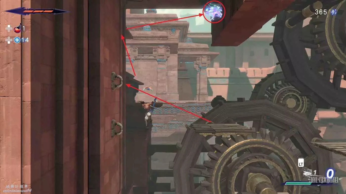 不要直接跳下去,沿著牆蹭下去先來到中間位置,此處可以找到第一個時沙瓶。