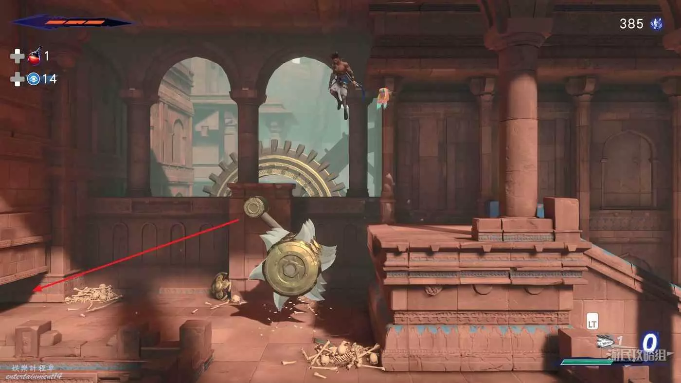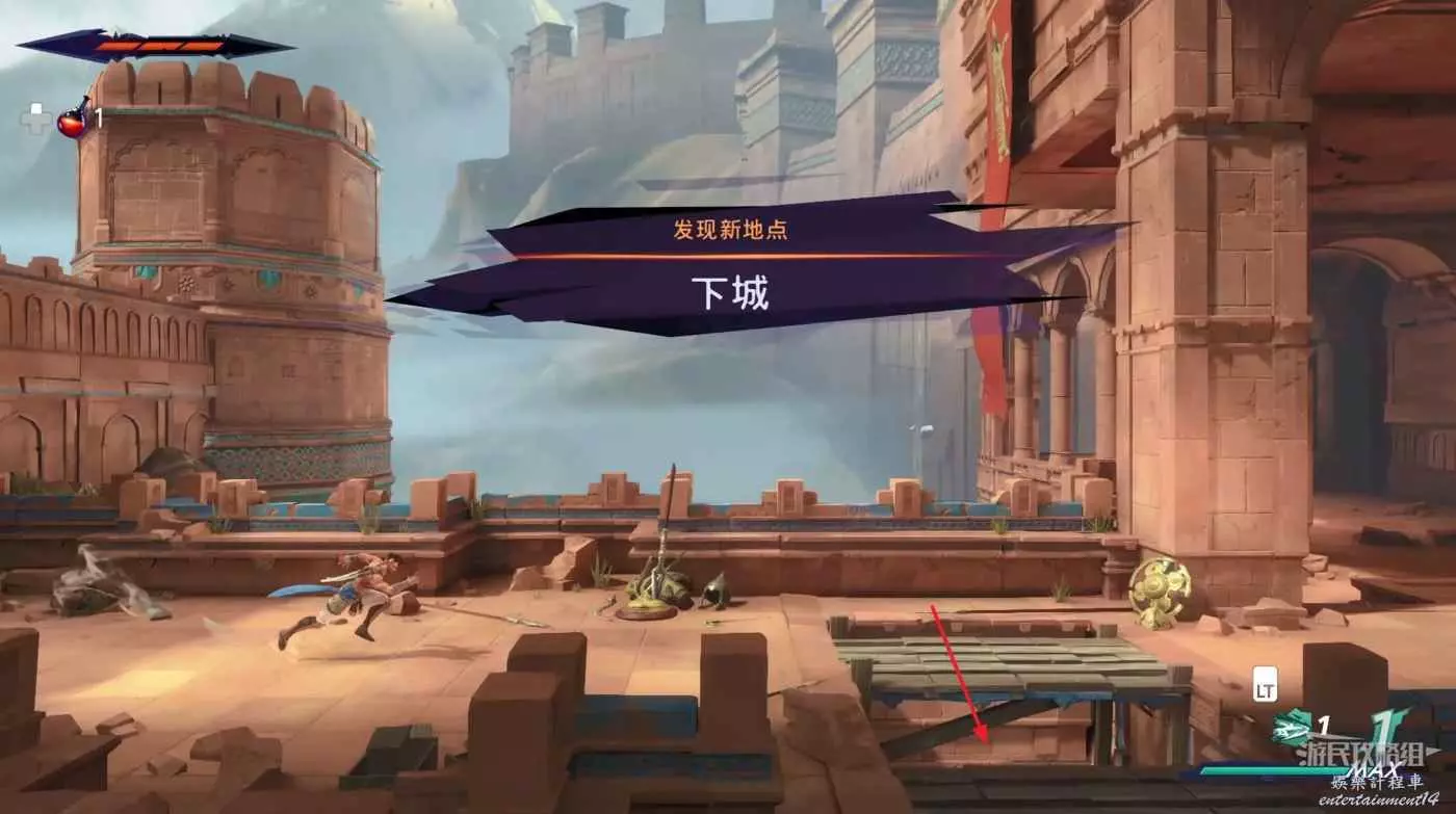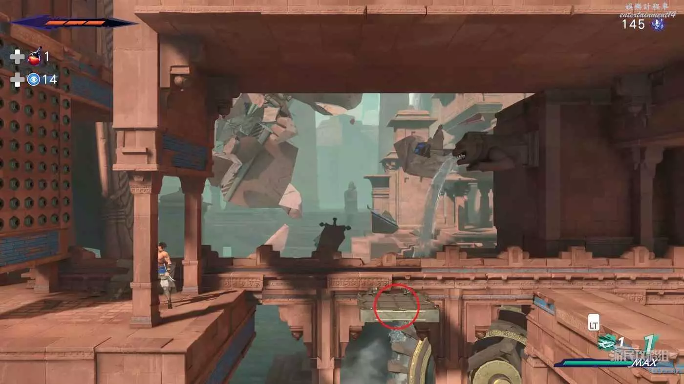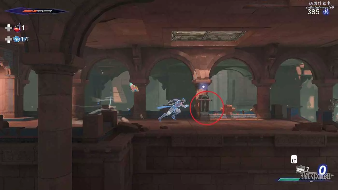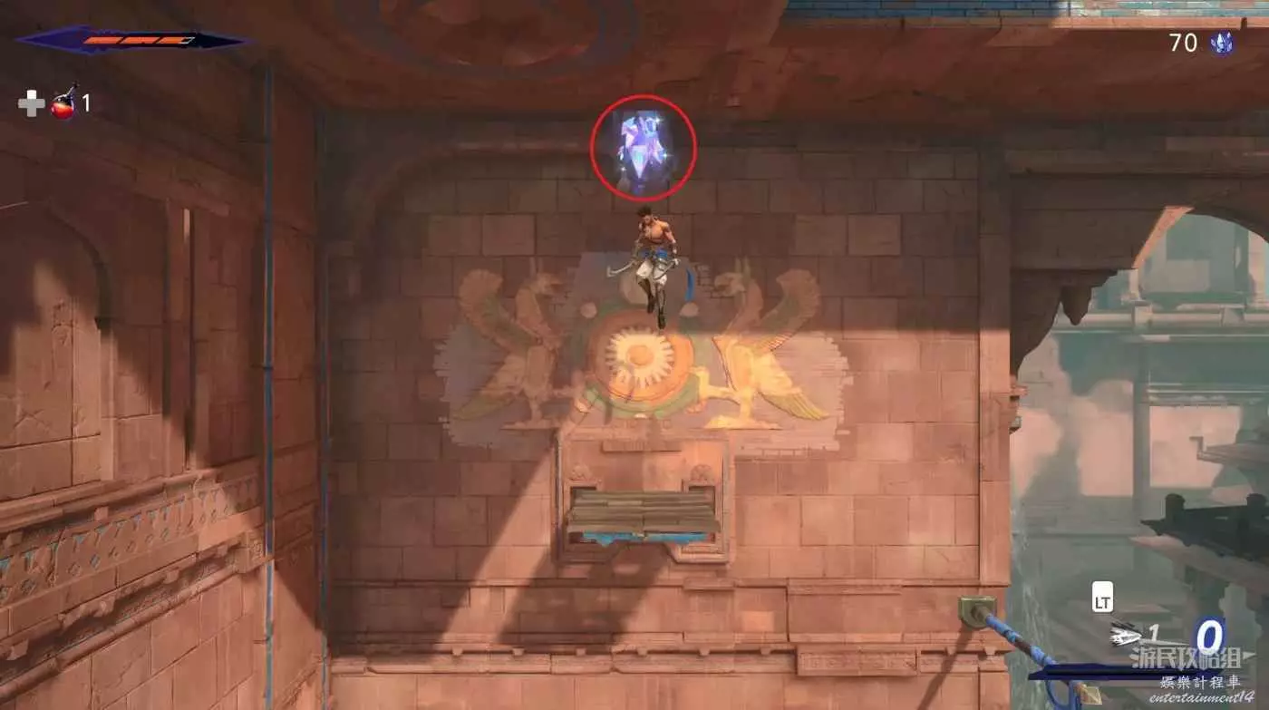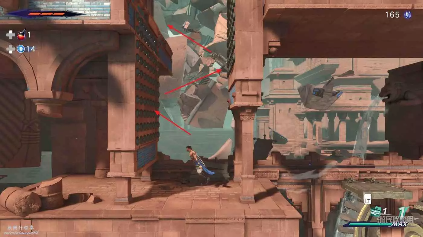 不要直接跳下去,沿著牆蹭下去先來到中間位置,此處可以找到第一個時沙瓶。
