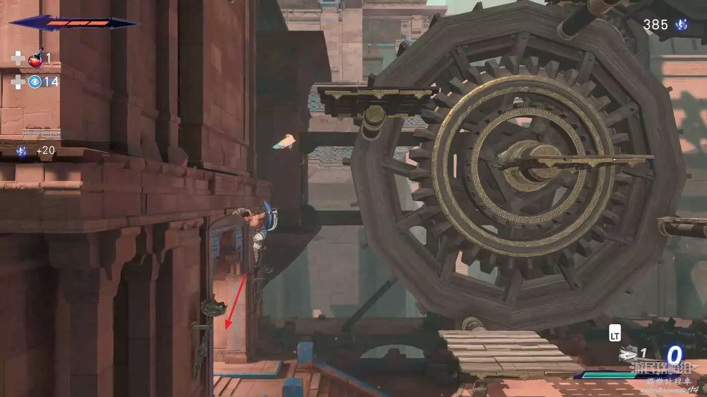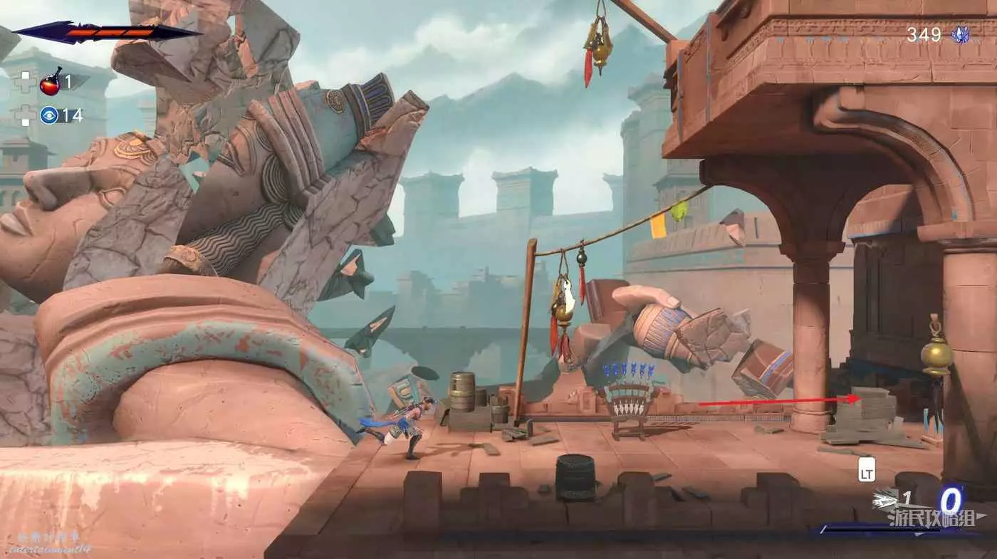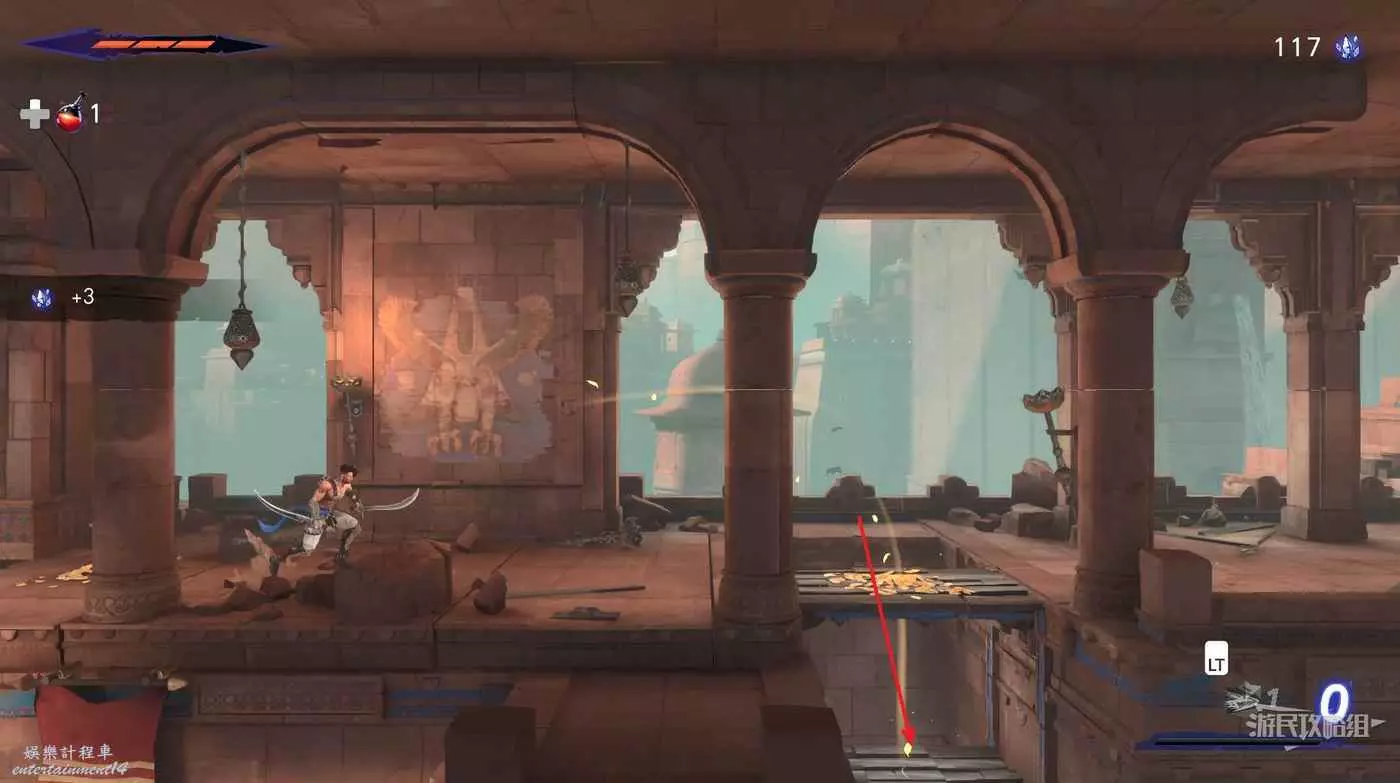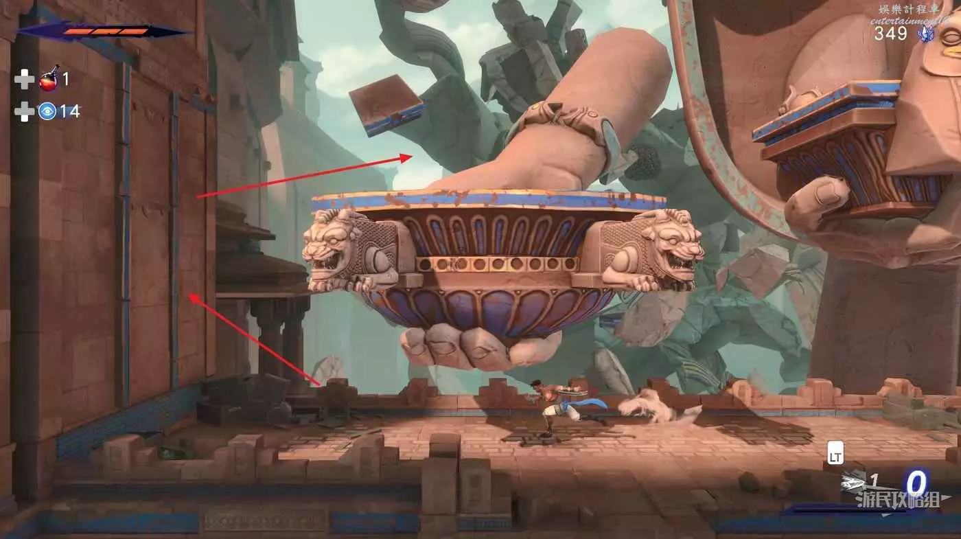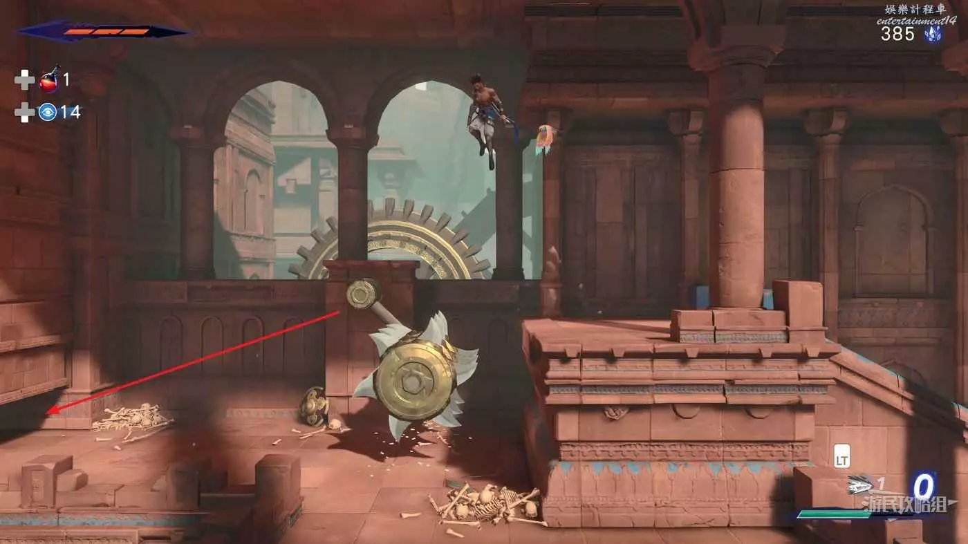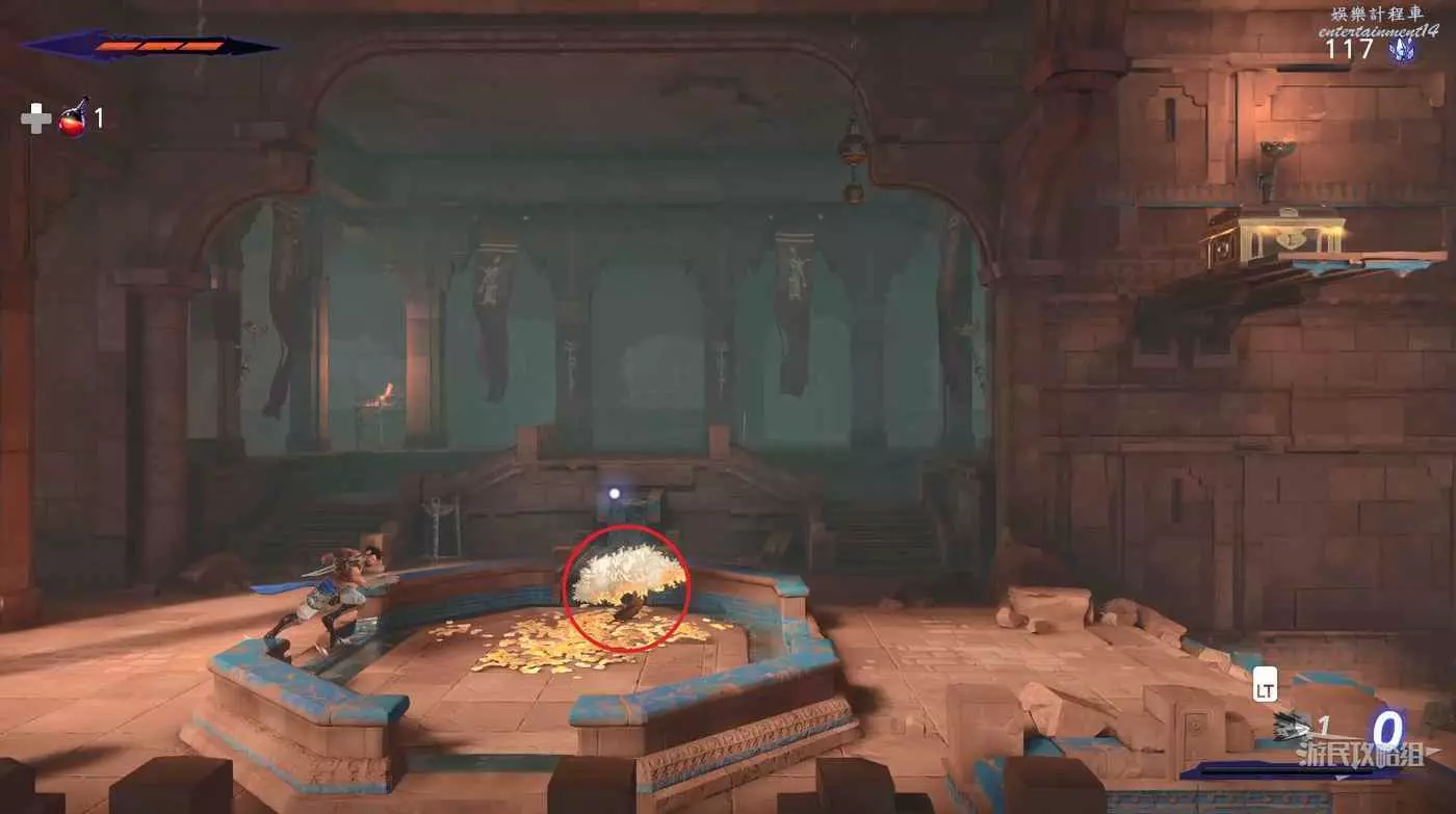 不要直接跳下去,沿著牆蹭下去先來到中間位置,此處可以找到第一個時沙瓶。
