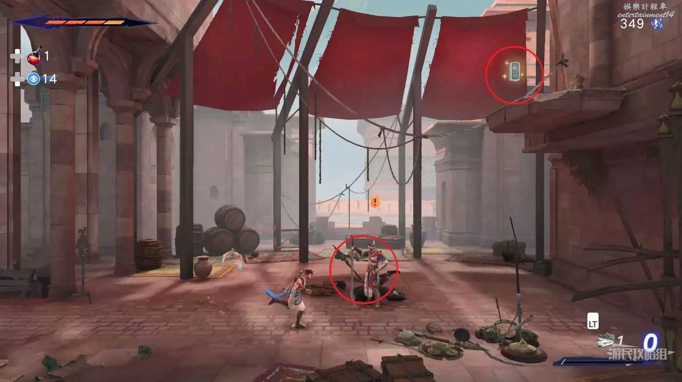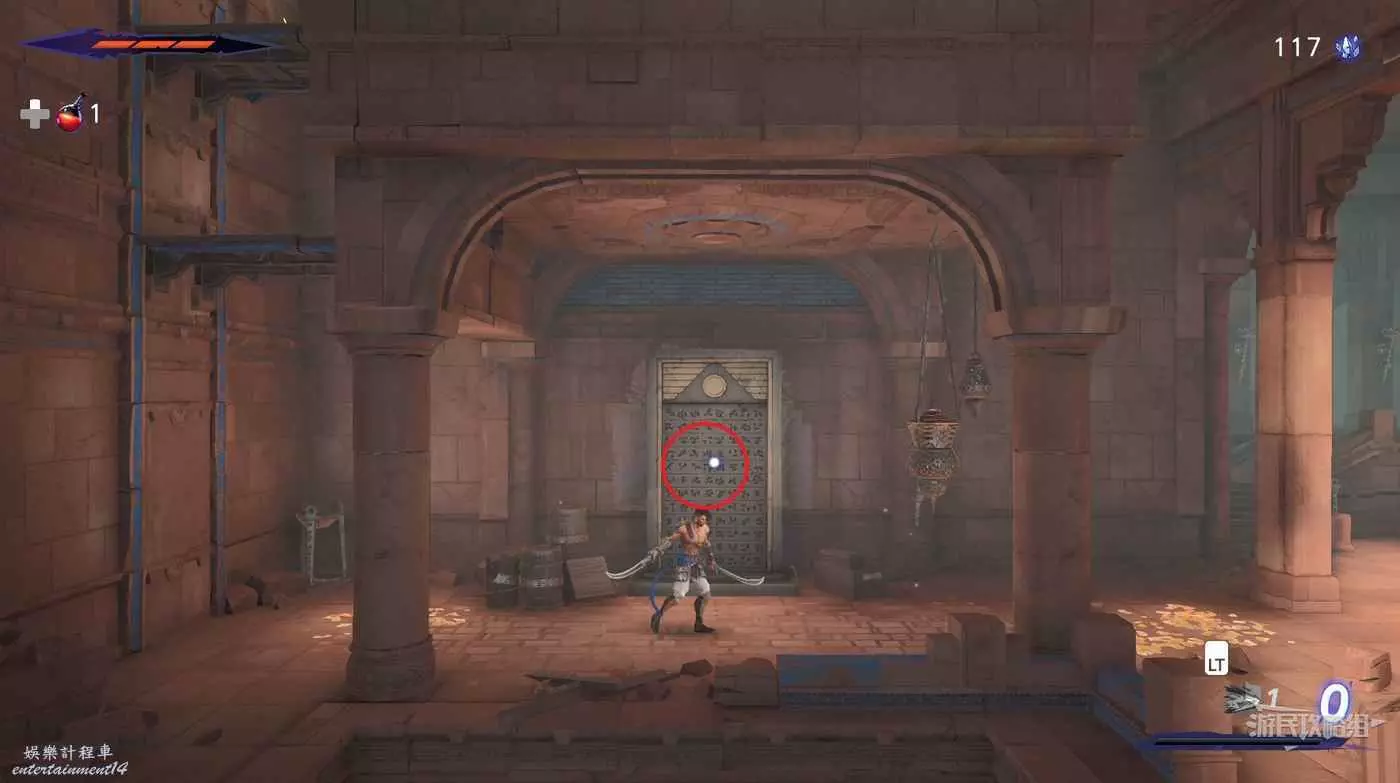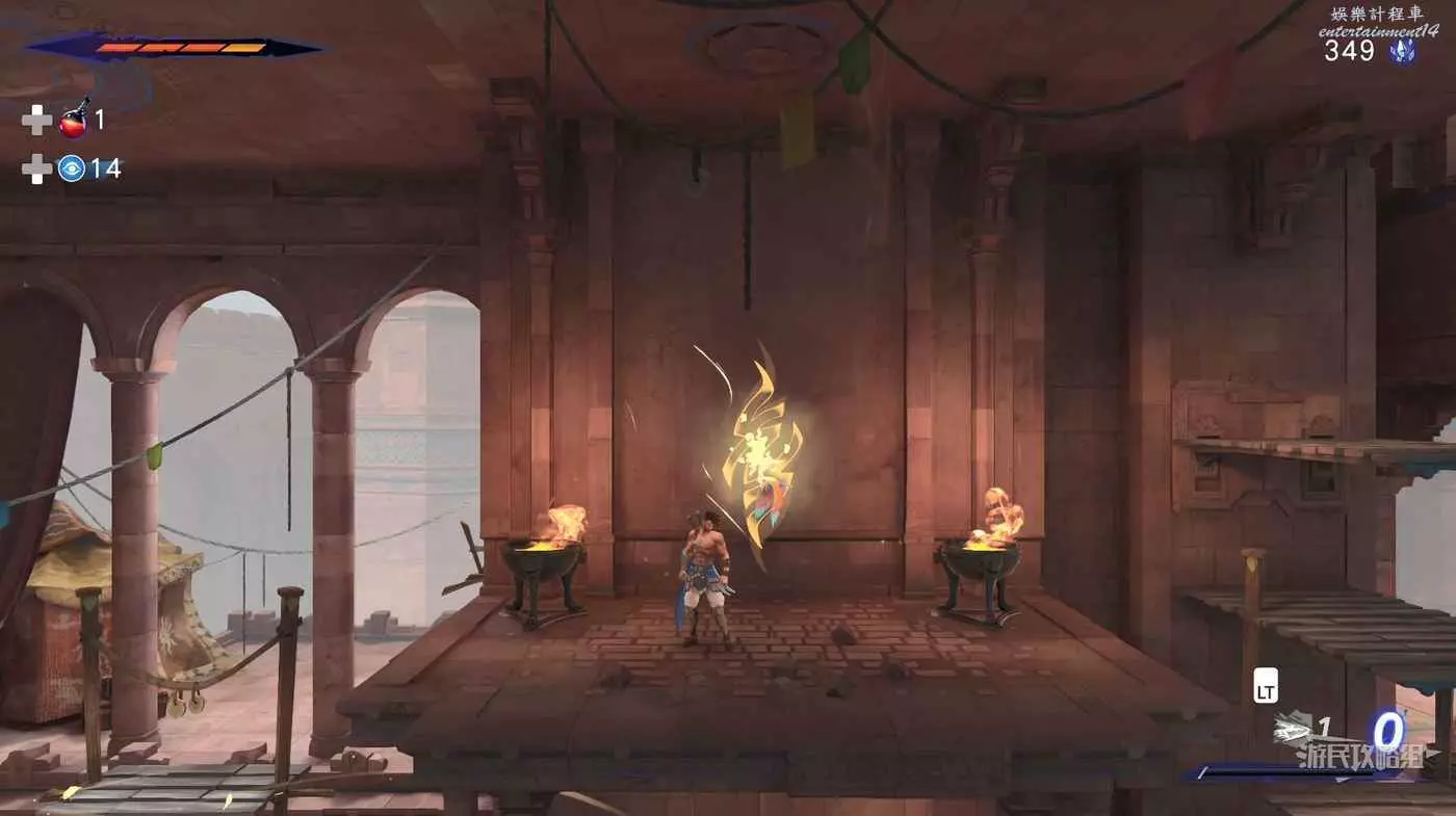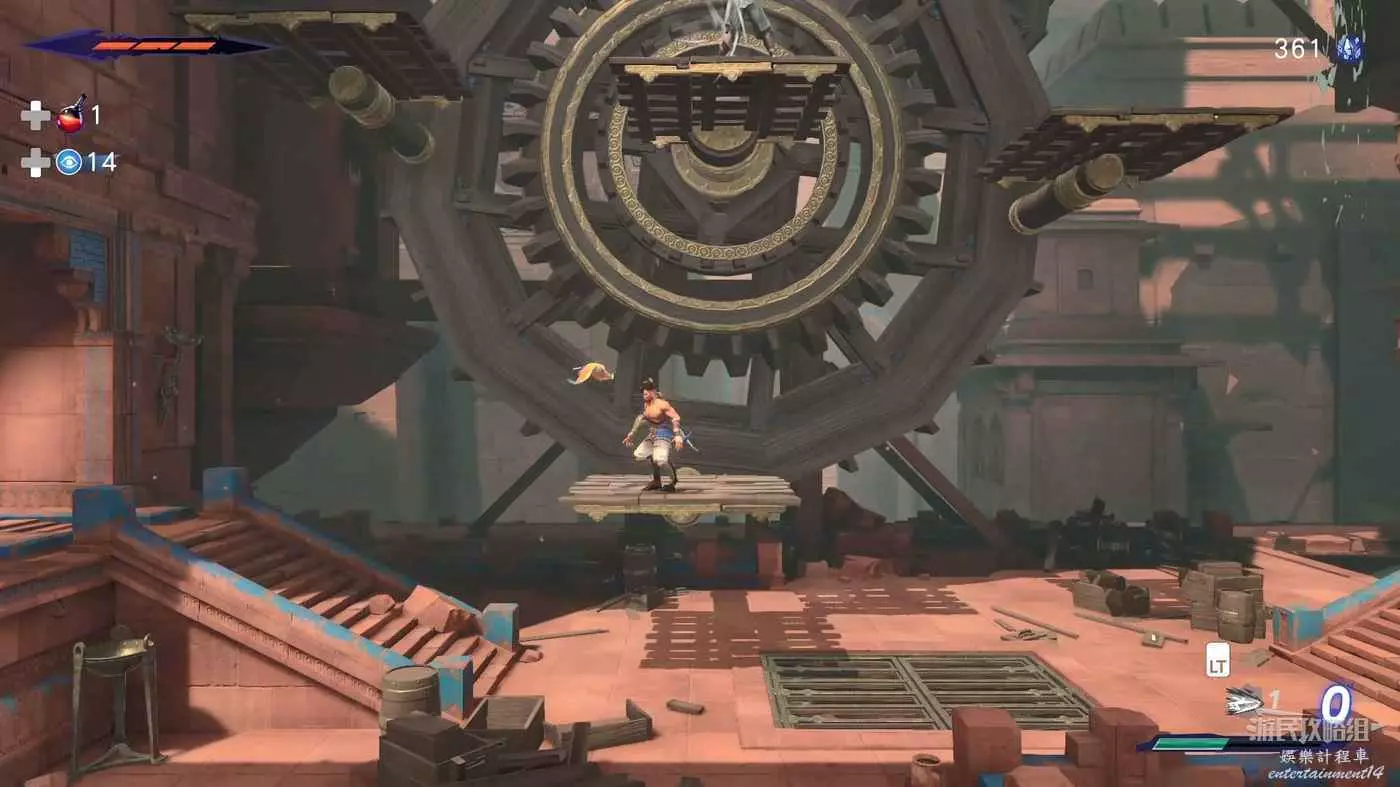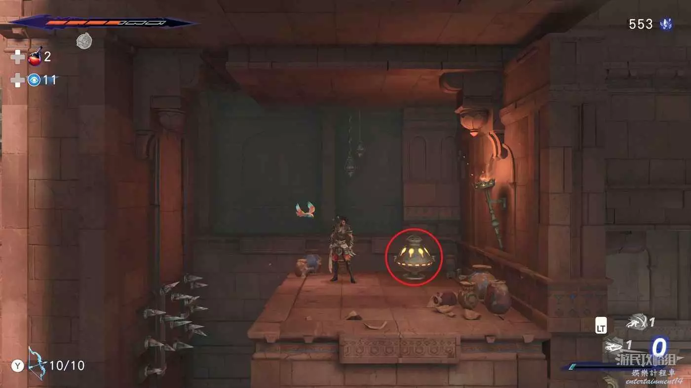 不要直接跳下去,沿著牆蹭下去先來到中間位置,此處可以找到第一個時沙瓶。