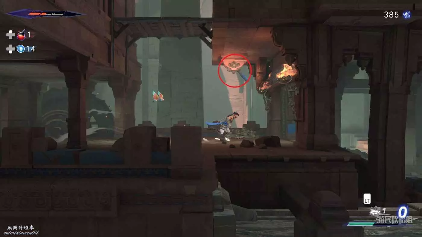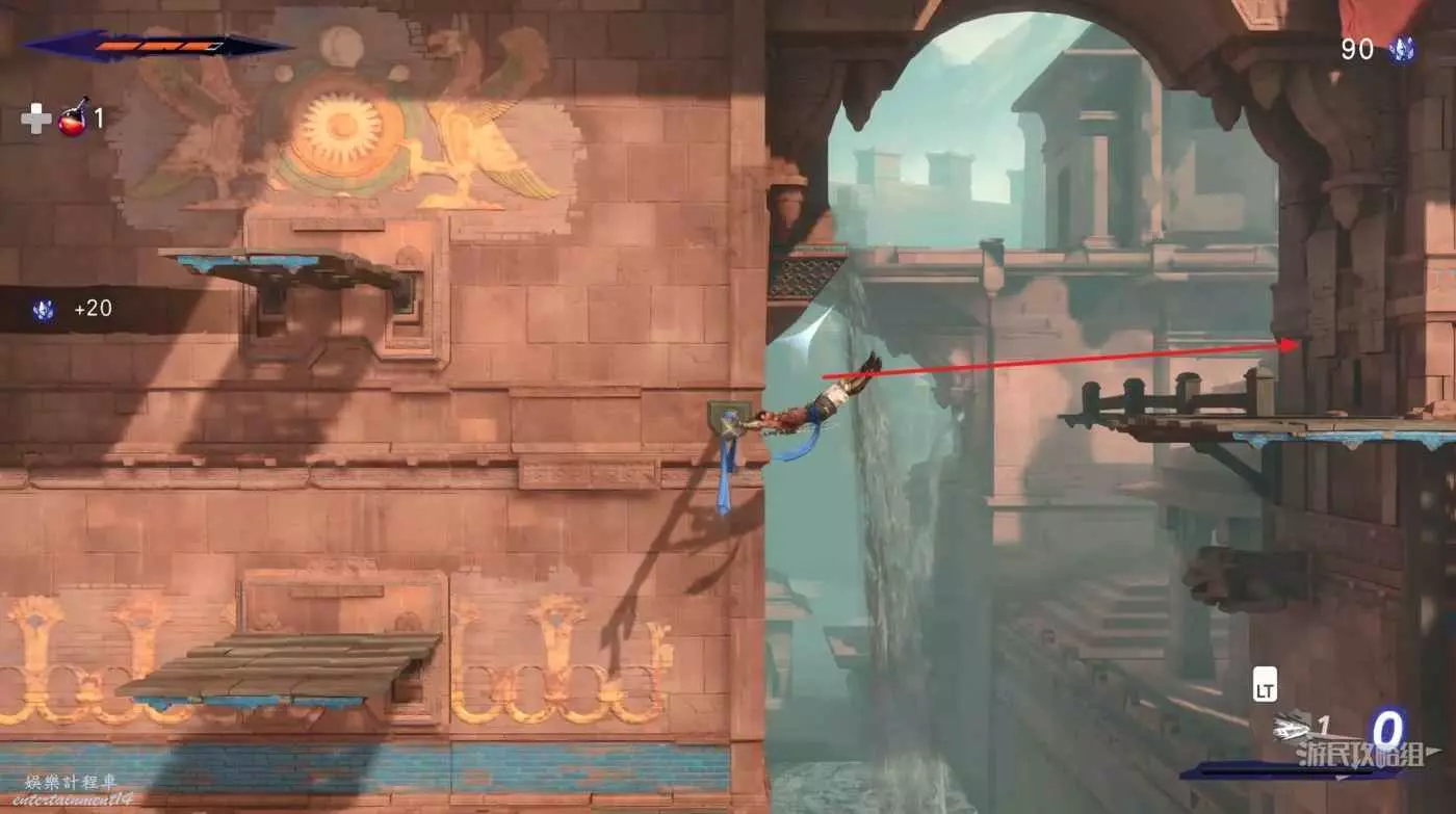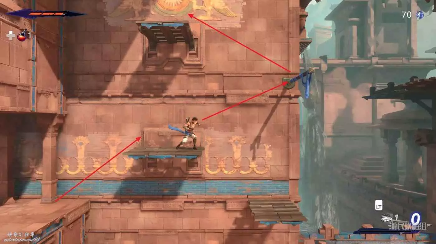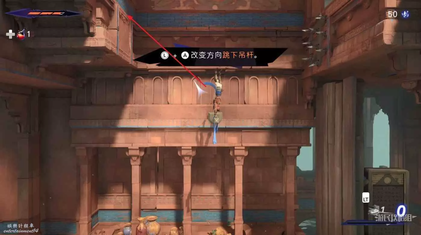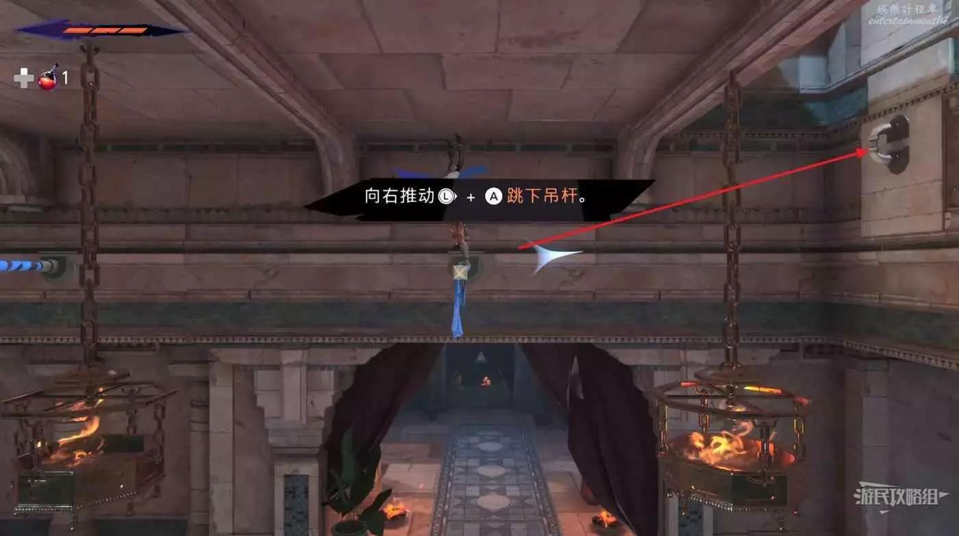 隨後連跳到第二個杆子上,調整方向跳到右牆的抓杆位置。