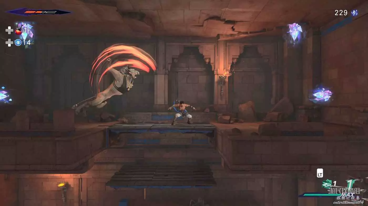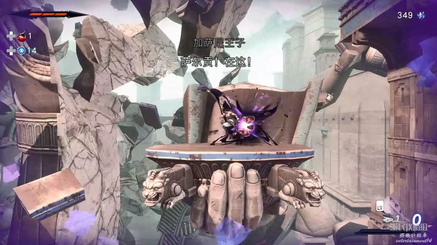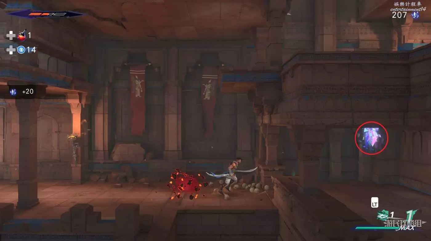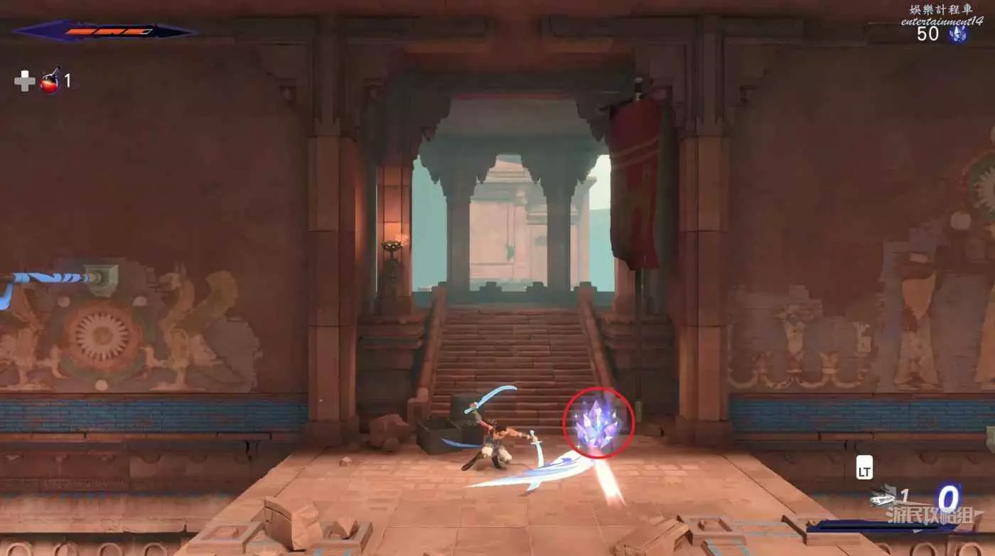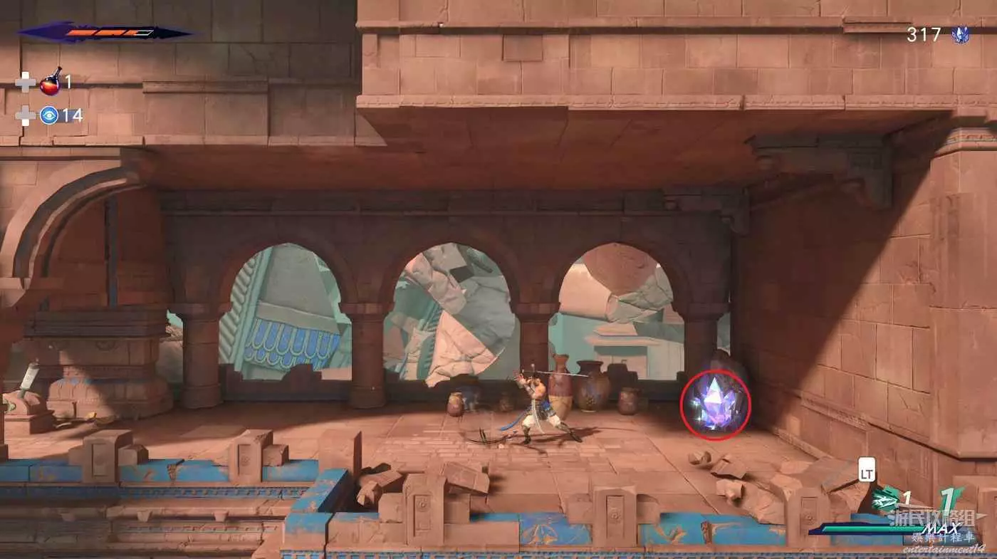 長按跳躍鍵可以讓薩爾貢跳的更高,此處可以打碎一個水晶。