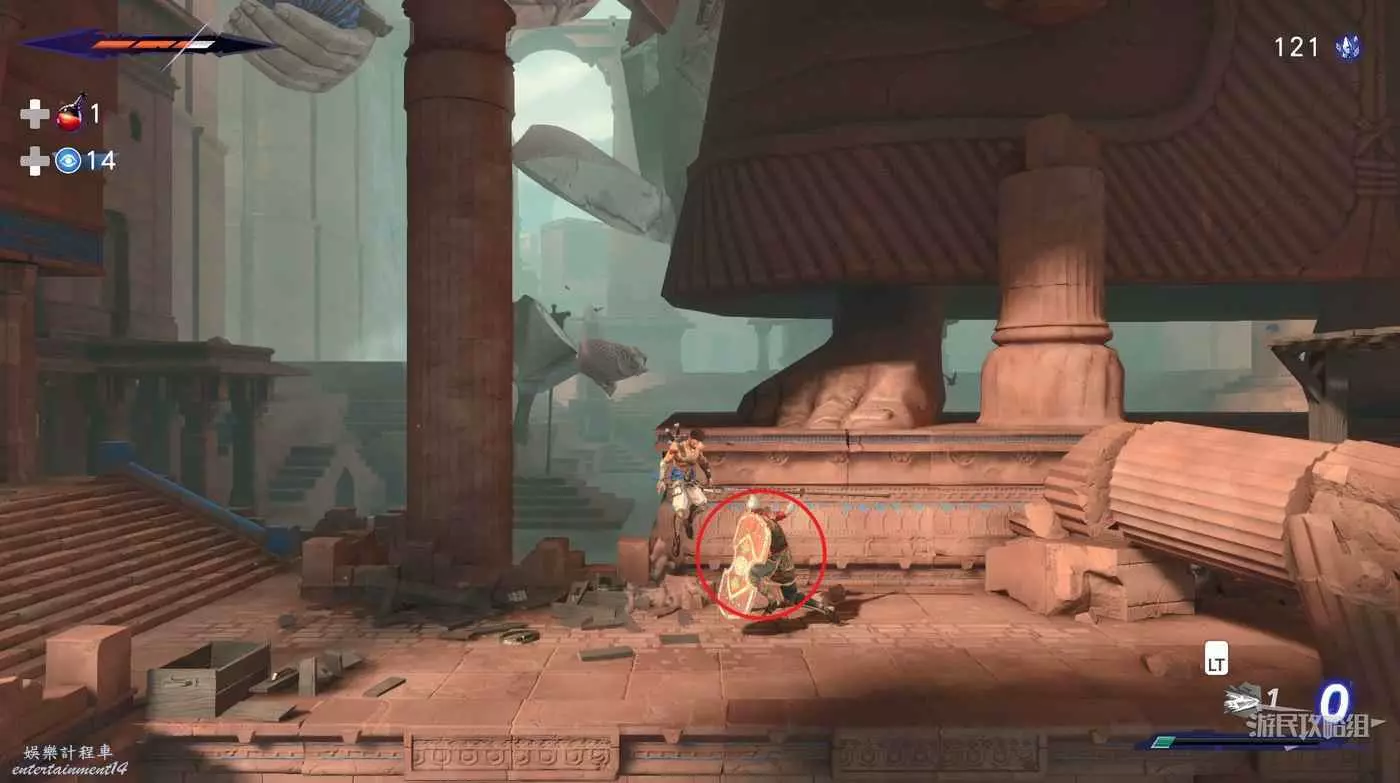 一直往左走,擊敗兩個持盾敵人爬上高處繼續向左。