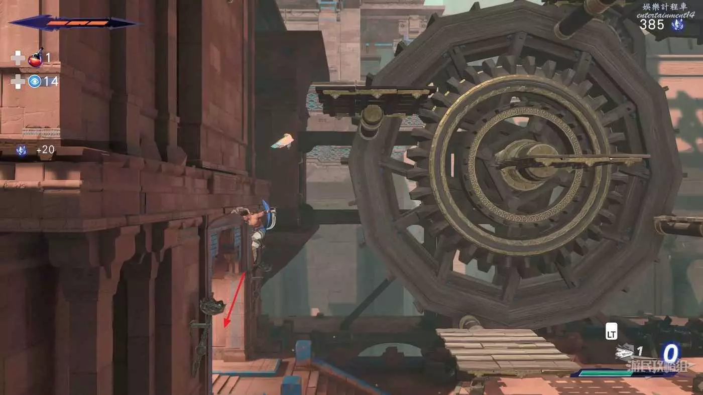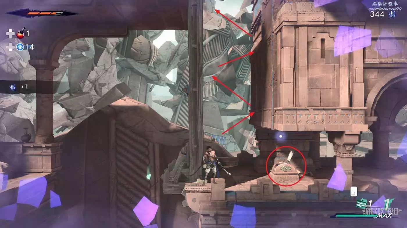 接著撥動右側的機關將木板提上來,通過兩個牆壁折返跳到高處。