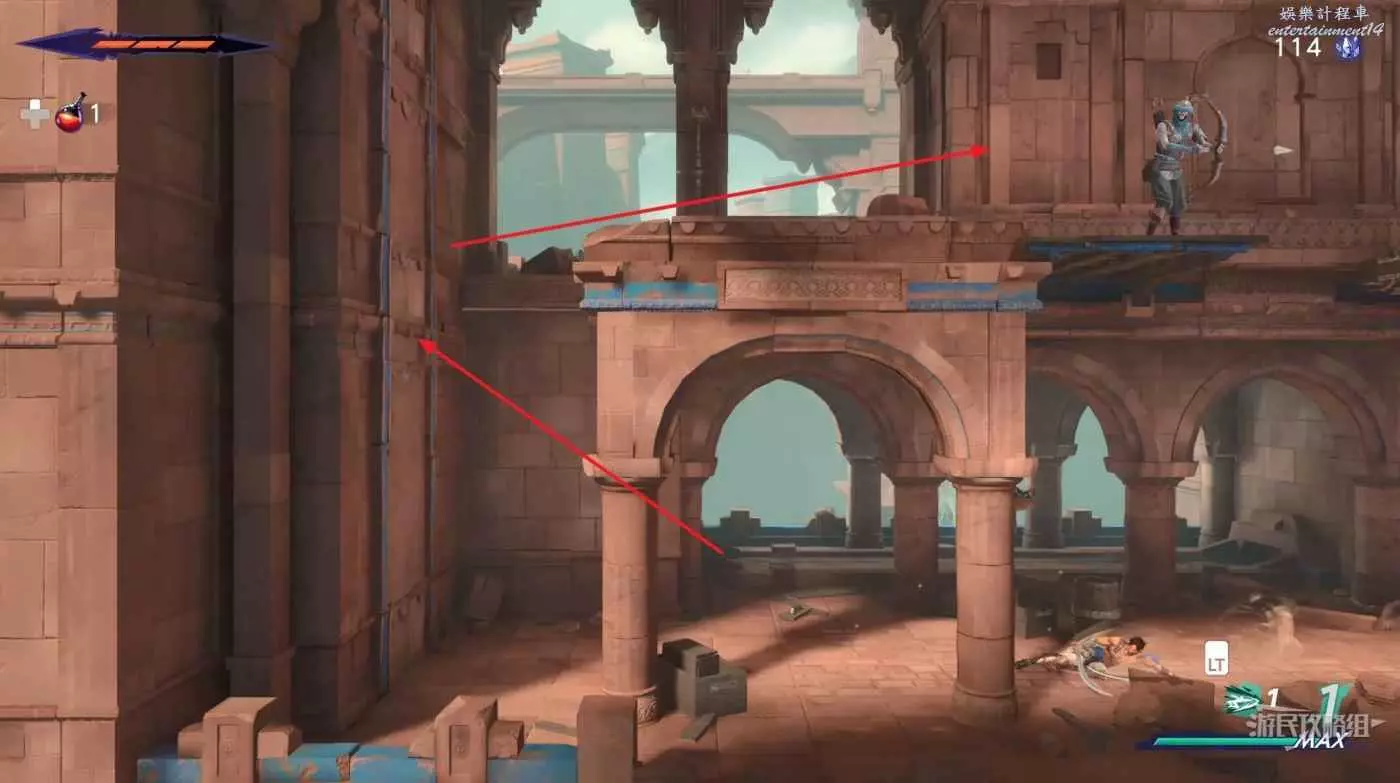 繼續往右側走進入下一個機關區域,我們爬上下圖所示的杆子,往左上方的杆子上跳。