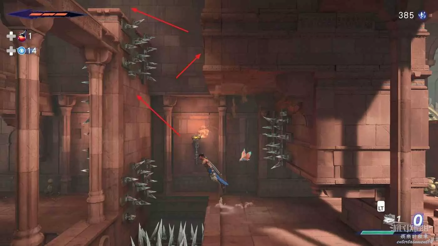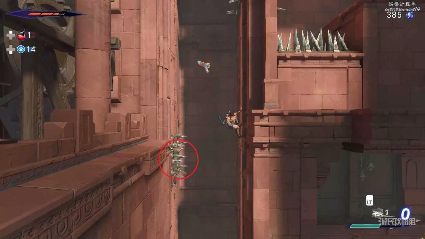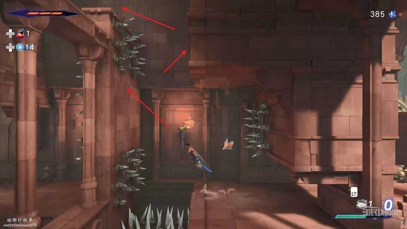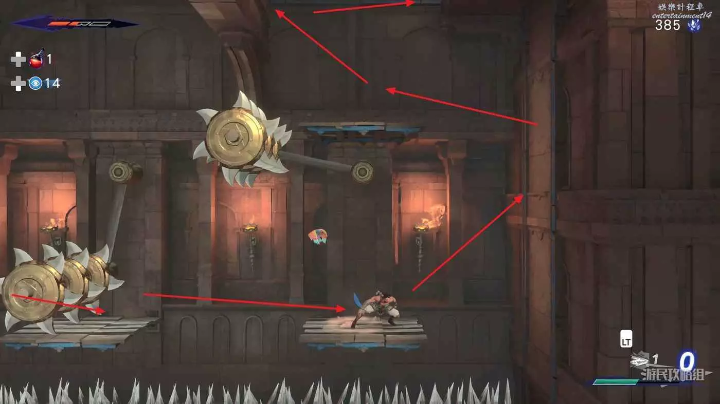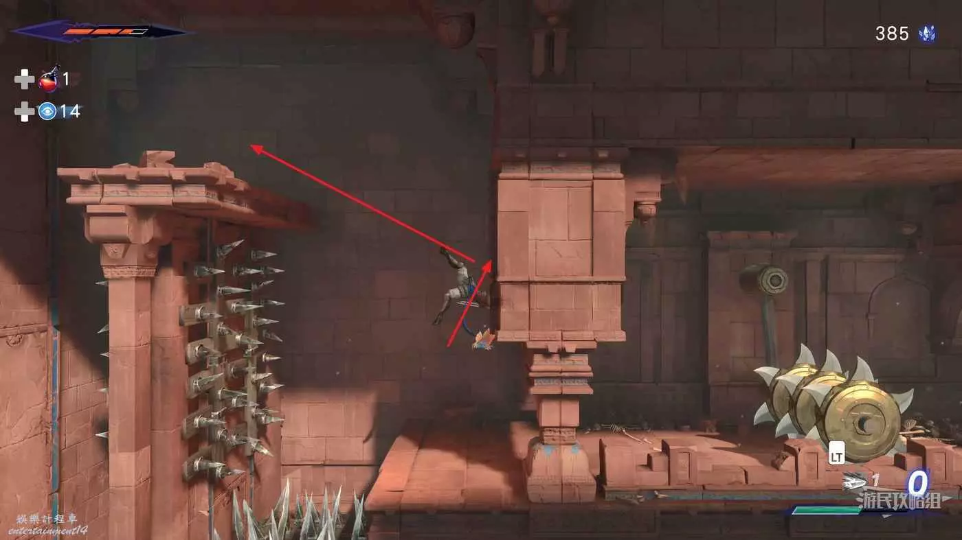 通過折返跳來到上方高台,當薩爾貢接觸到牆壁時會出現尖刺陷阱,所以不要在牆壁上長時間停留。