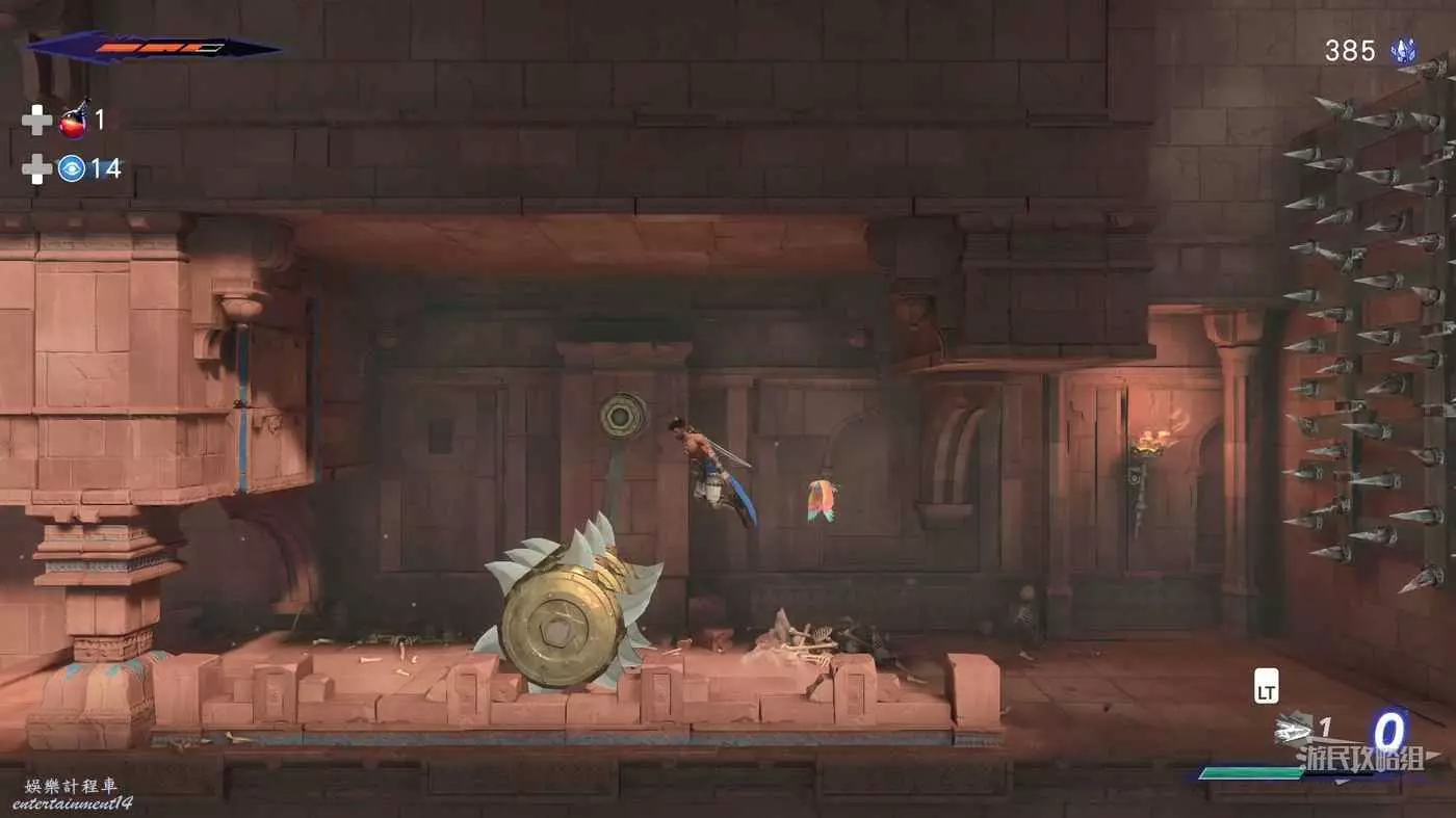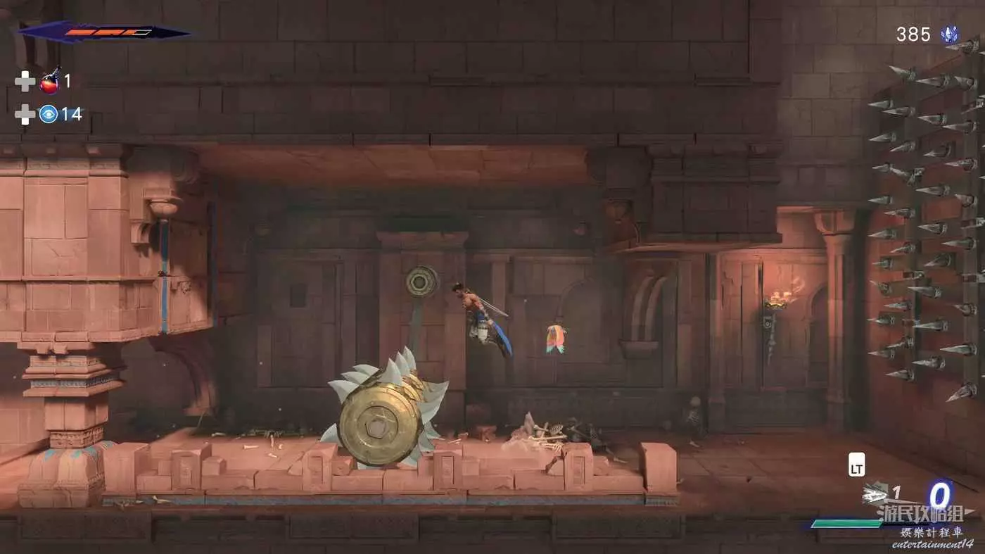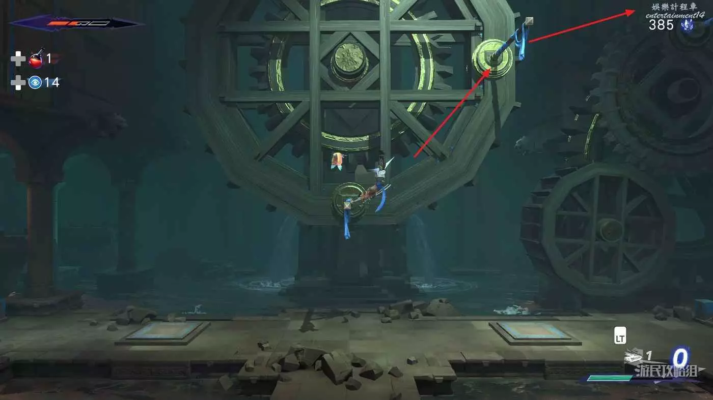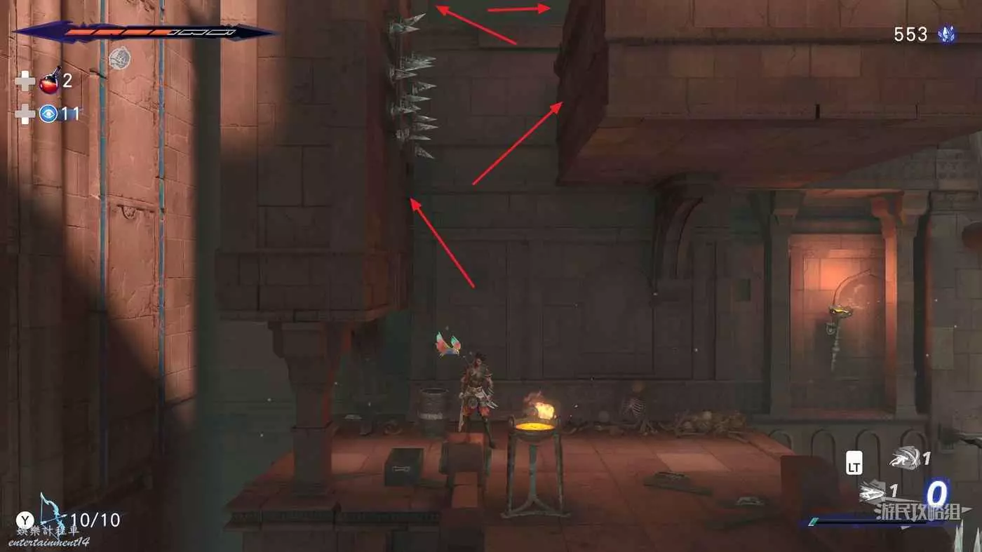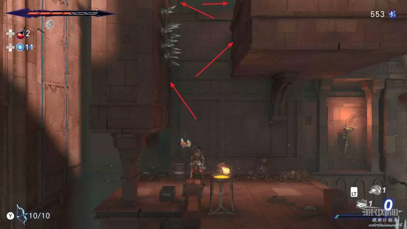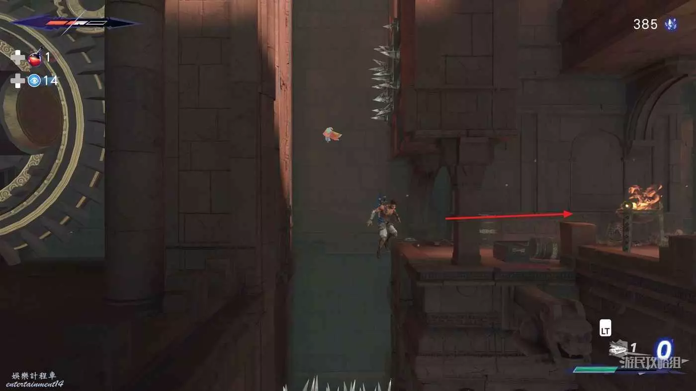 通過折返跳來到上方高台,當薩爾貢接觸到牆壁時會出現尖刺陷阱,所以不要在牆壁上長時間停留。