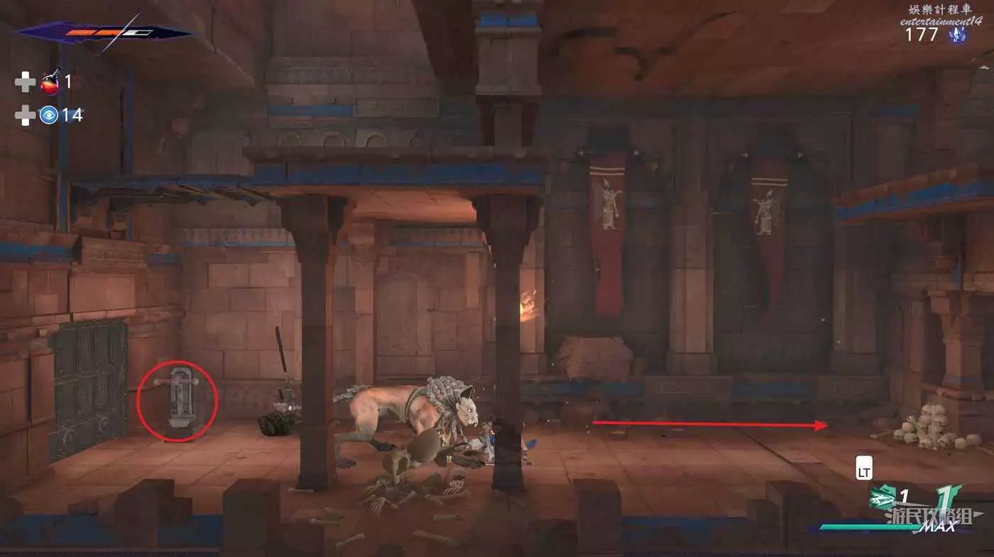 左門目前無法打開,攻擊右門旁邊的機關,進入右側區域。