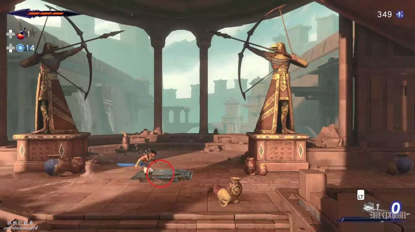 從此處我們得知了阿納希塔要帶王子前往西摩格之門,而想要追上他們需要攻擊上方的光球,此時涅伊特來到此處讓我們前往森林尋找射箭的美諾拉俄斯。