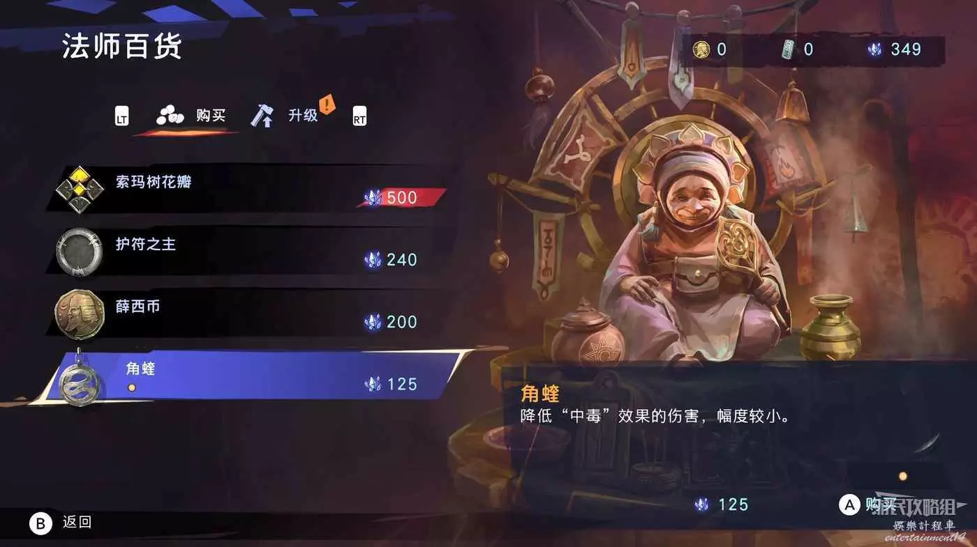 再次與之對話選擇購買進入商店頁面,此處可以購買護符【角蝰】,以及一個索瑪樹花瓣、護符之主、薛西幣。