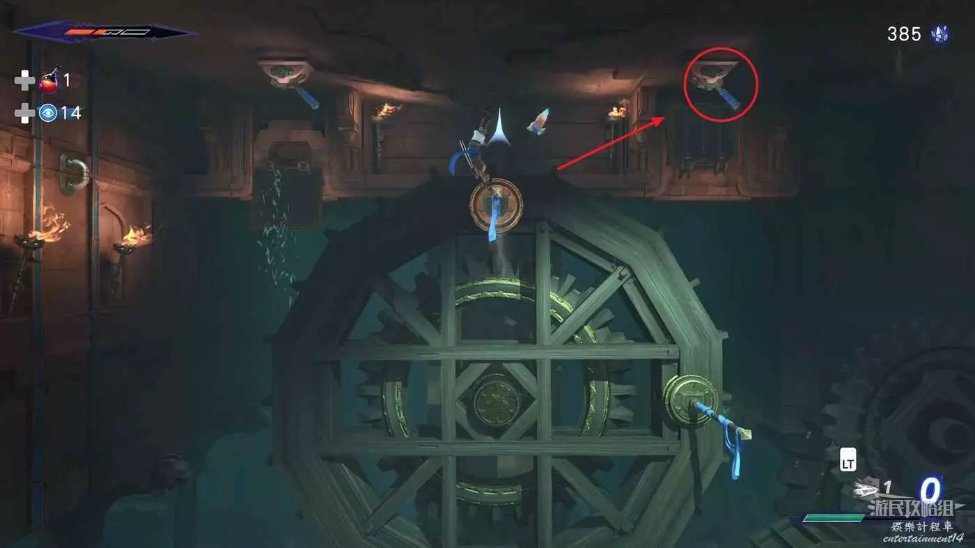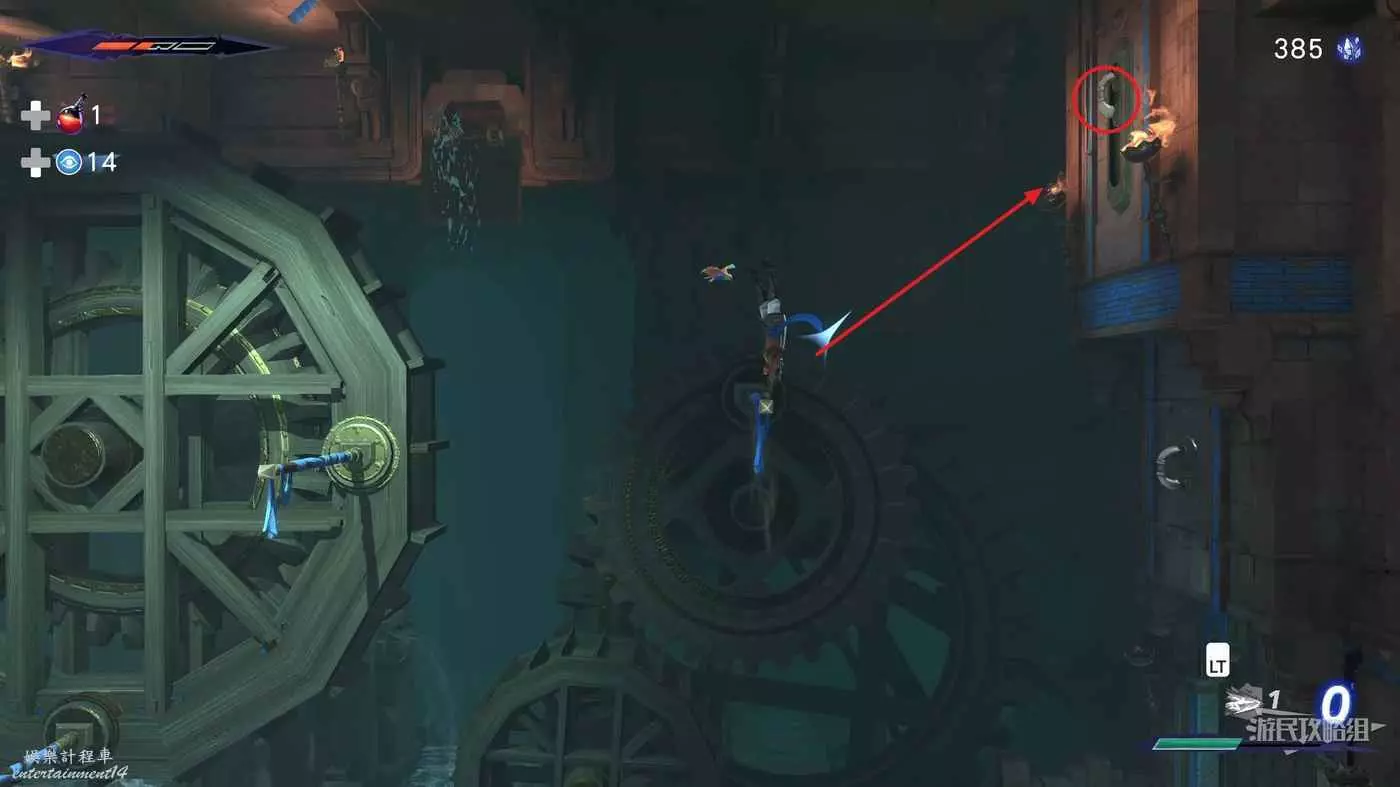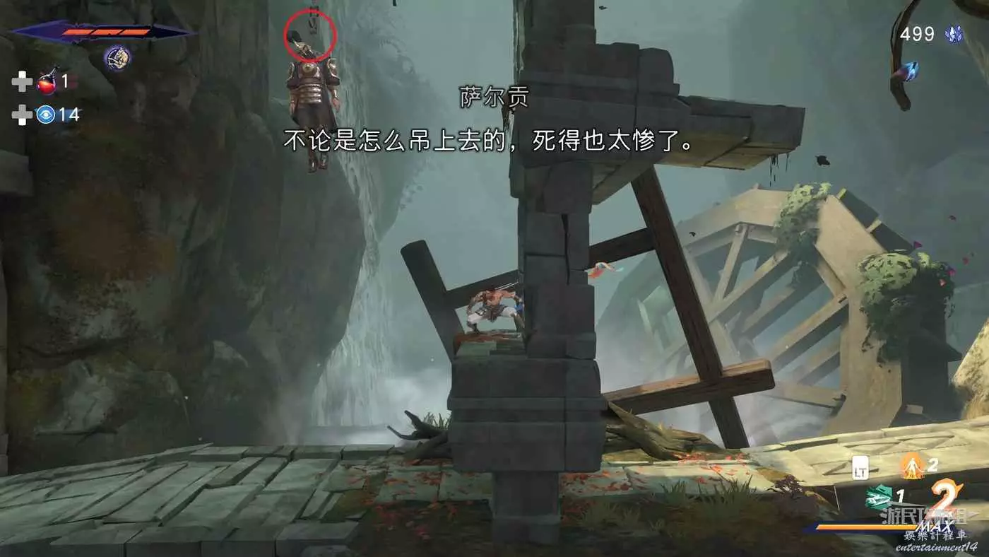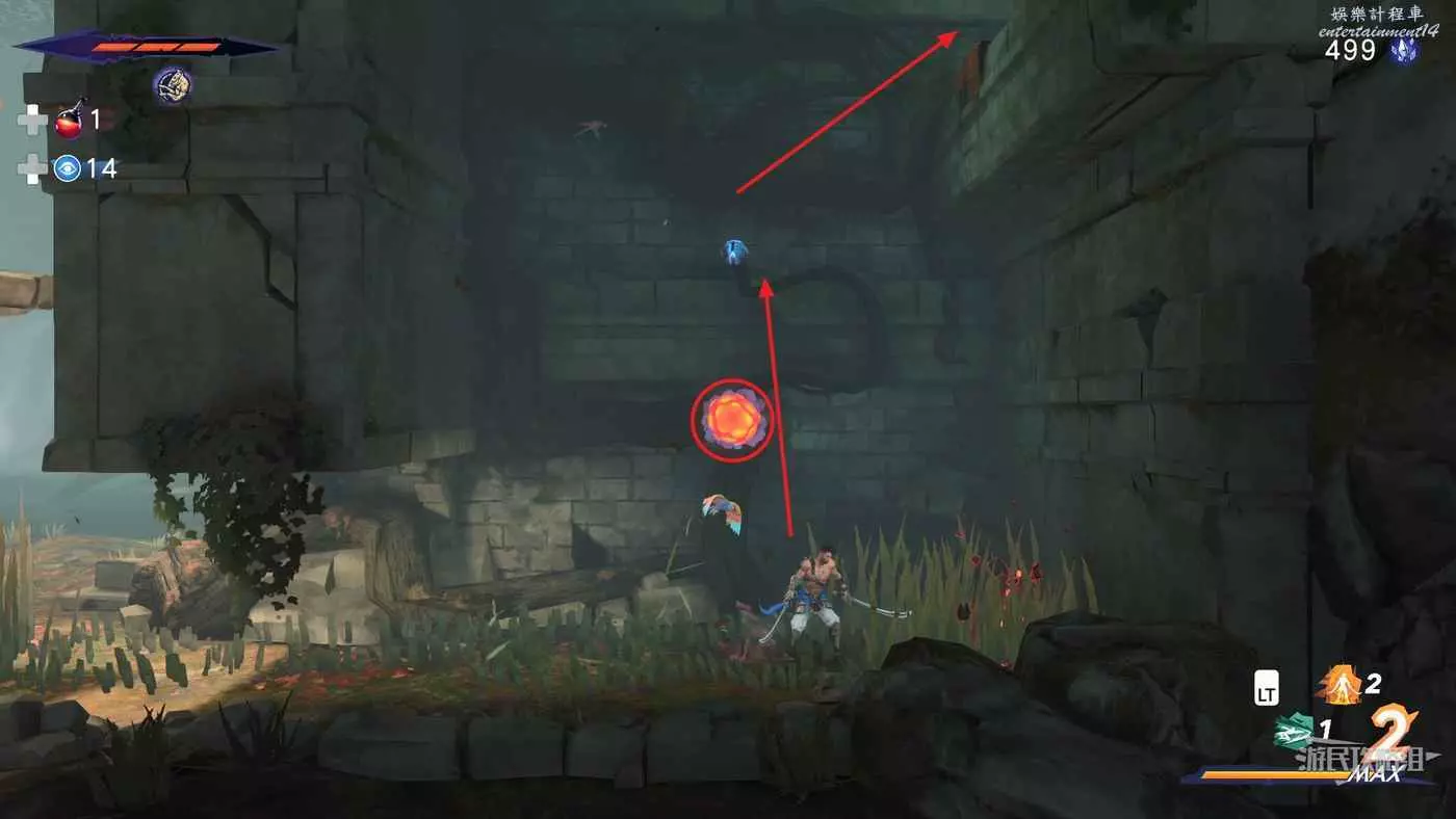 最底層的左邊有一個死亡的士兵,我們需要跳起來攻擊鎖鏈讓屍體掉到地面上,此處可以獲得物品【炮彈】。