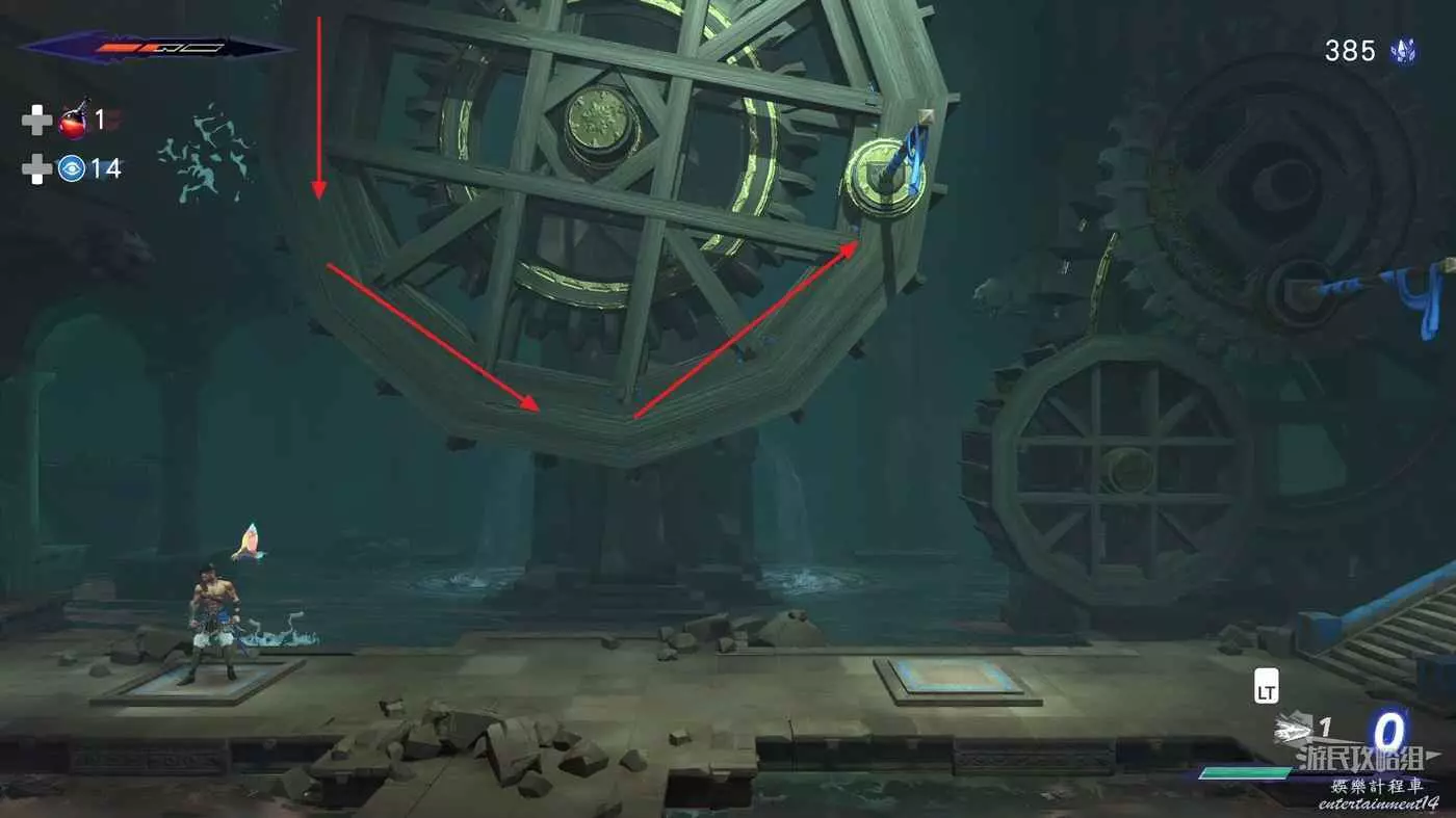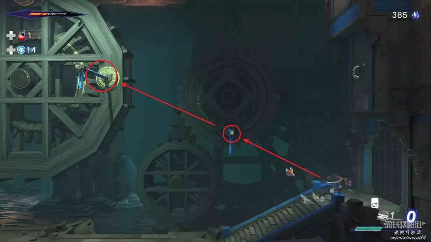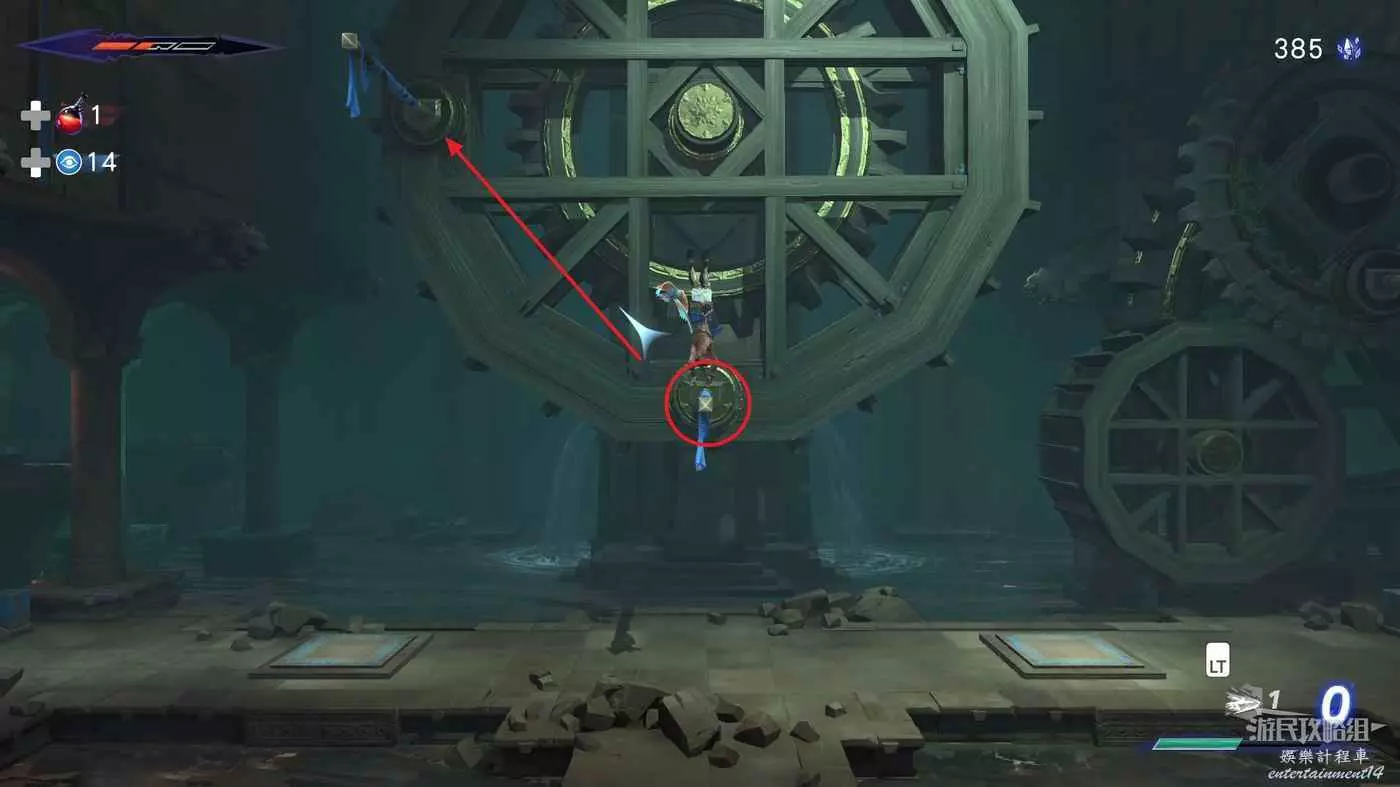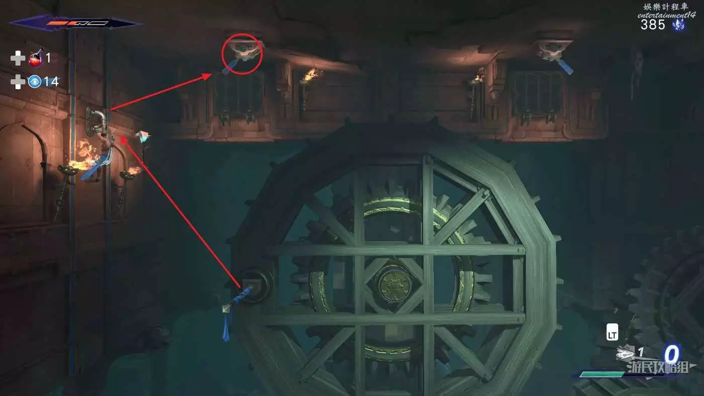 最底層的左邊有一個死亡的士兵,我們需要跳起來攻擊鎖鏈讓屍體掉到地面上,此處可以獲得物品【炮彈】。