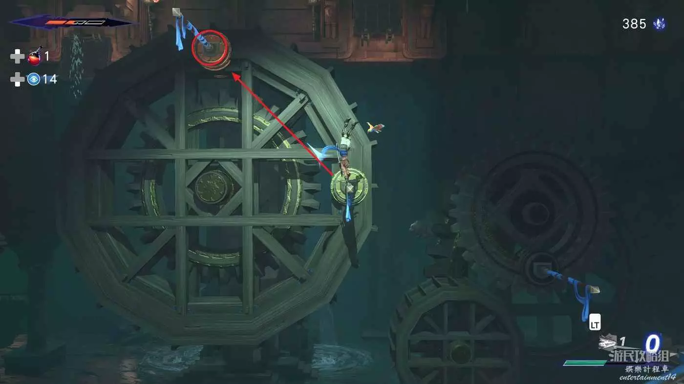 接著連跳到左牆的攀附杆上往右邊跳攻擊下圖所示的機關。