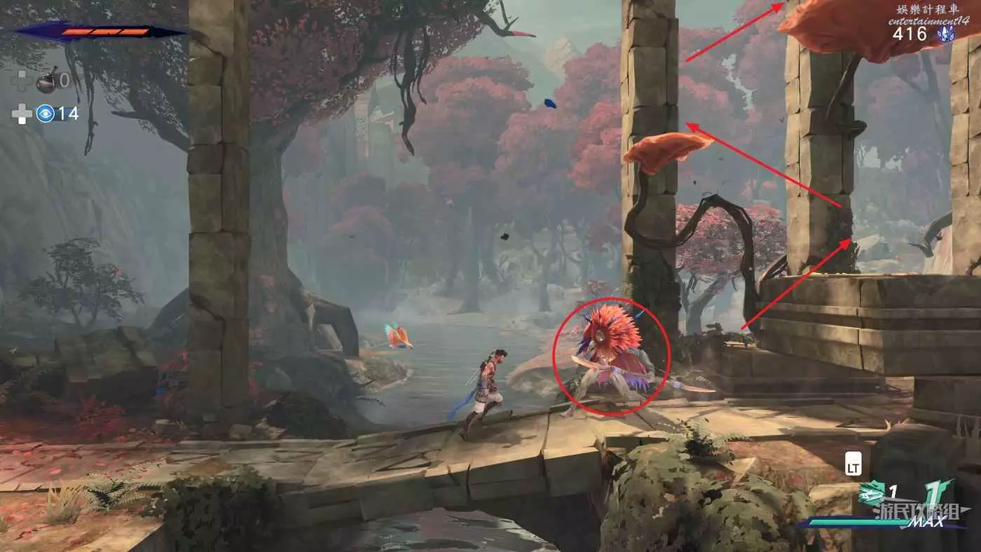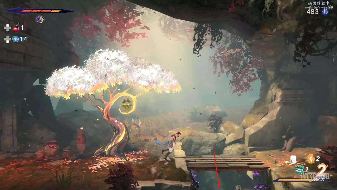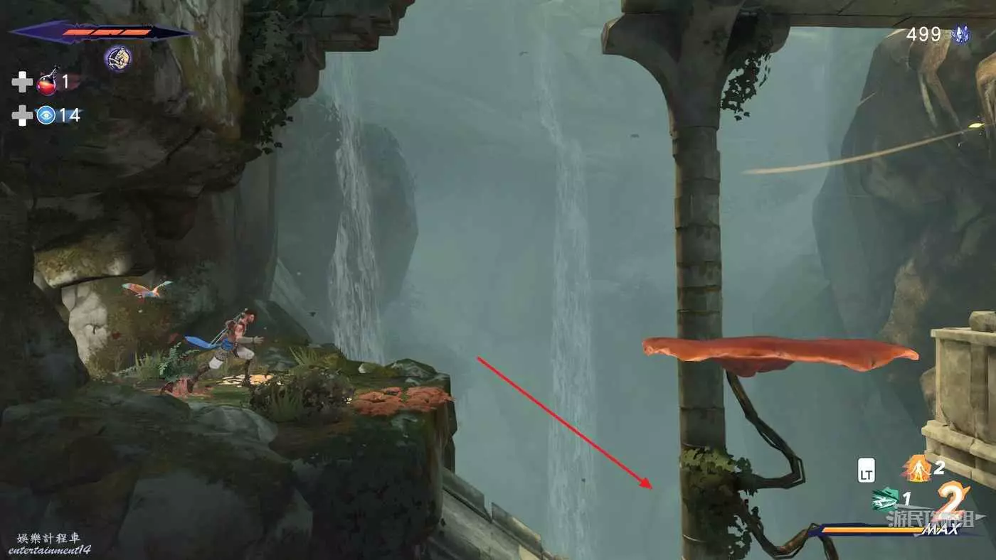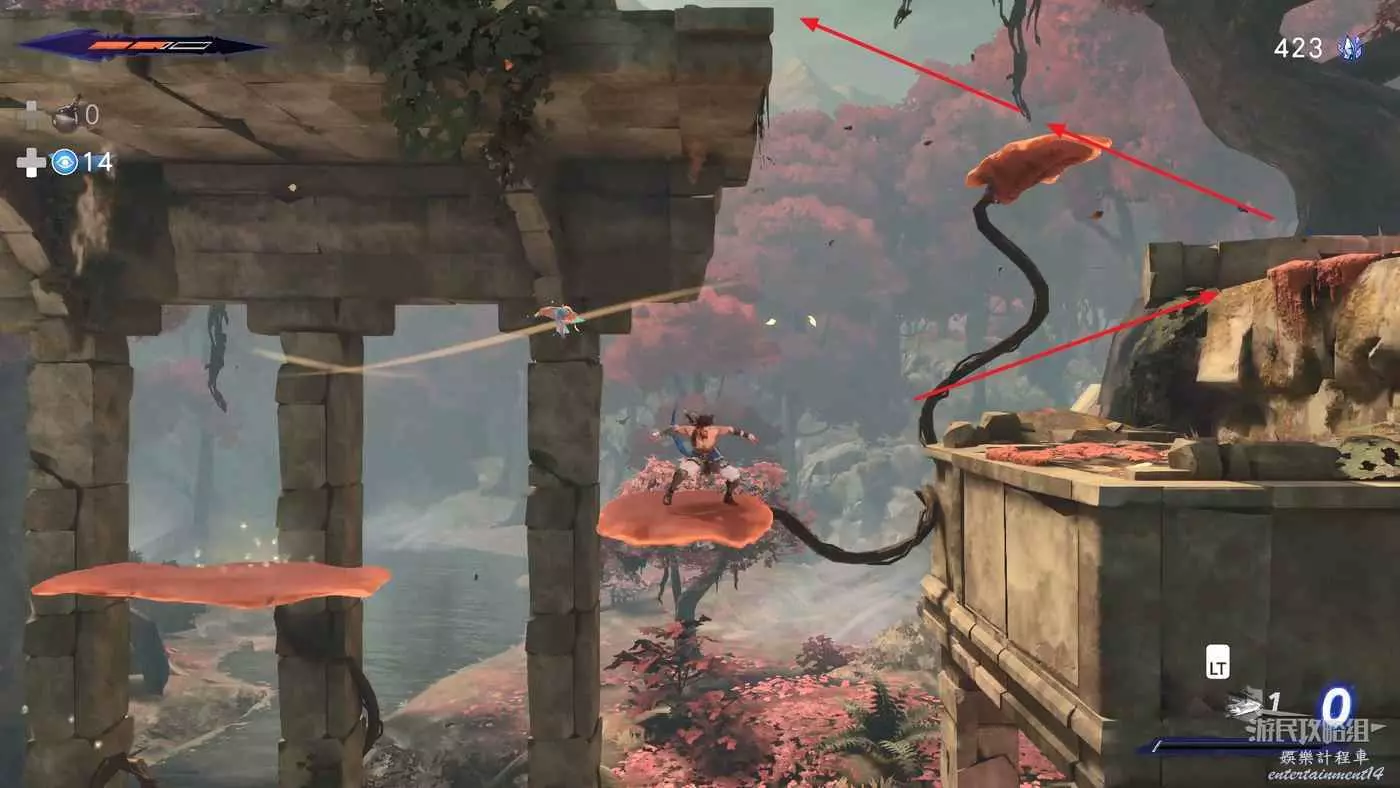 此處需要攻擊下面的孢子,當孢子爆炸時相藍色花蕾便會出現一個可以暫時站立的樹葉,我們通過樹葉跳到高台。