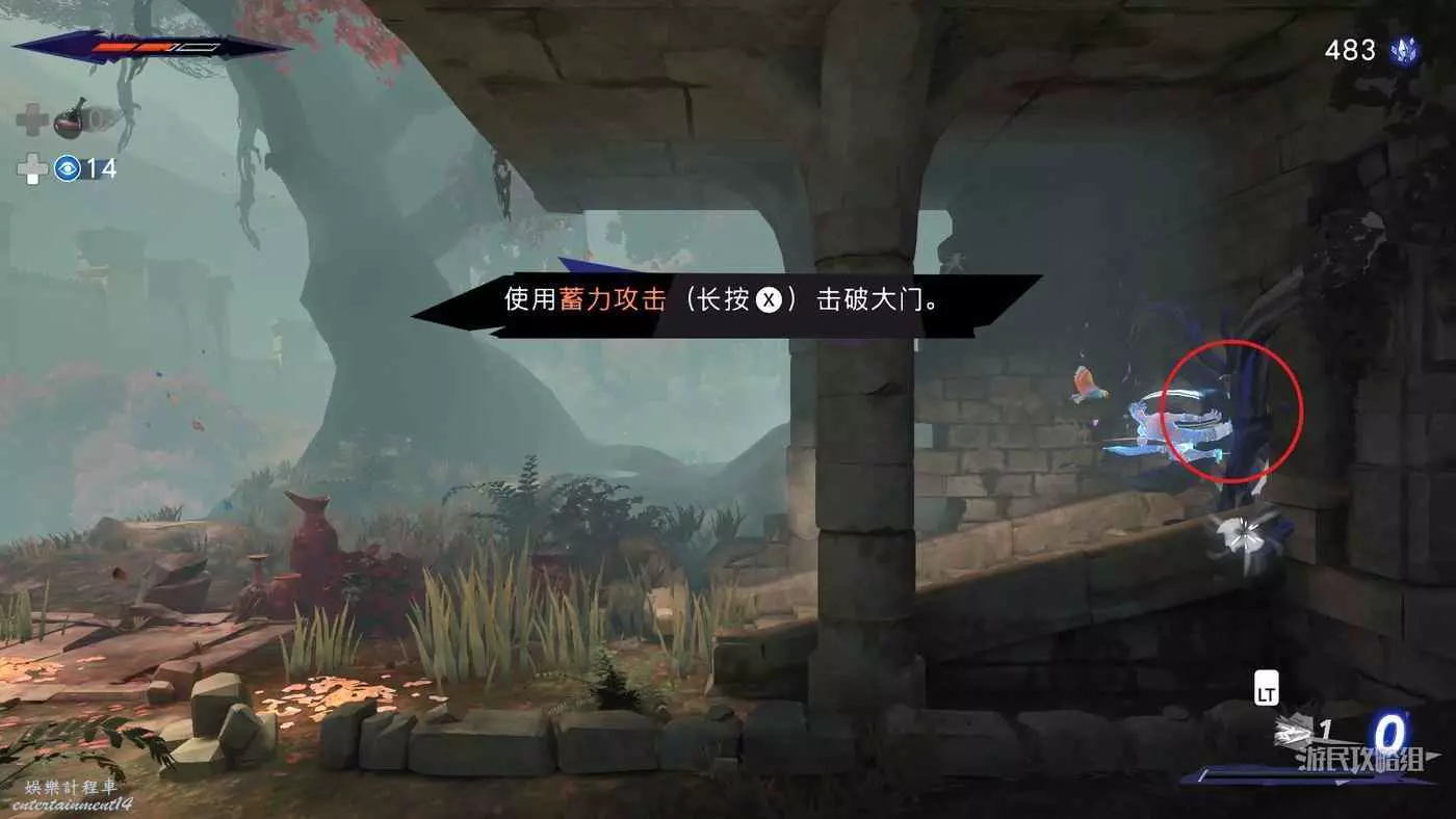 當入口被藤蔓纏住時只能長按攻擊鍵使用蓄力攻擊將其破壞。