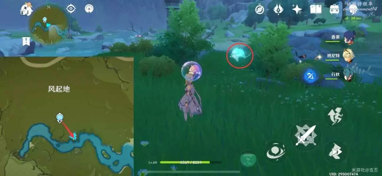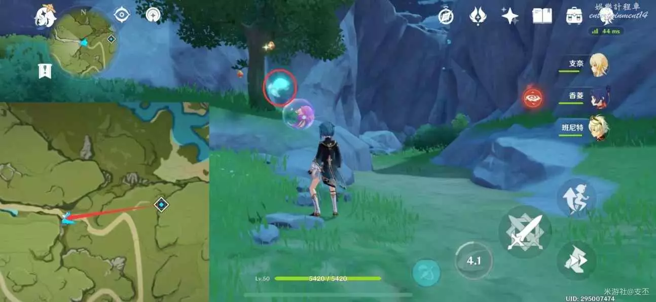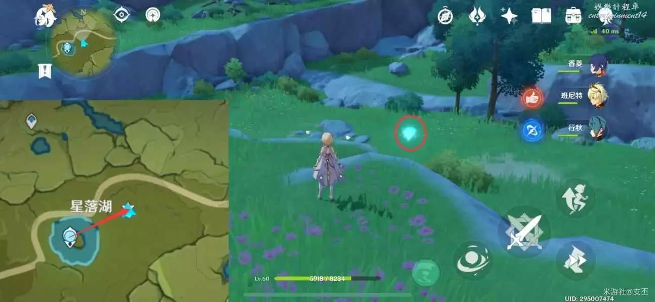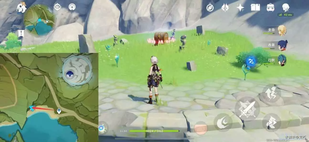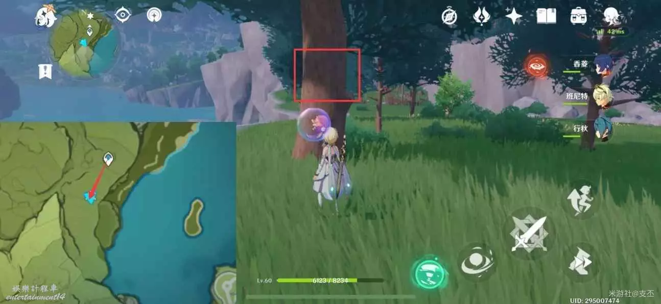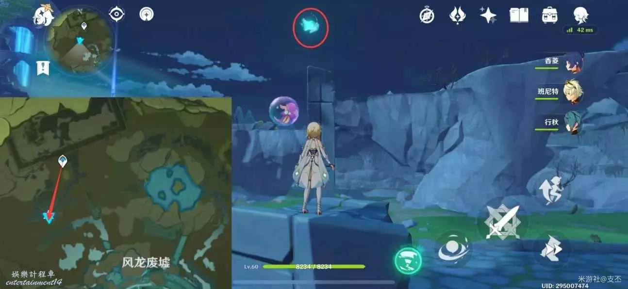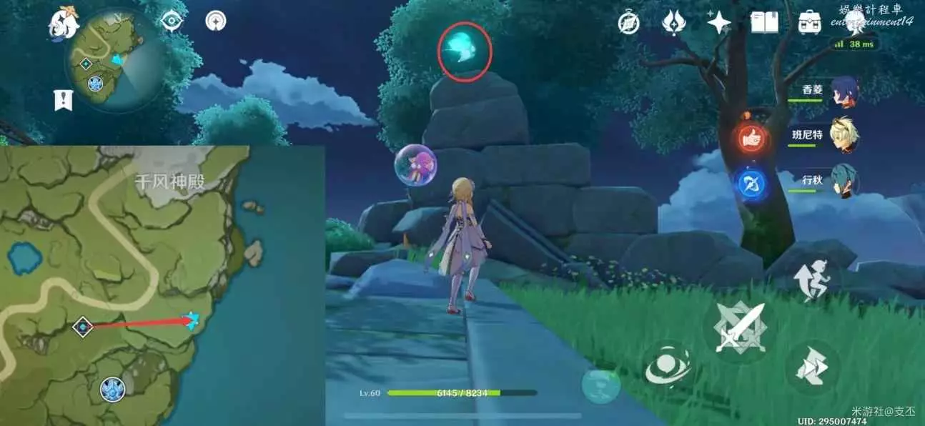 仙靈在寶箱左邊湖面平台上,一路跟隨、歸位