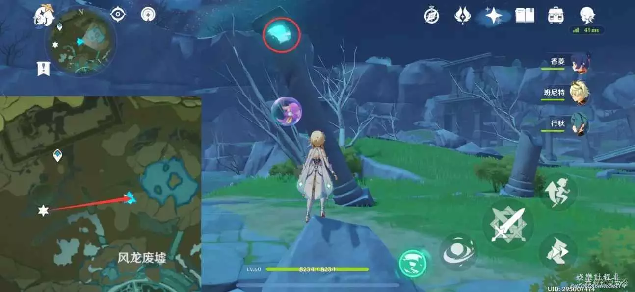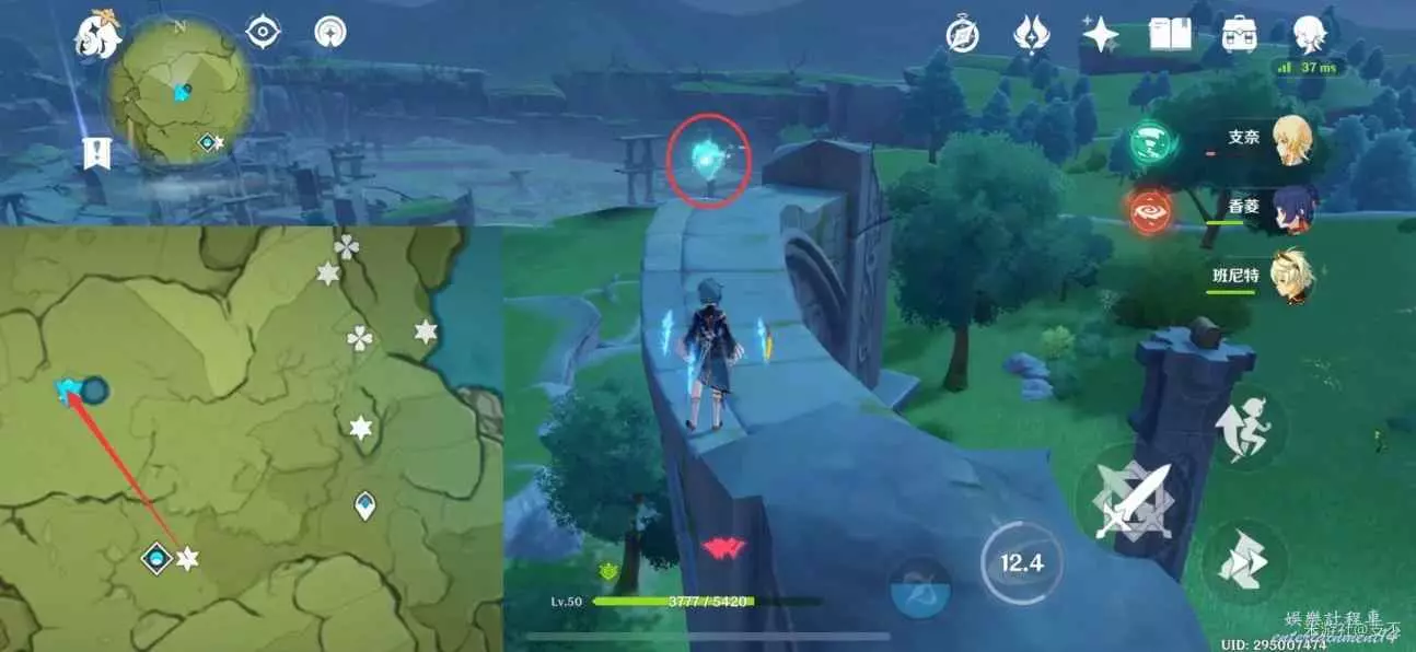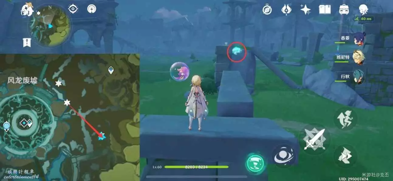 乘風場飛上平台,仙靈在石牆後,跟隨仙靈歸位,獲得精緻寶箱(2原石)