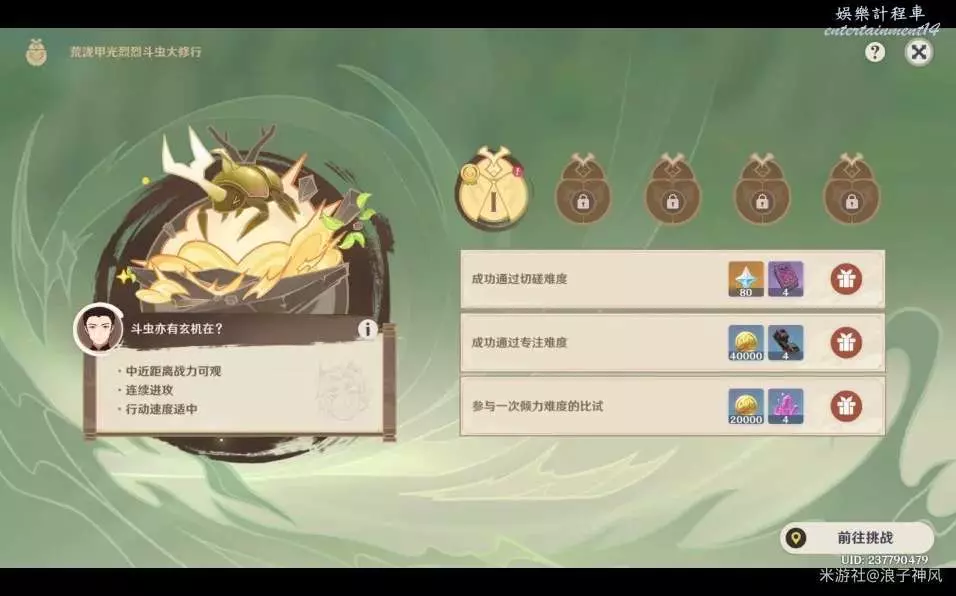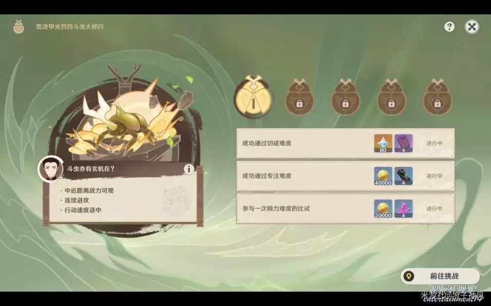 ·每關鬥蟲挑戰均有「切磋」、「專注」、「傾力」3個難度。挑戰開啟後,「切磋」和「專注」難度會解鎖。成功挑戰「專注」難度後才可解鎖「傾力」難度。