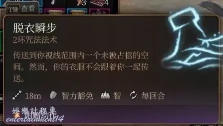 傳送到你視線範圍內一個未被佔據的空間。然而,你的衣服不會跟著你一起傳送。