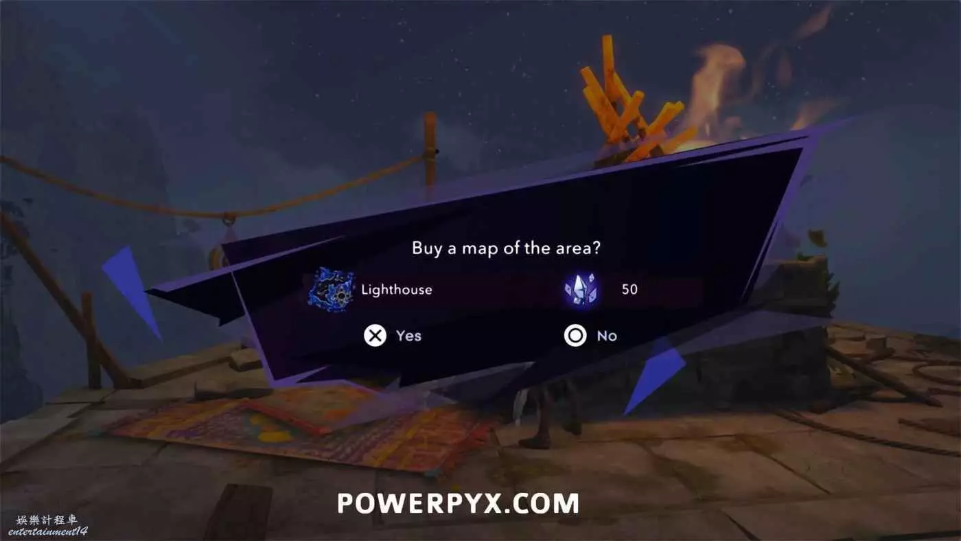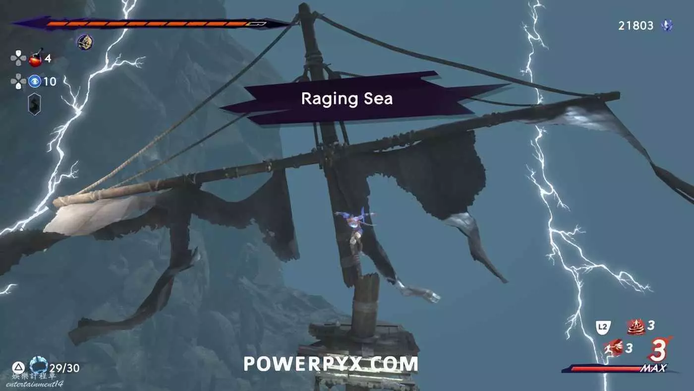 到達燈塔區域,前進到平台頂部可以購買該區域地圖,然後從右邊往下跳,直到最終落在船的桅杆上(初次到達會解鎖【海之幽靈】獎盃或成就),到達怒海區域。
