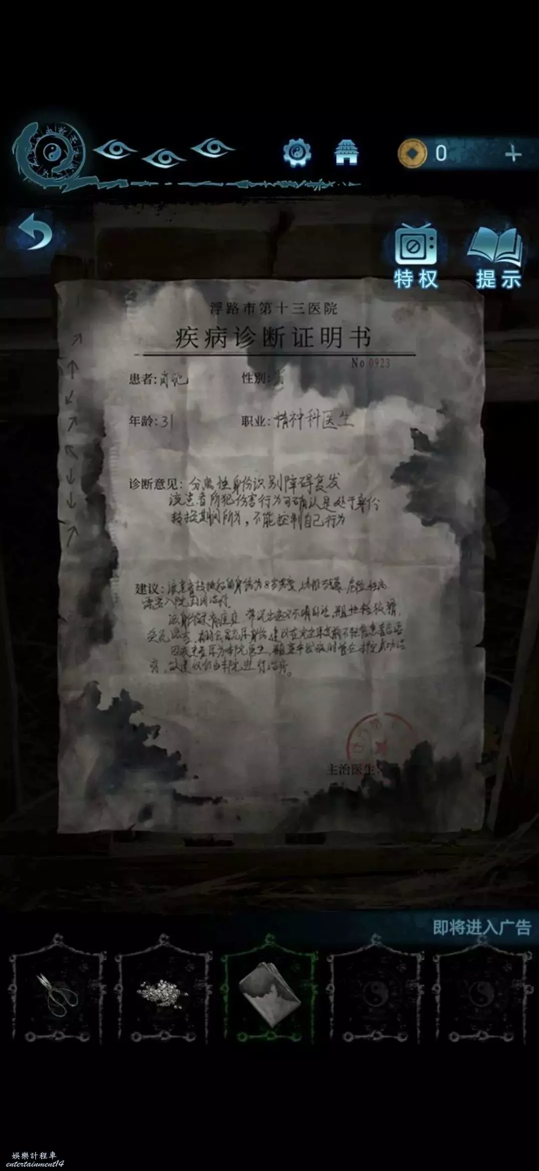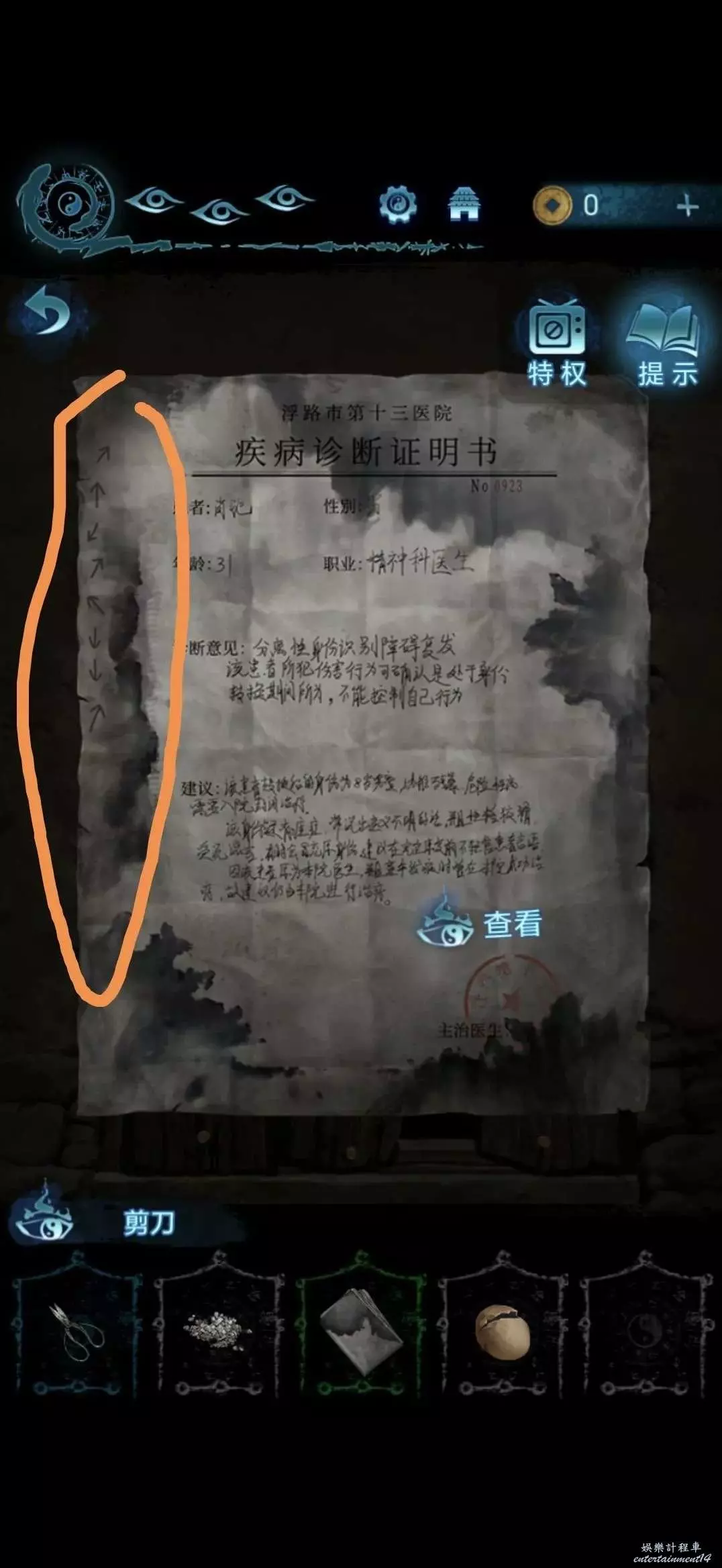 根據診斷證明左側的順序,用剪刀晃動視窗木板上的釘子,木板掉落,可以進肖醫生的家