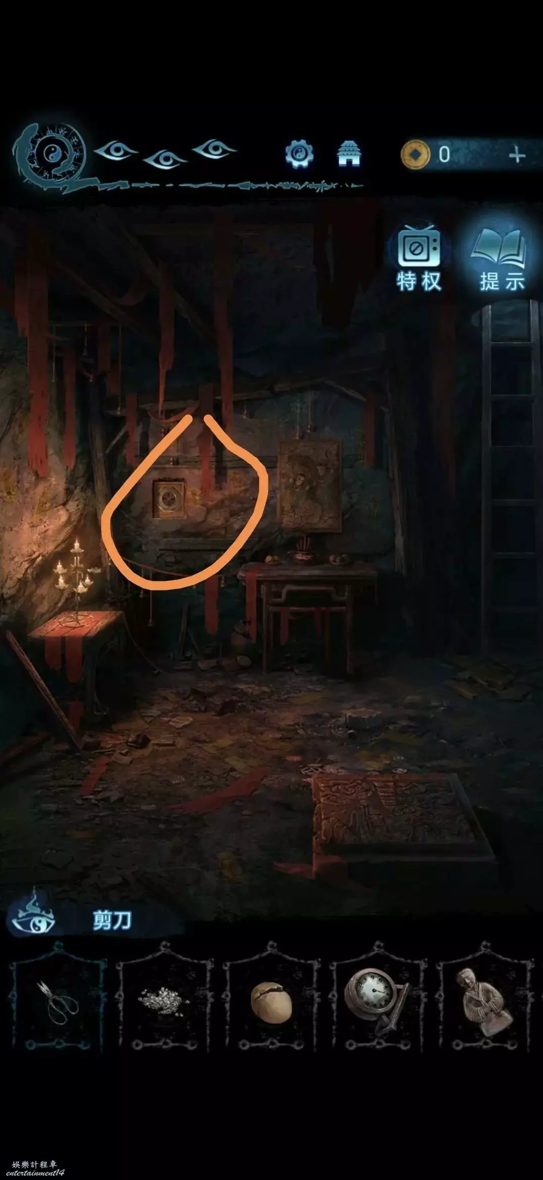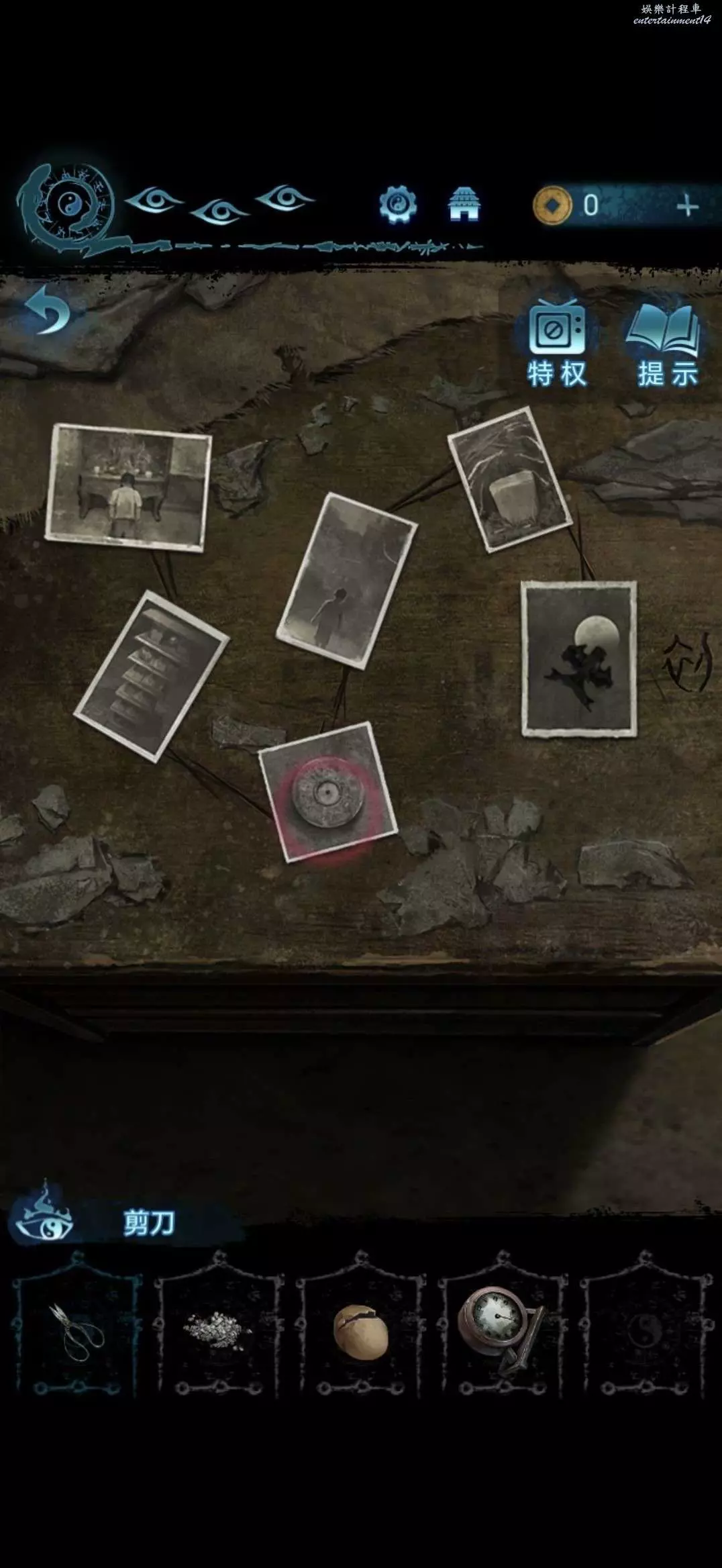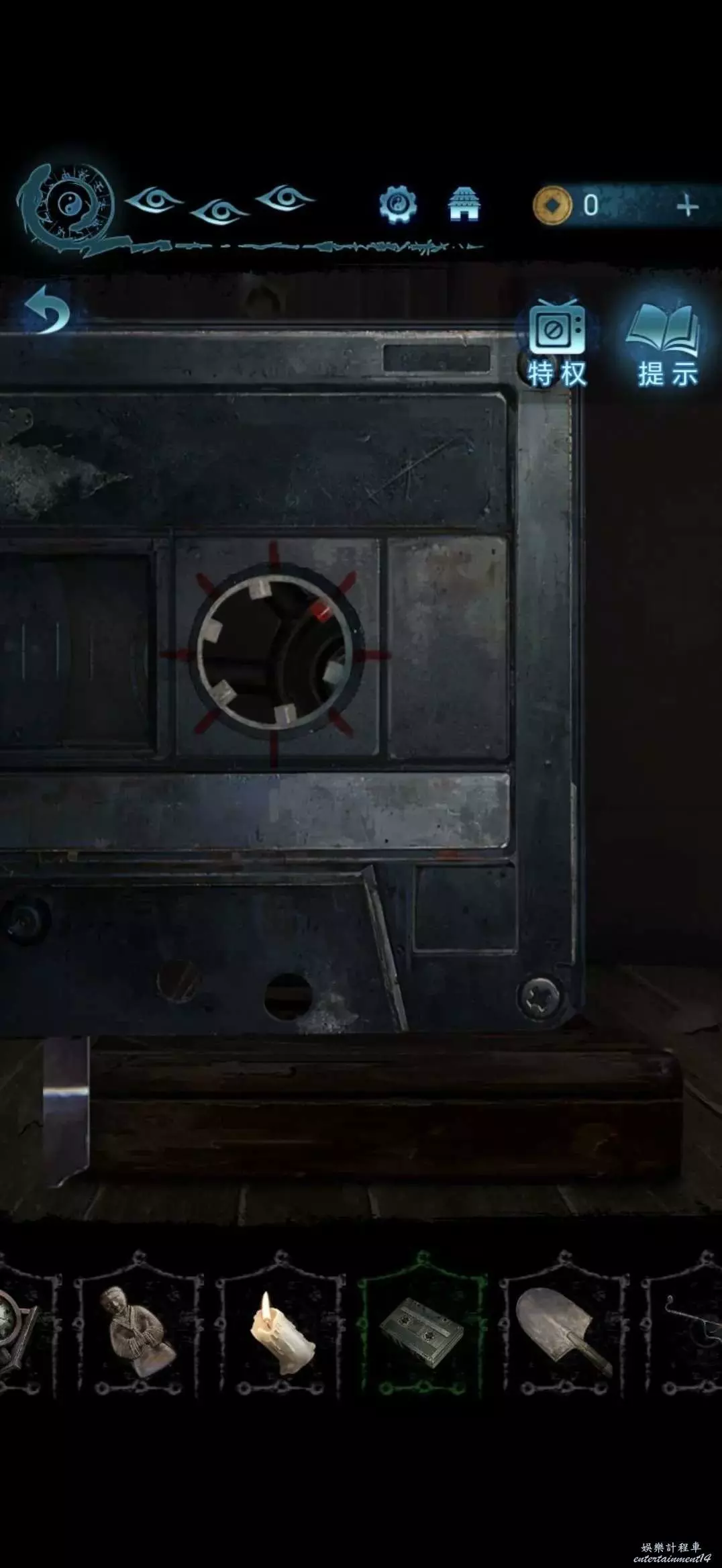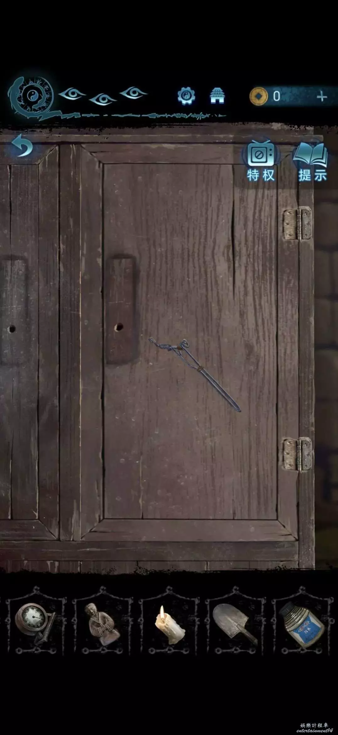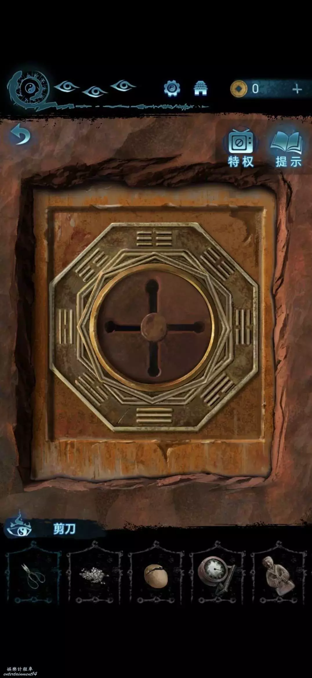 進入肖家地下的房間,把剪刀插進牆上的機關裡,獲得圓盤