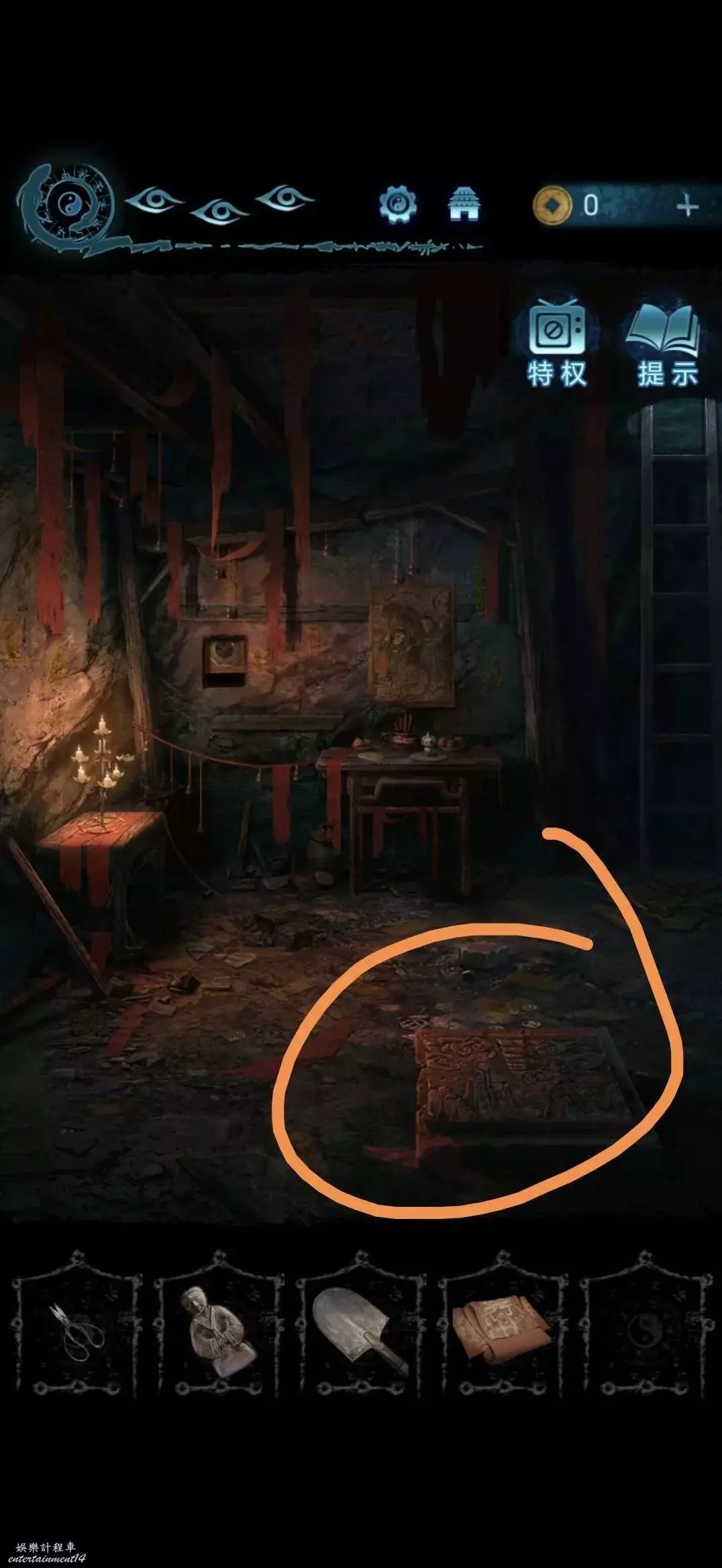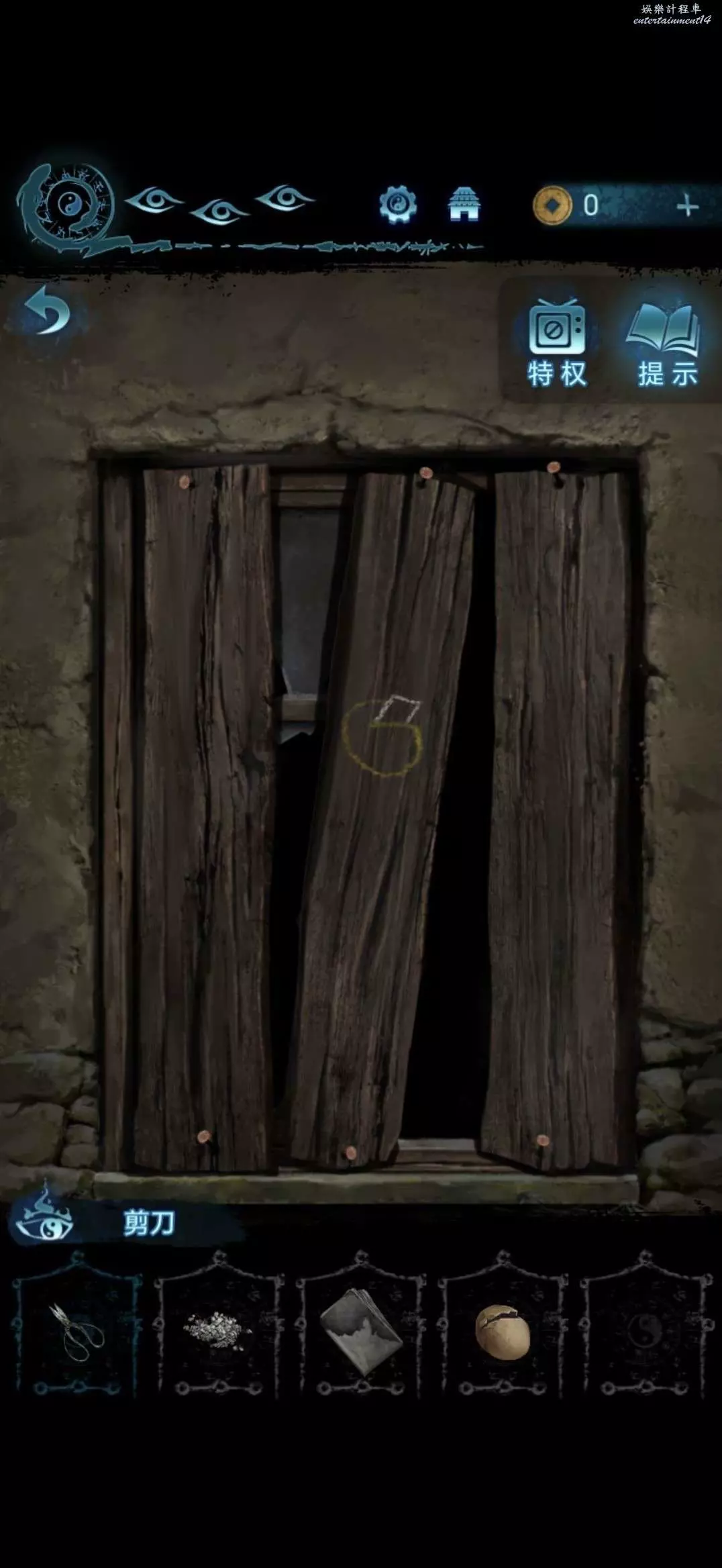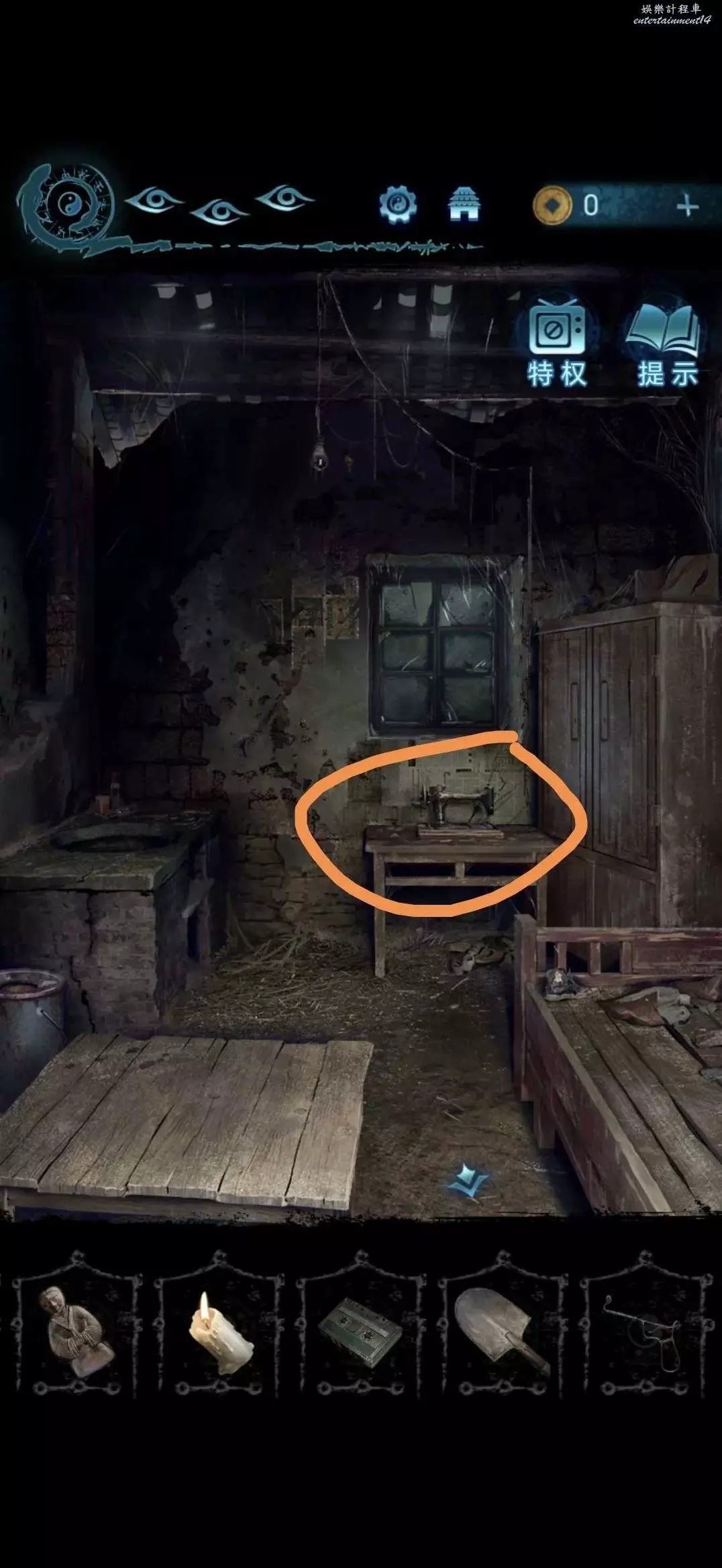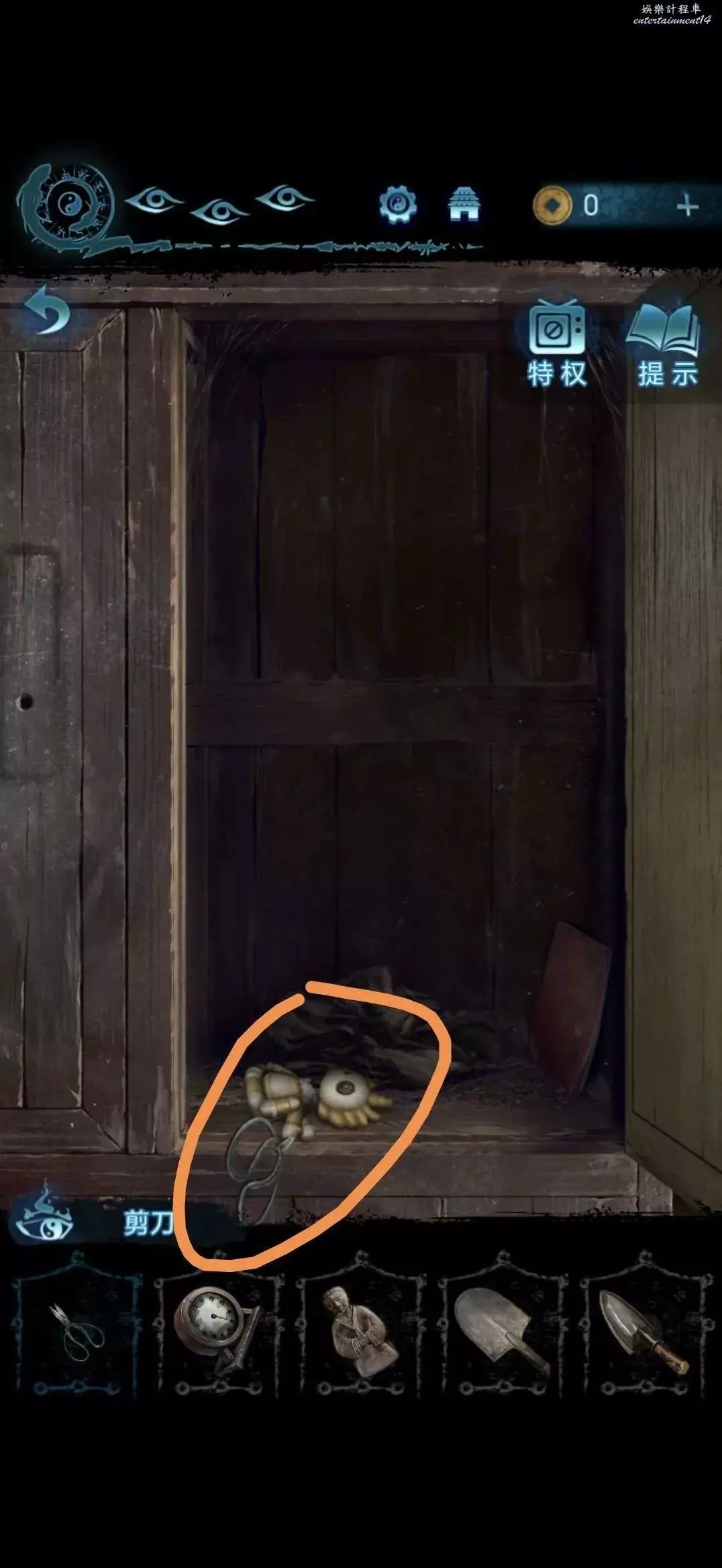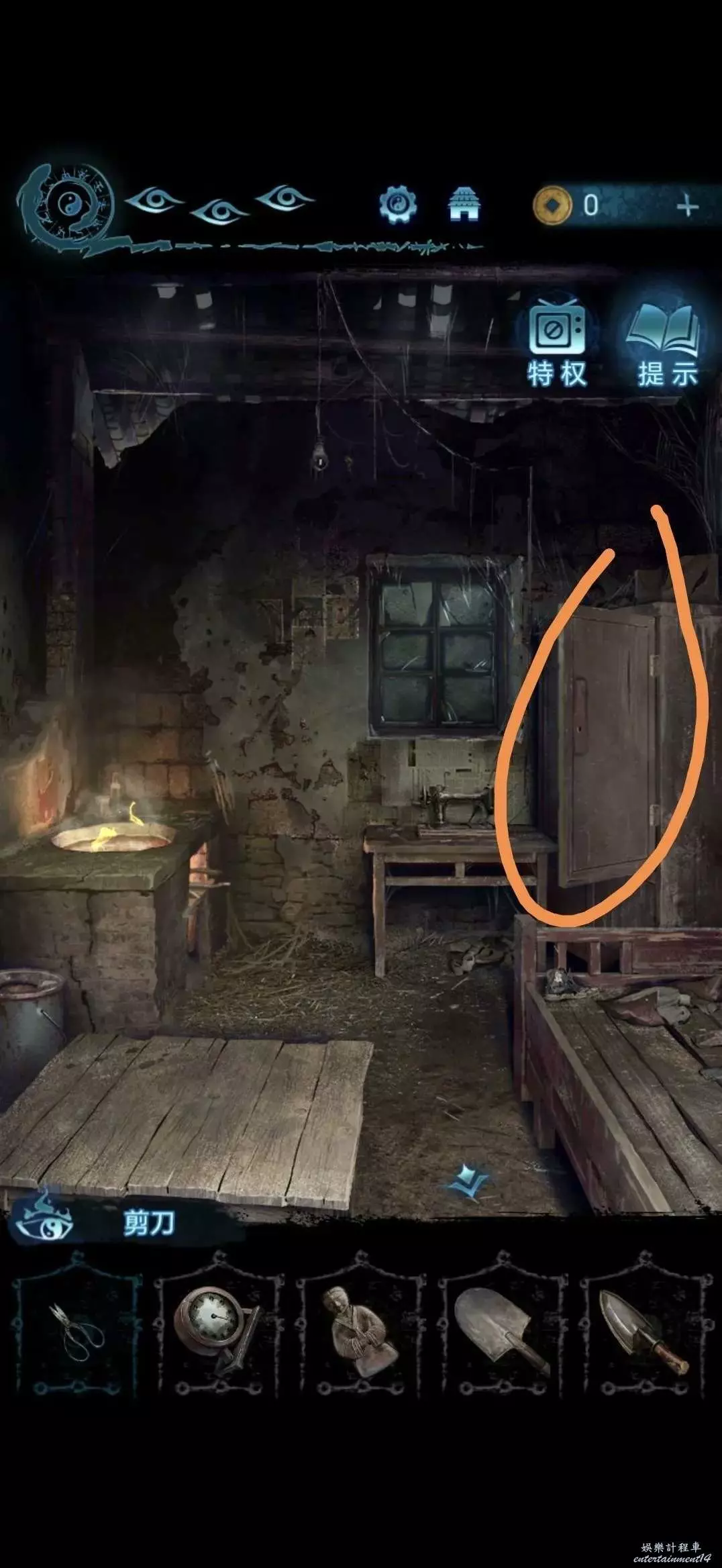 進入肖家地下的房間,把剪刀插進牆上的機關裡,獲得圓盤