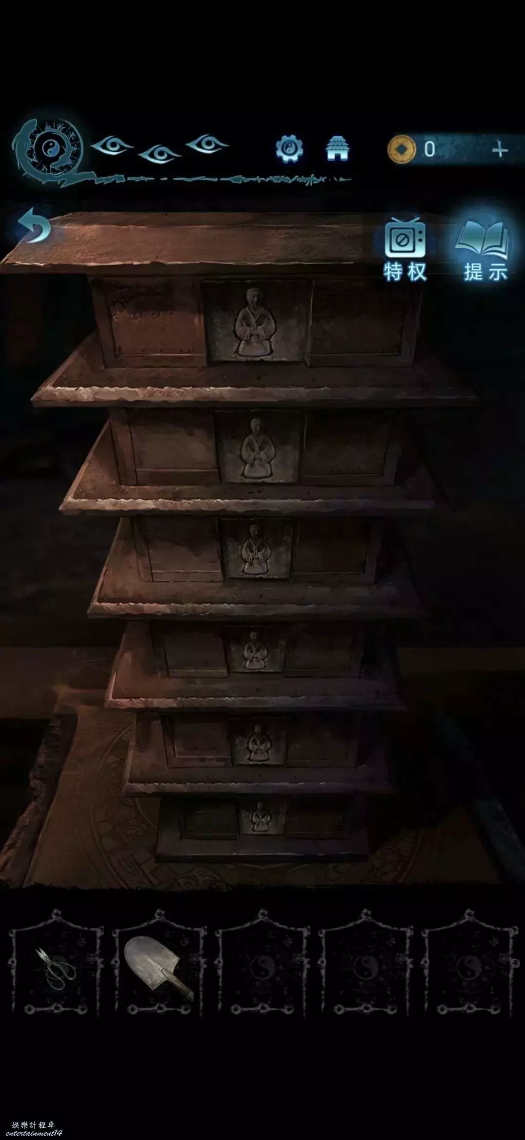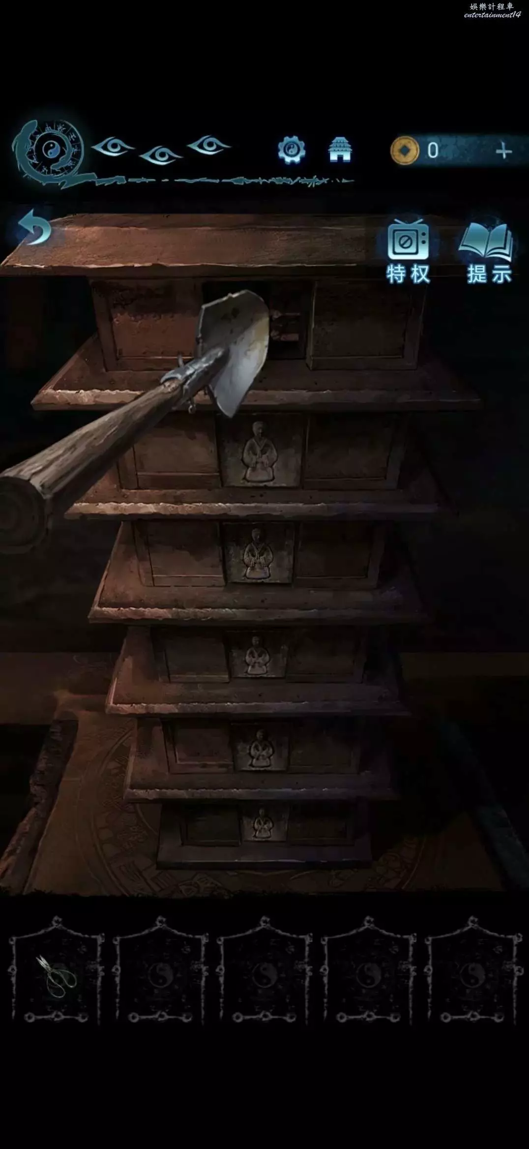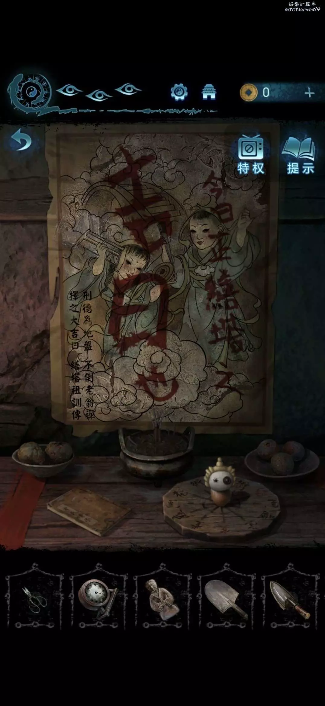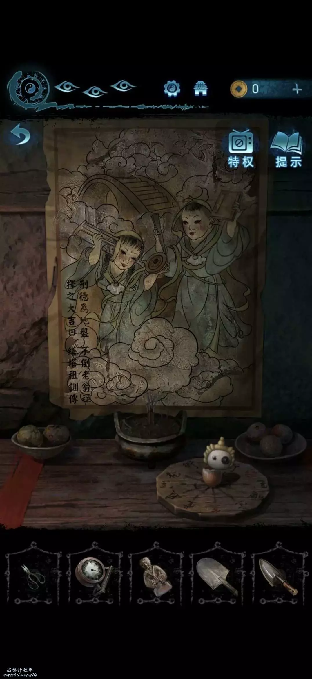 將帛畫放在肖家地下的石桌上,將銅人安放在長出來的佛塔上,做小遊戲,讓每一層都有小人,做完用鐵鍬撥弄卡住的機關,撥完獲得八卦鏡