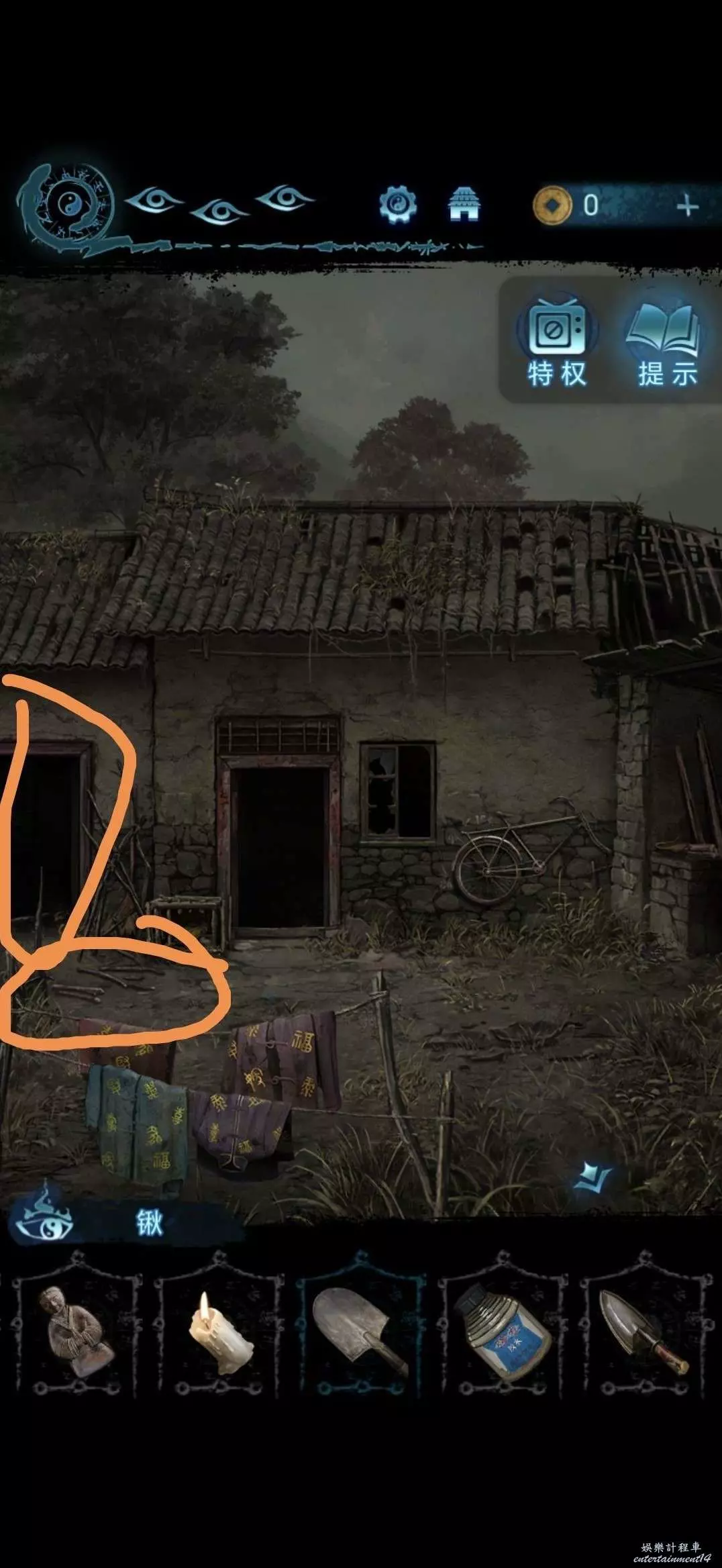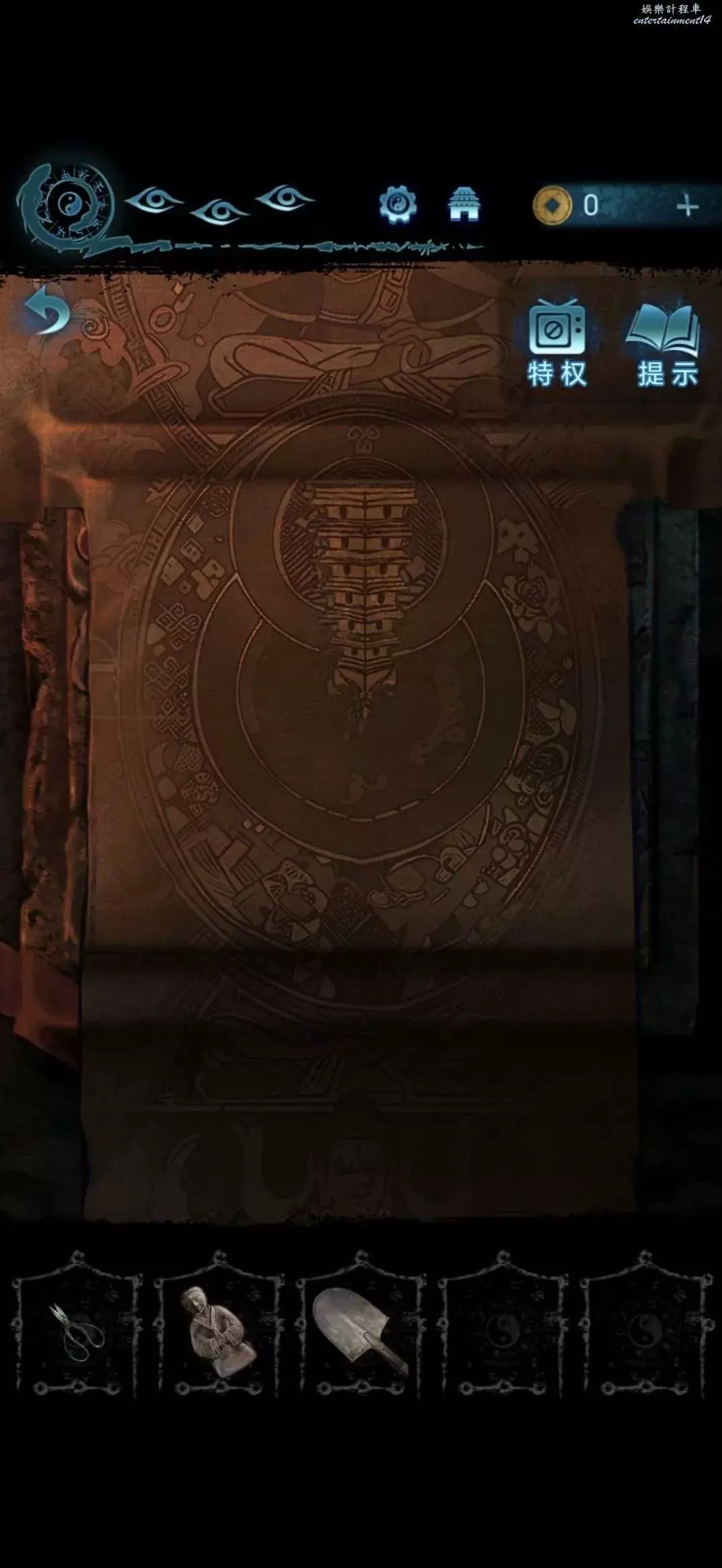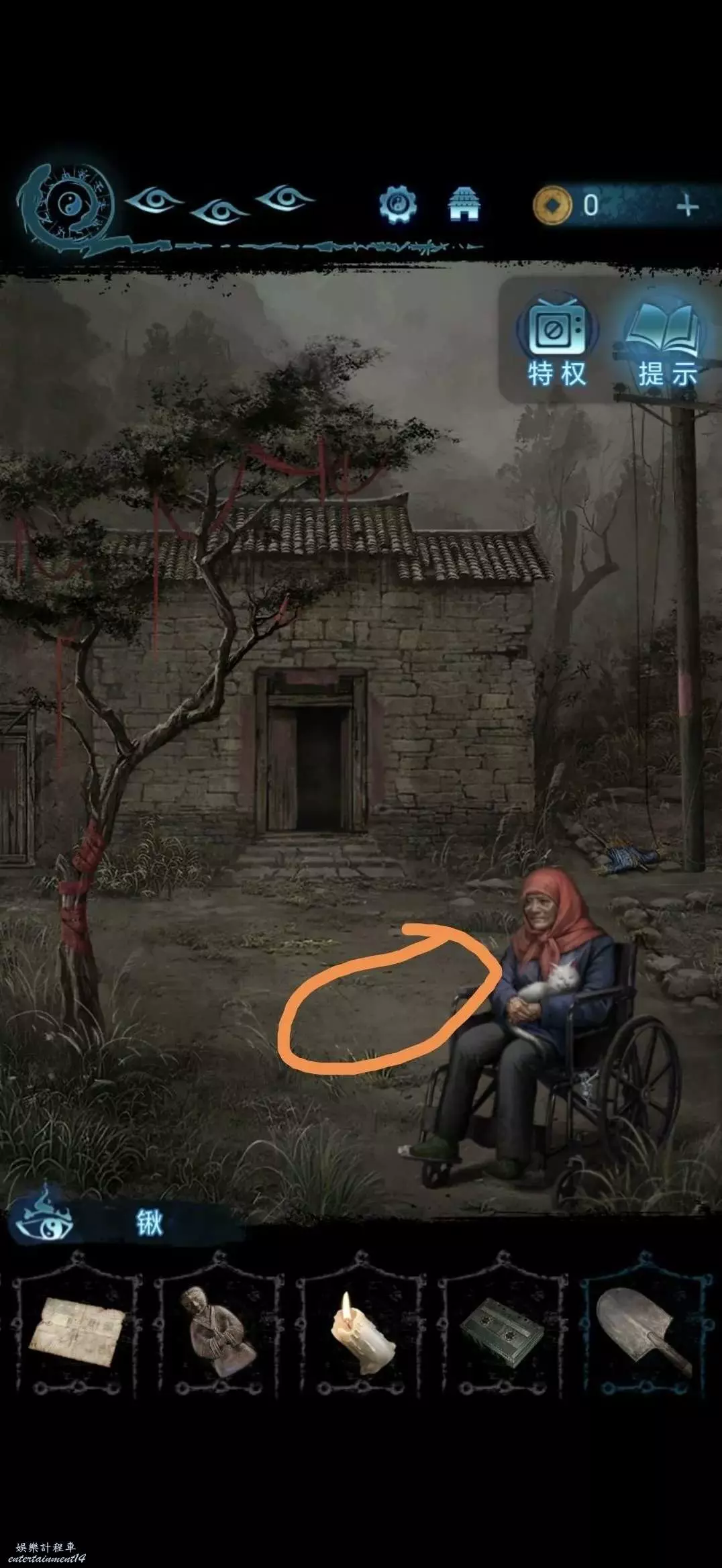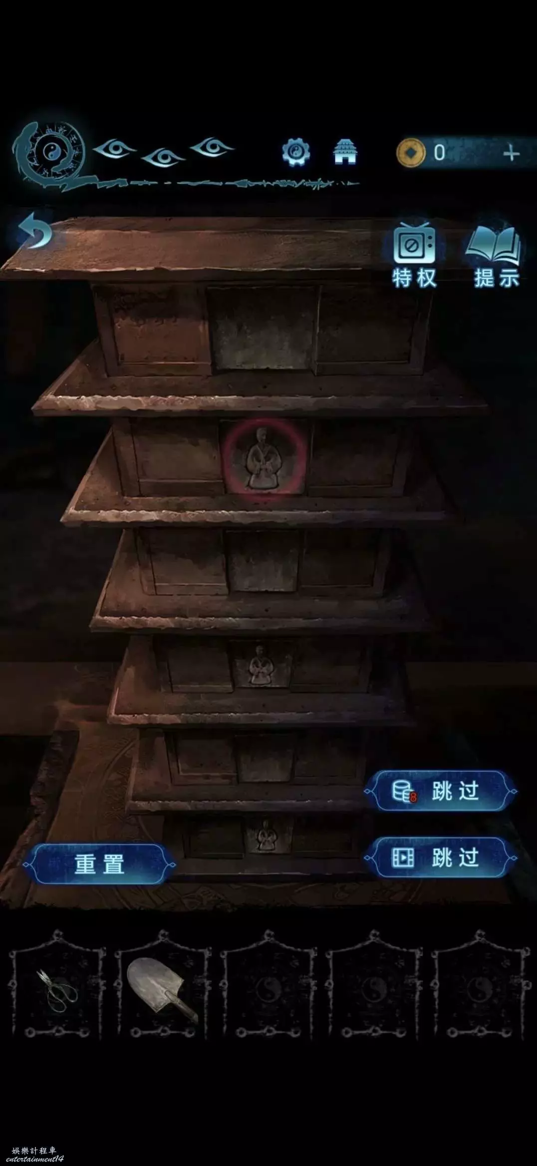 將帛畫放在肖家地下的石桌上,將銅人安放在長出來的佛塔上,做小遊戲,讓每一層都有小人,做完用鐵鍬撥弄卡住的機關,撥完獲得八卦鏡
